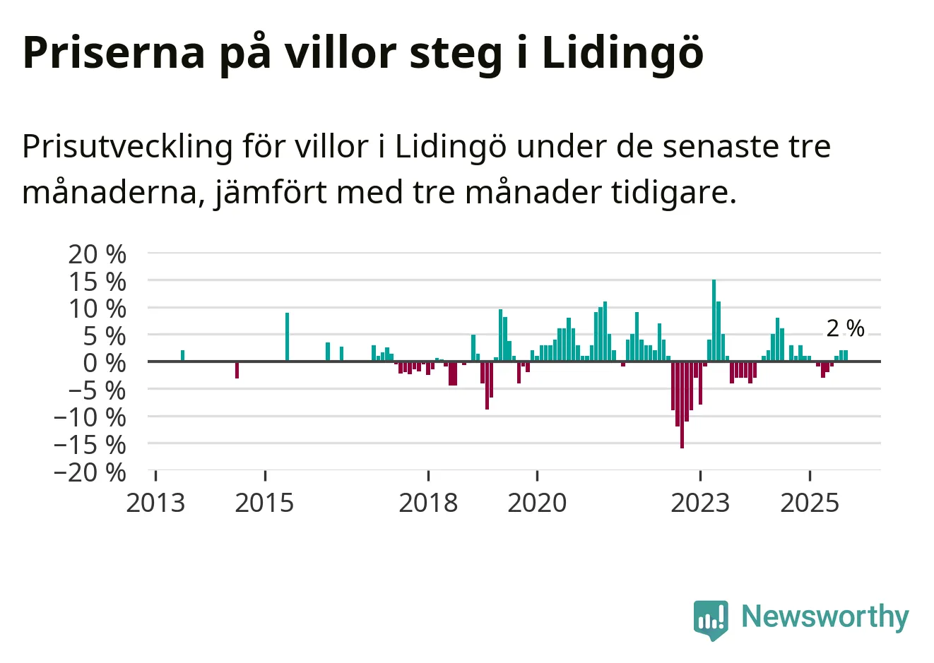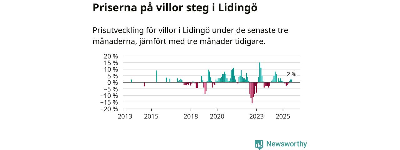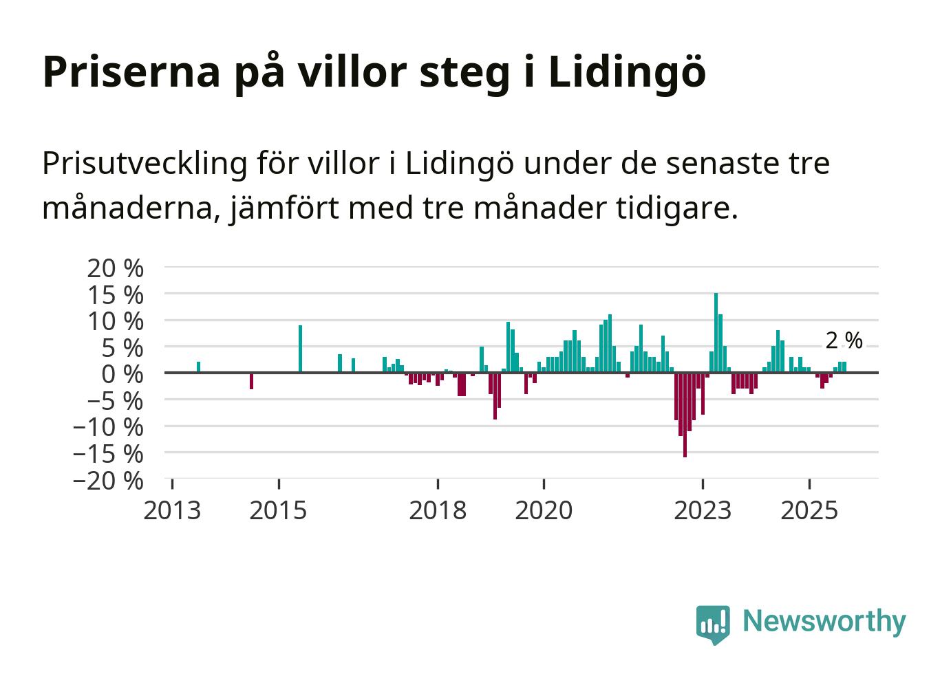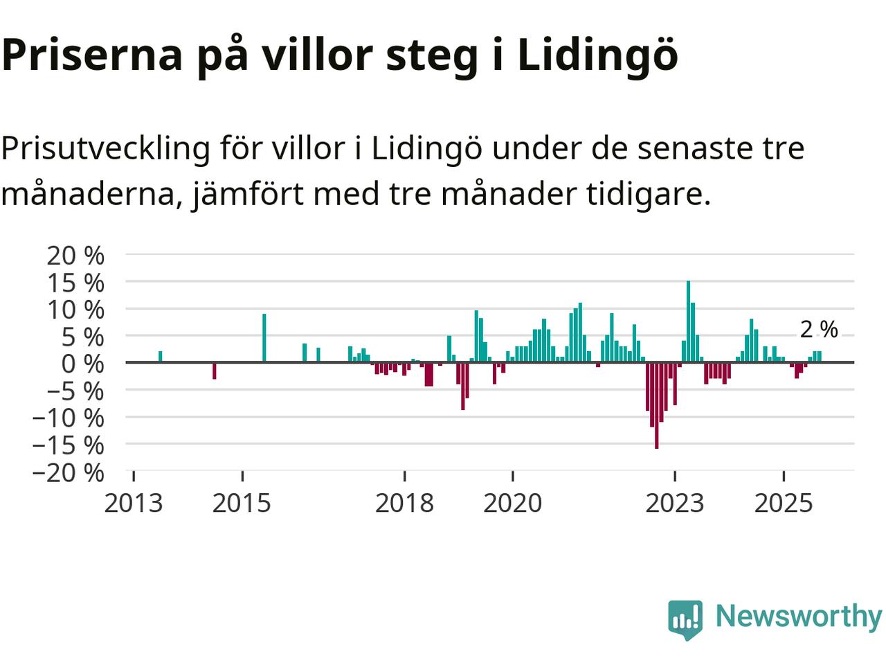 Villapriserna har gått upp i Lidingö kommun. Medelpriset på försäljningarna under de senaste tre månaderna visar på en uppgång med 2 procent.