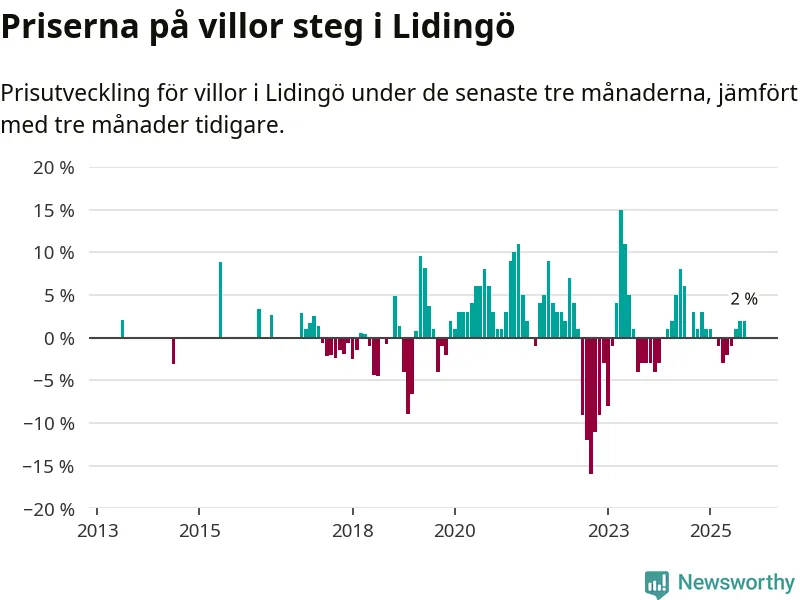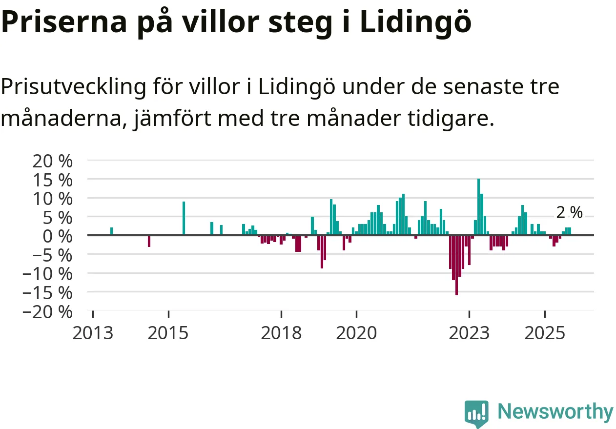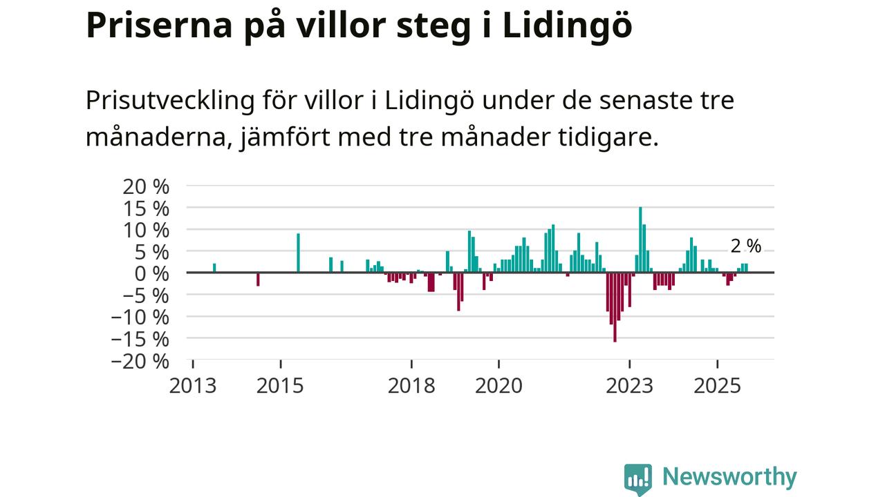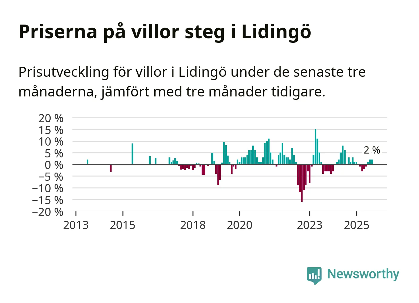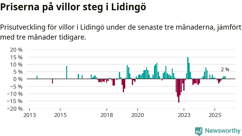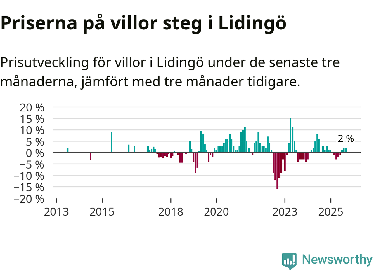 Villapriserna har gått upp i Lidingö kommun. Medelpriset på försäljningarna under de senaste tre månaderna visar på en uppgång med 2 procent.