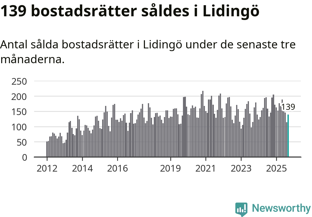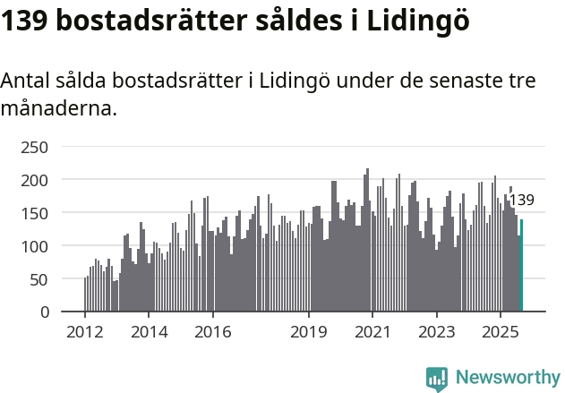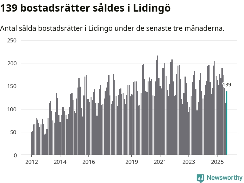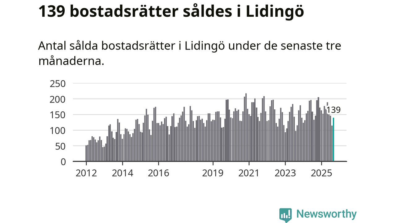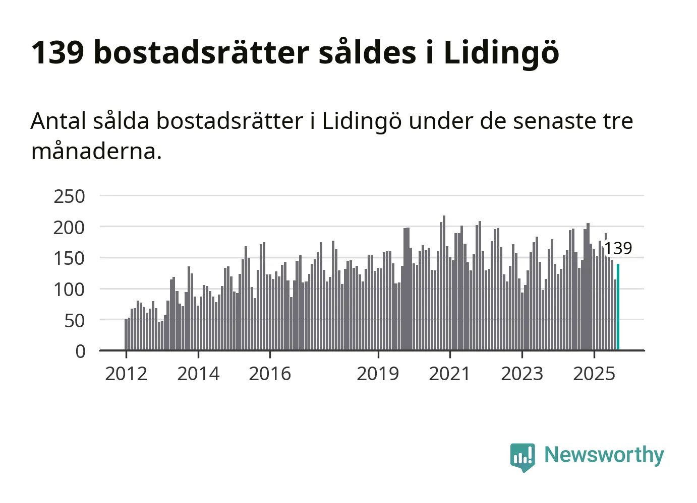 Sammanlagt såldes 139 bostadsrätter i Lidingö kommun mellan juli och september till ett genomsnittligt pris på 5,0 miljoner kronor. I fjol gjordes 146 affärer vid den här tiden på året.