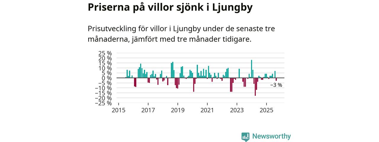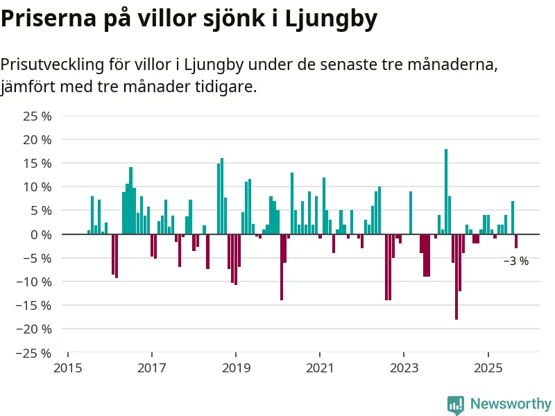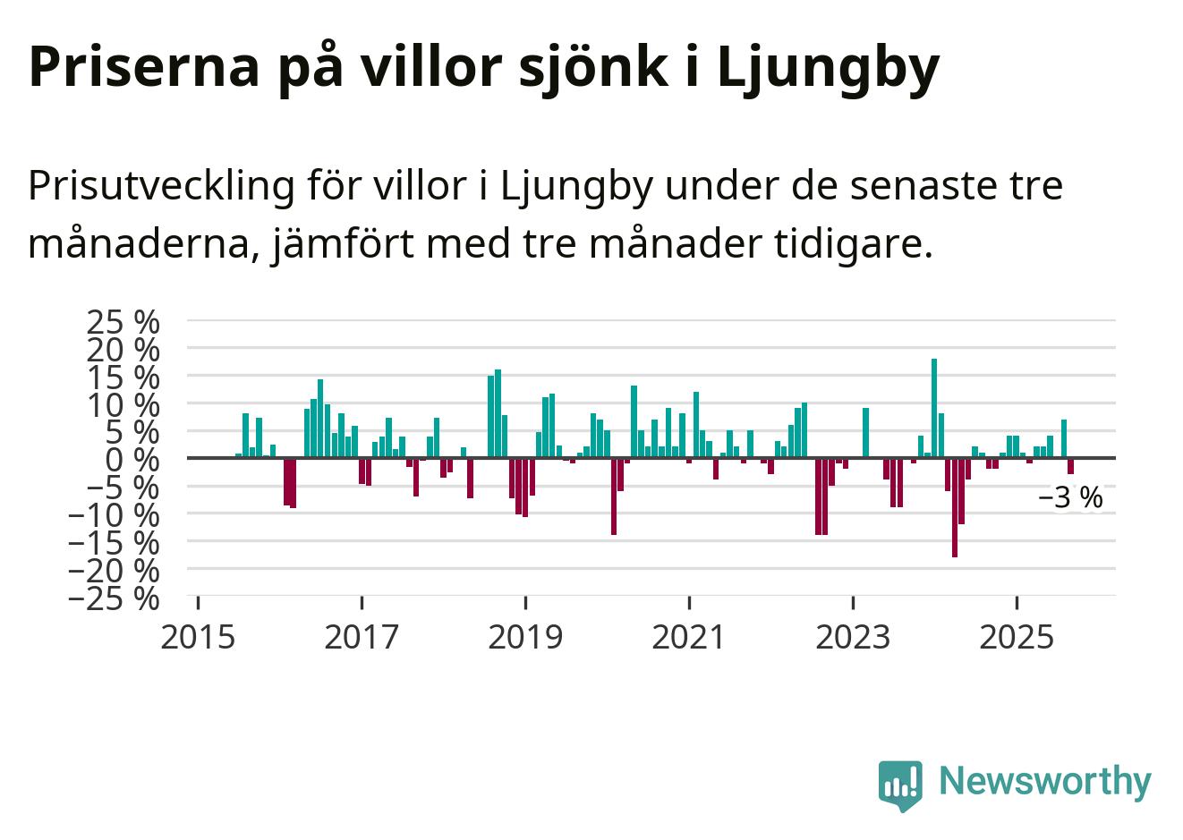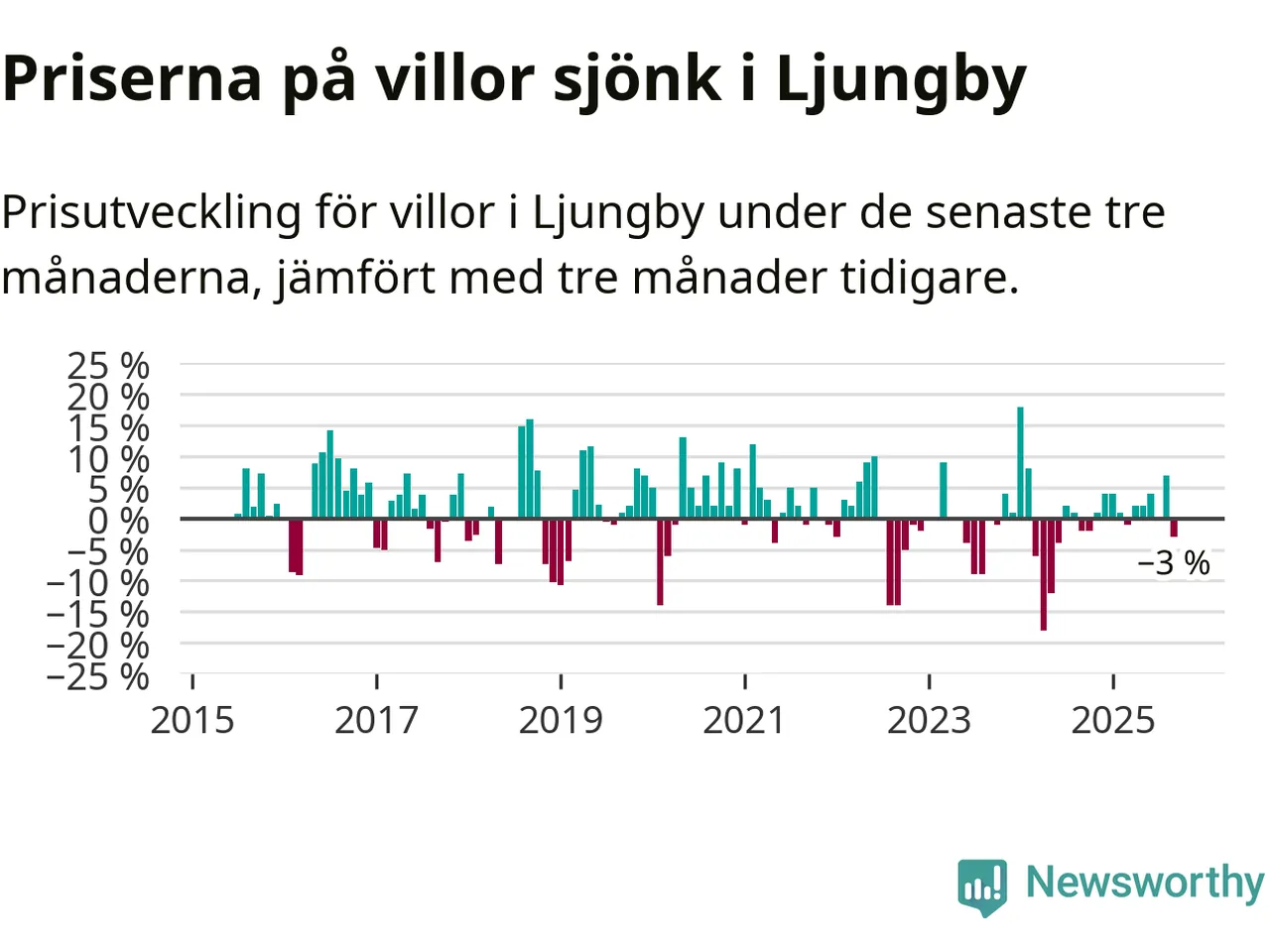 Villapriserna har gått ner i Ljungby kommun. Medelpriset på försäljningarna under de senaste tre månaderna visar på en nedgång med 3 procent.