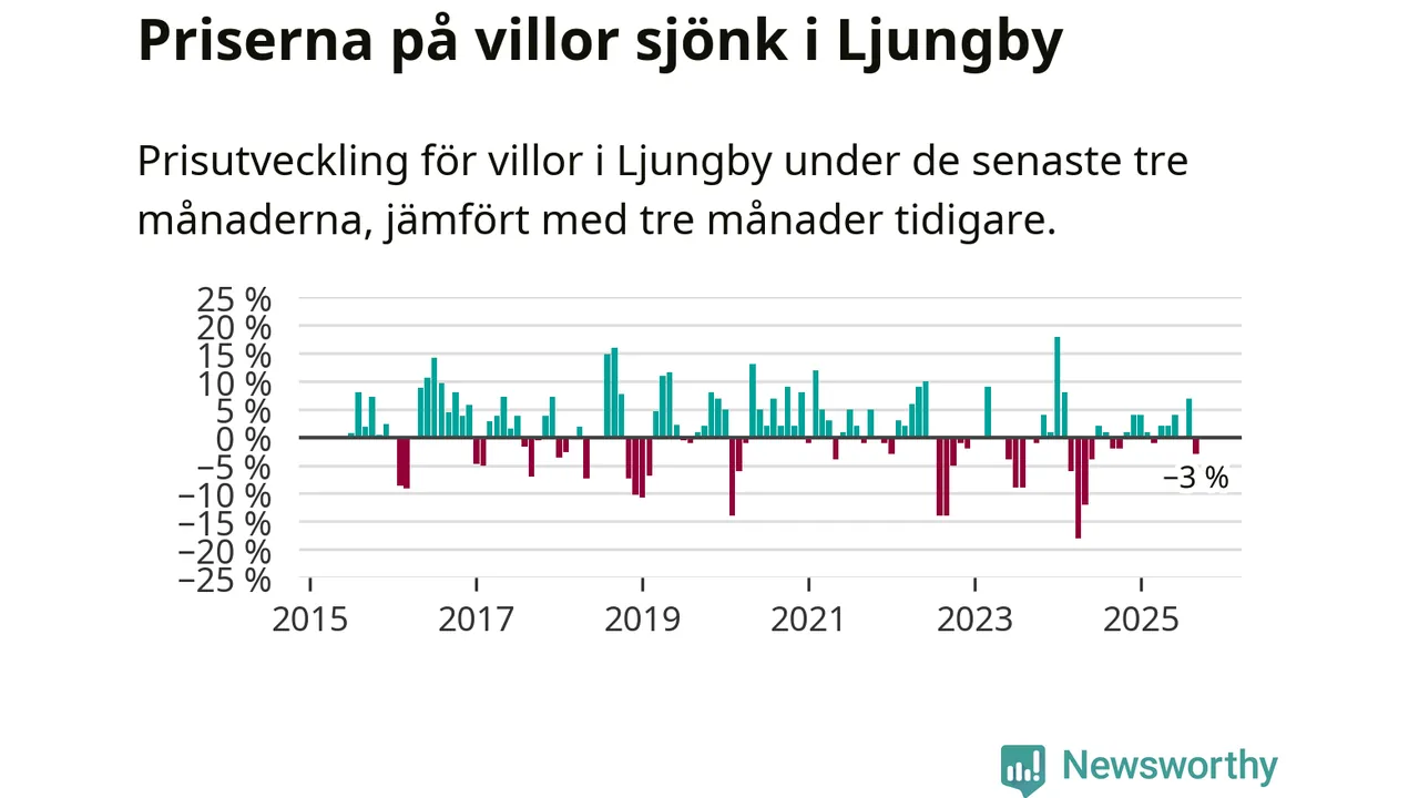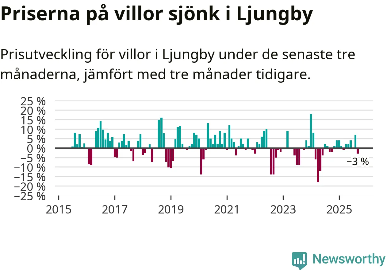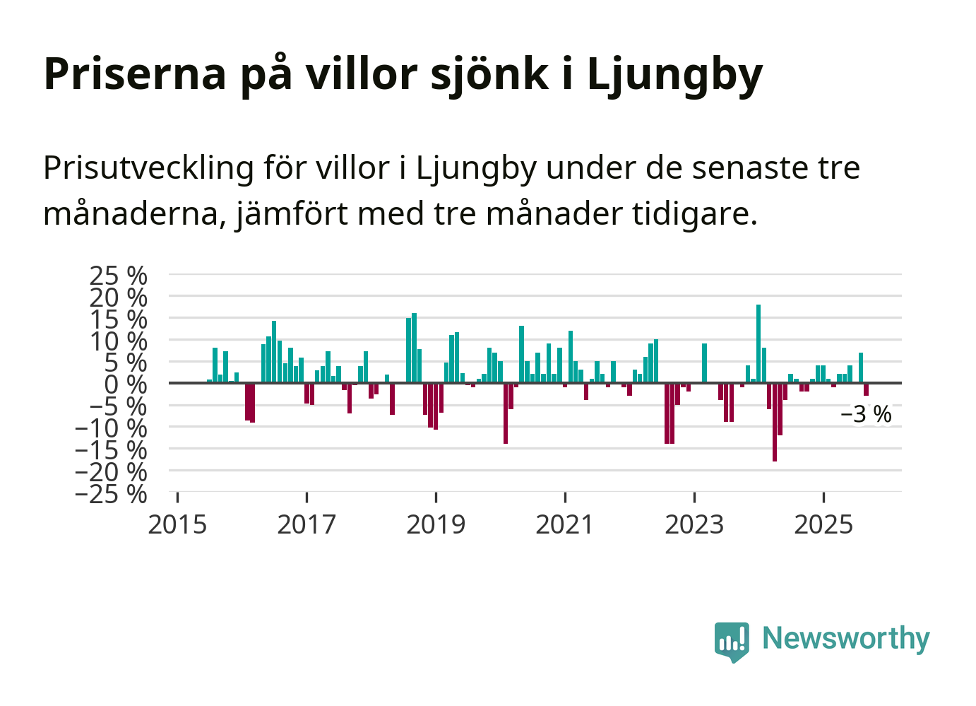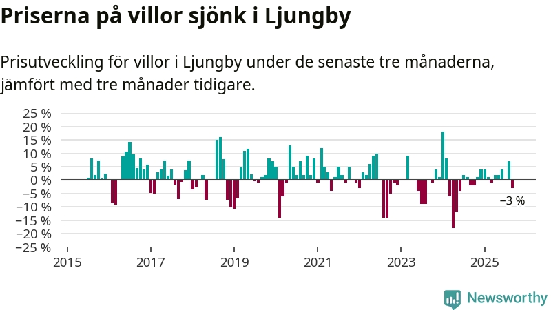 Villapriserna har gått ner i Ljungby kommun. Medelpriset på försäljningarna under de senaste tre månaderna visar på en nedgång med 3 procent.
