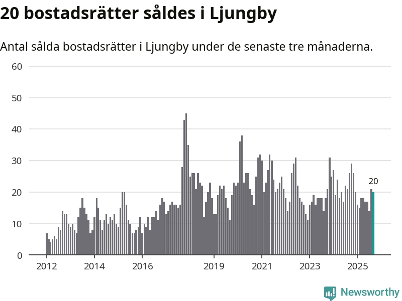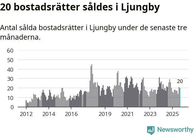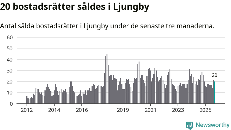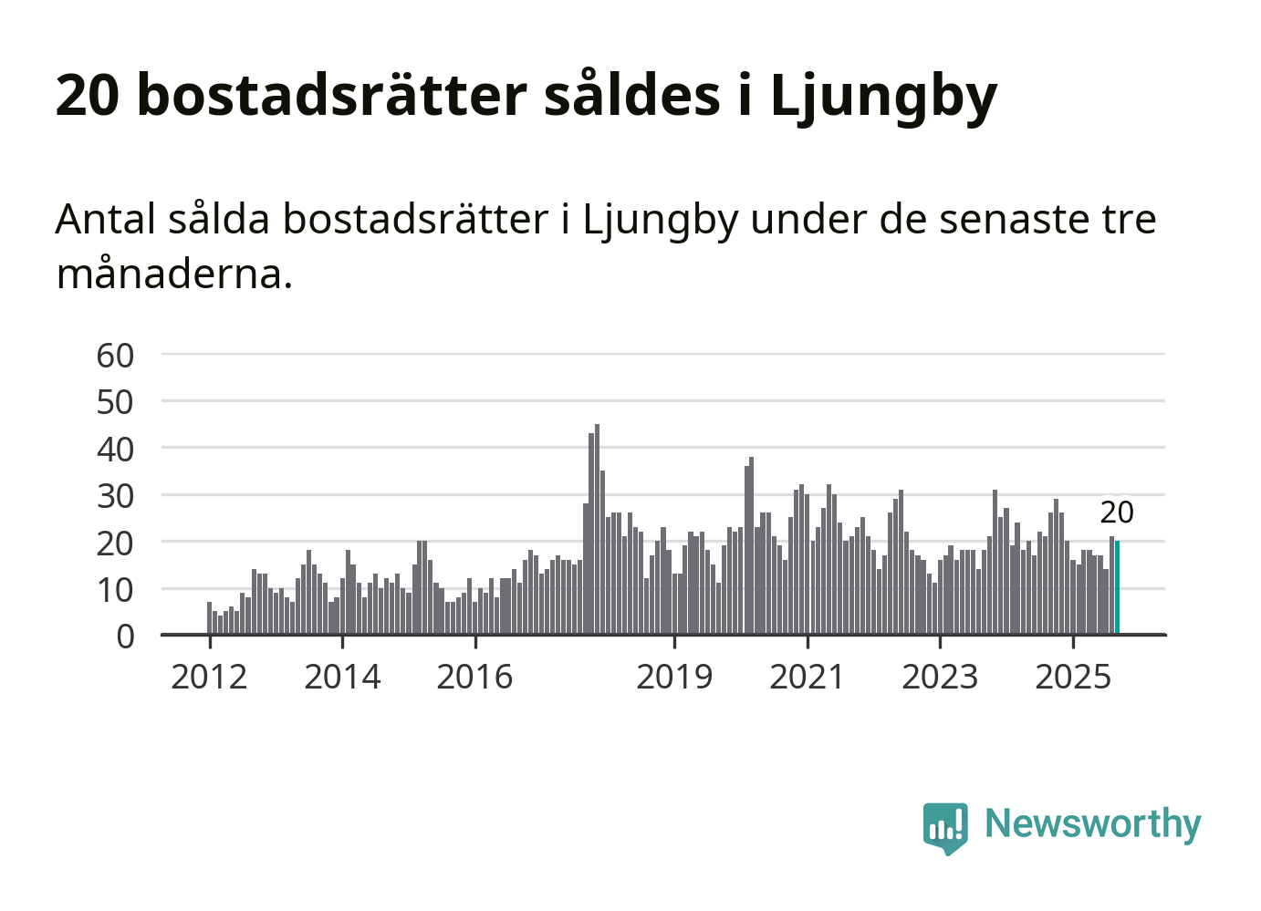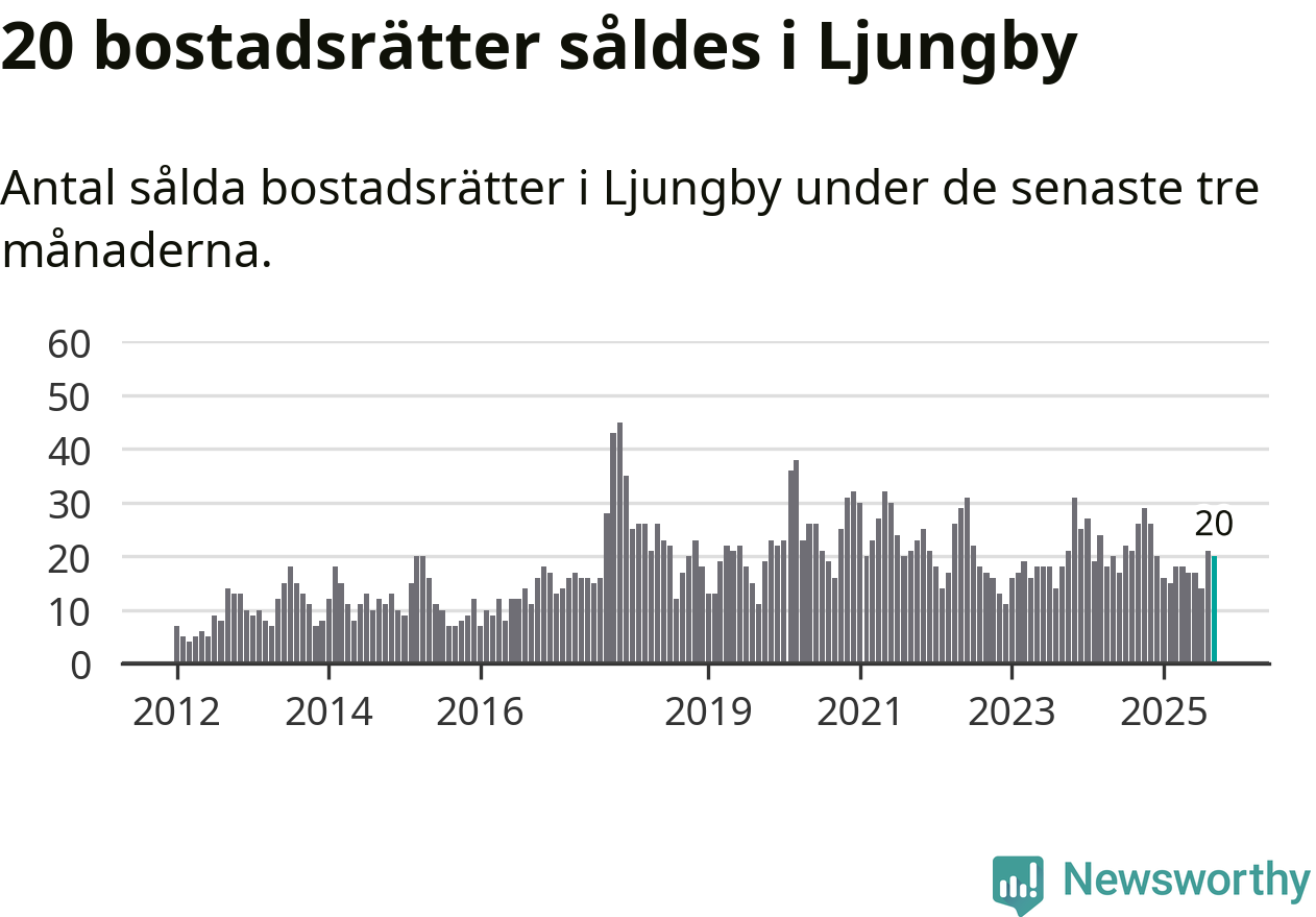 Mellan juli och september gjordes sammanlagt 20 affärer med bostadsrätter i Ljungby kommun. Det kan jämföras med 26 vid motsvarande tid i fjol.