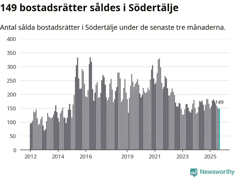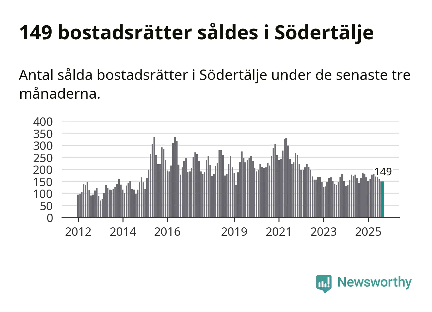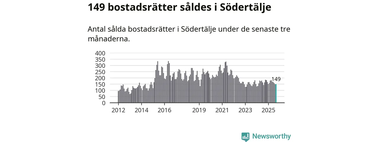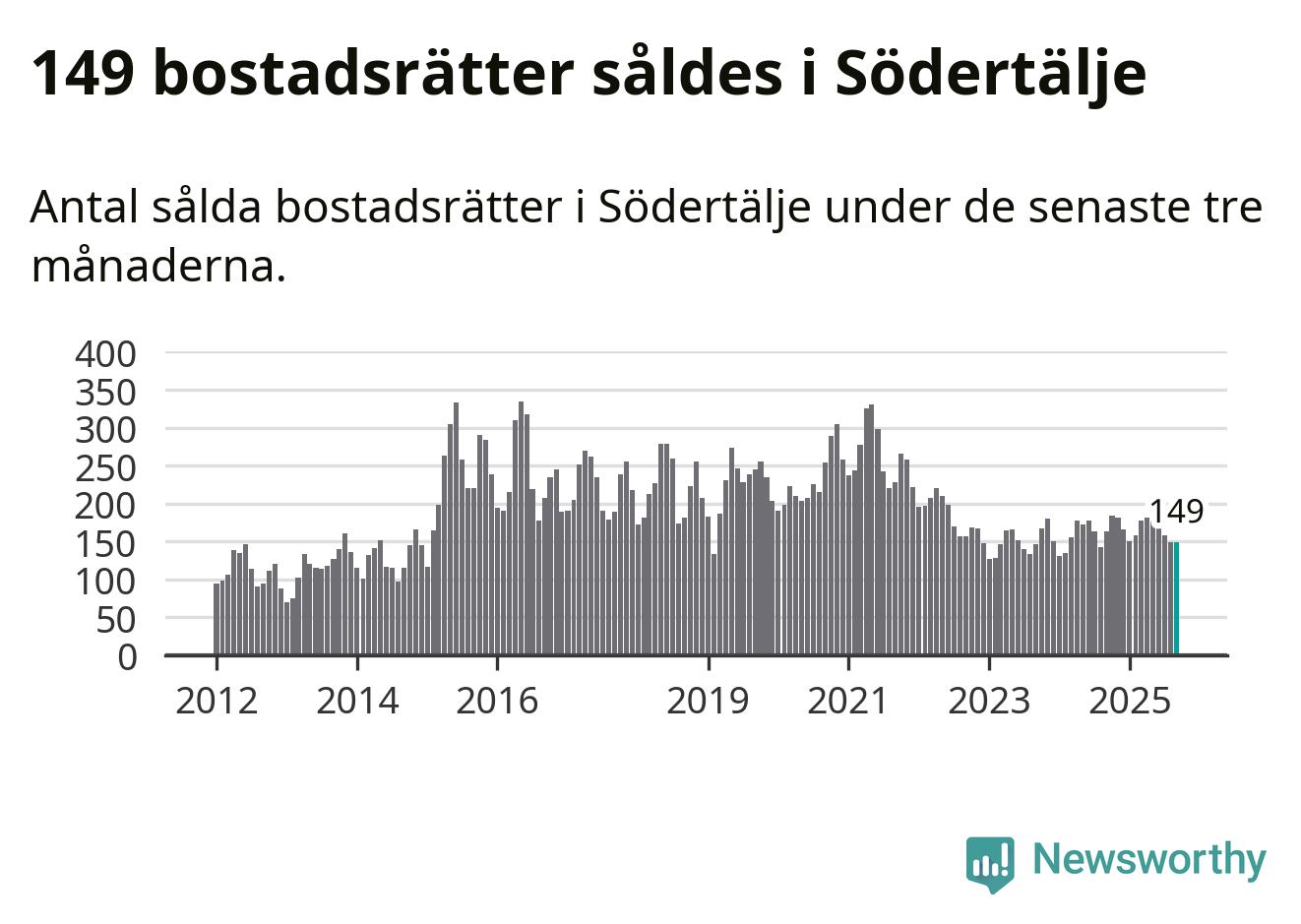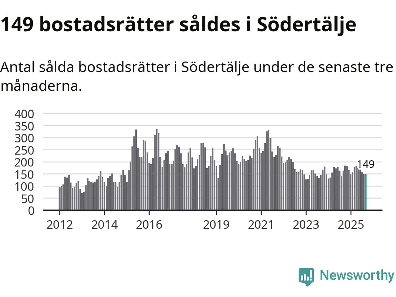 Sammanlagt såldes 149 bostadsrätter i Södertälje kommun mellan juli och september till ett genomsnittligt pris på 2,0 miljoner kronor. I fjol gjordes 163 affärer vid den här tiden på året.