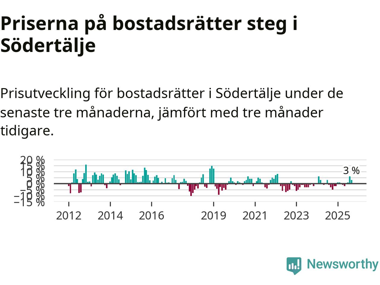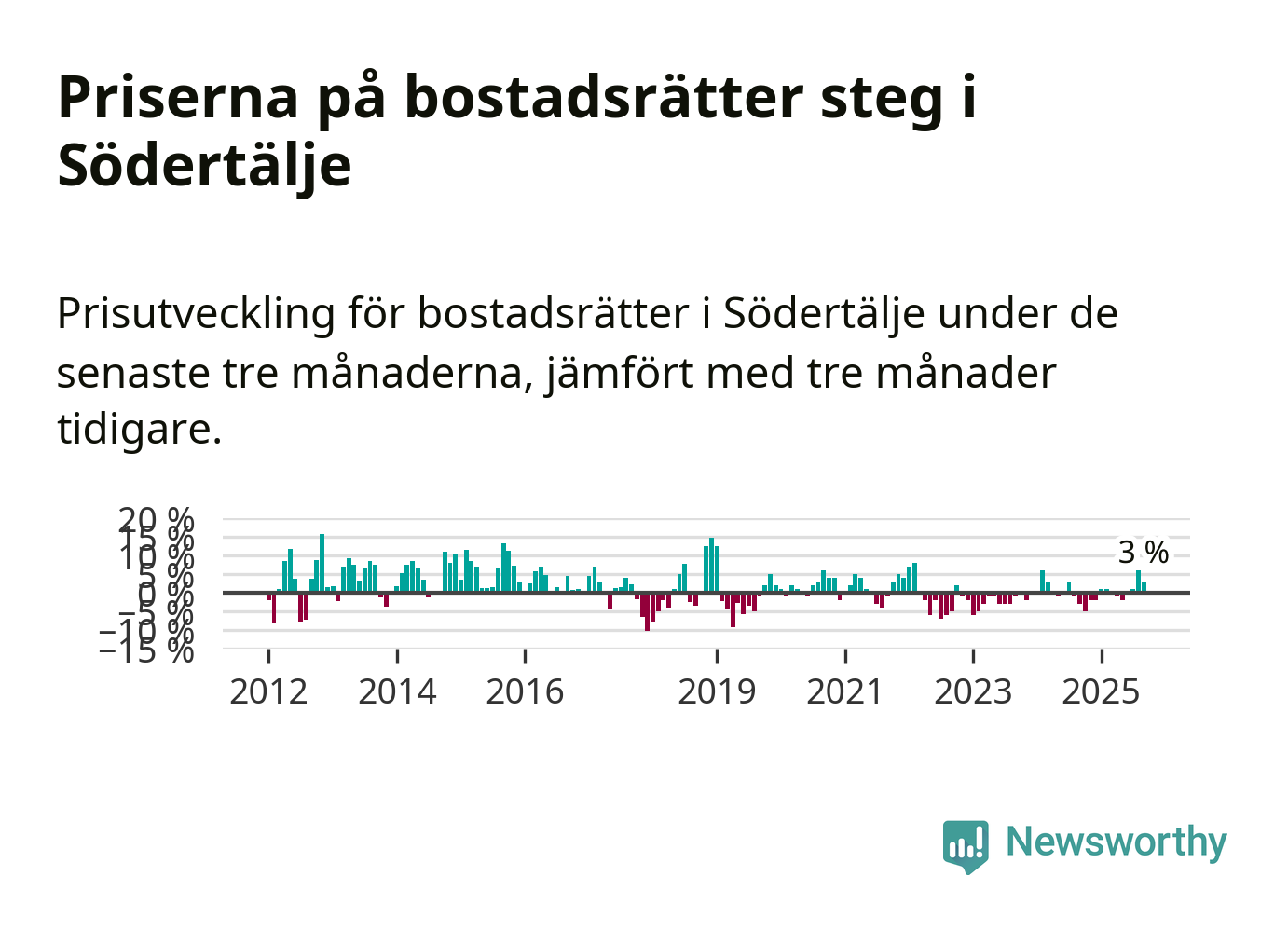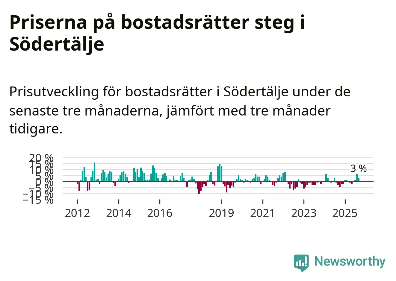Priserna på bostadsrätter har gått upp i Södertälje kommun. Medelpriset på försäljningarna under de senaste tre månaderna visar på en uppgång med 3 procent.