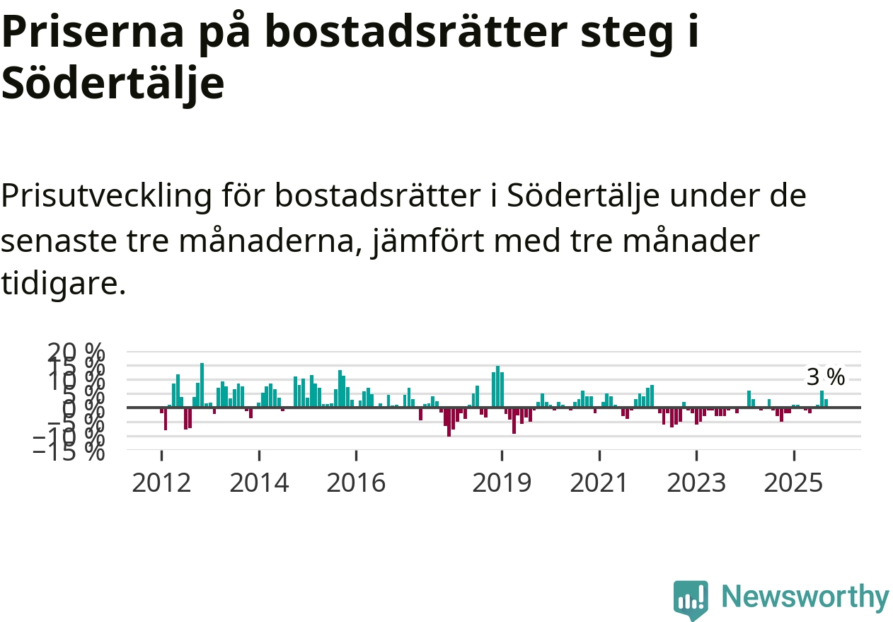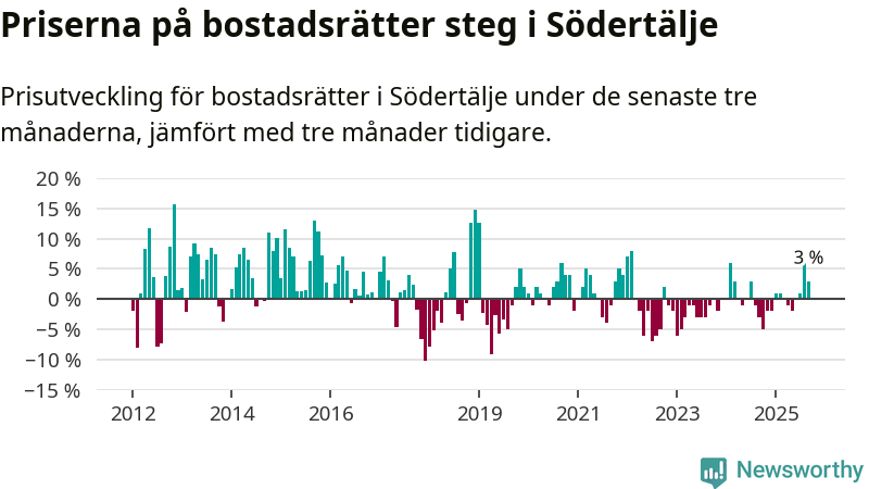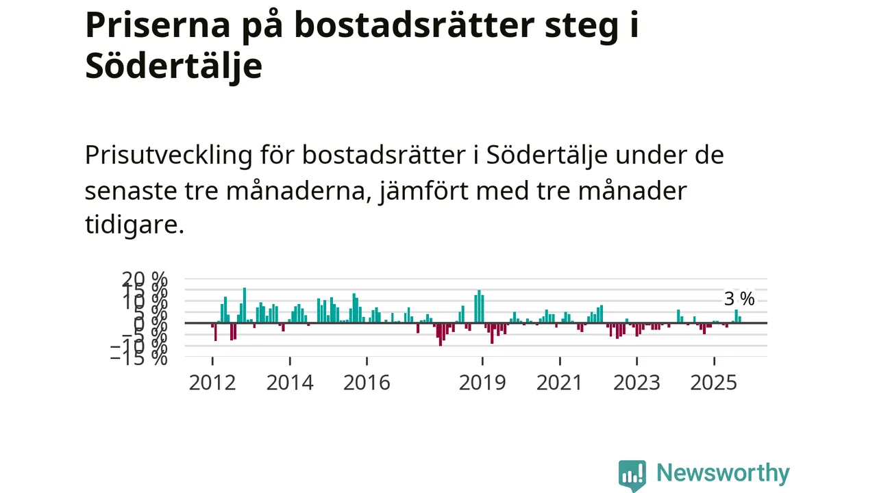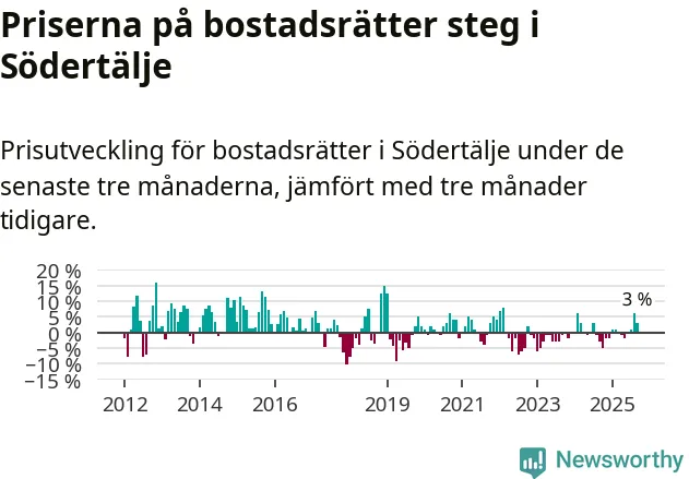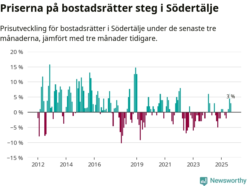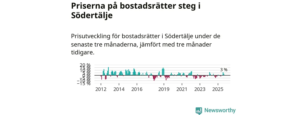 Priserna på bostadsrätter har gått upp i Södertälje kommun. Medelpriset på försäljningarna under de senaste tre månaderna visar på en uppgång med 3 procent.