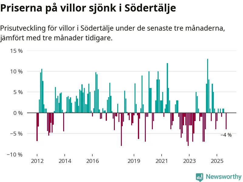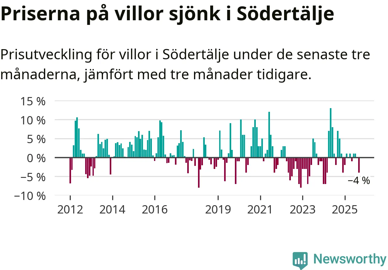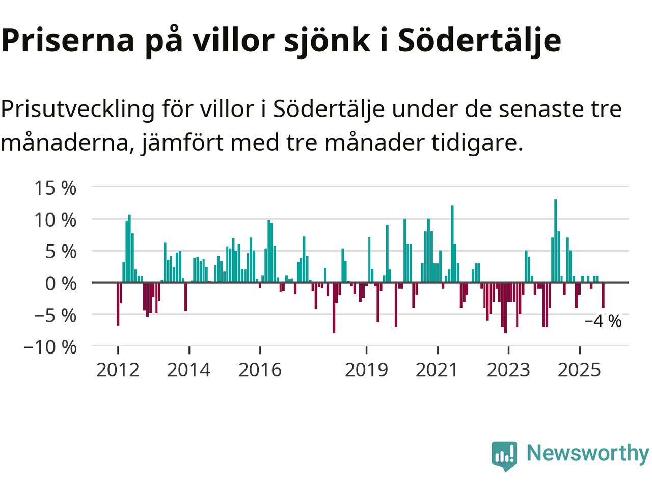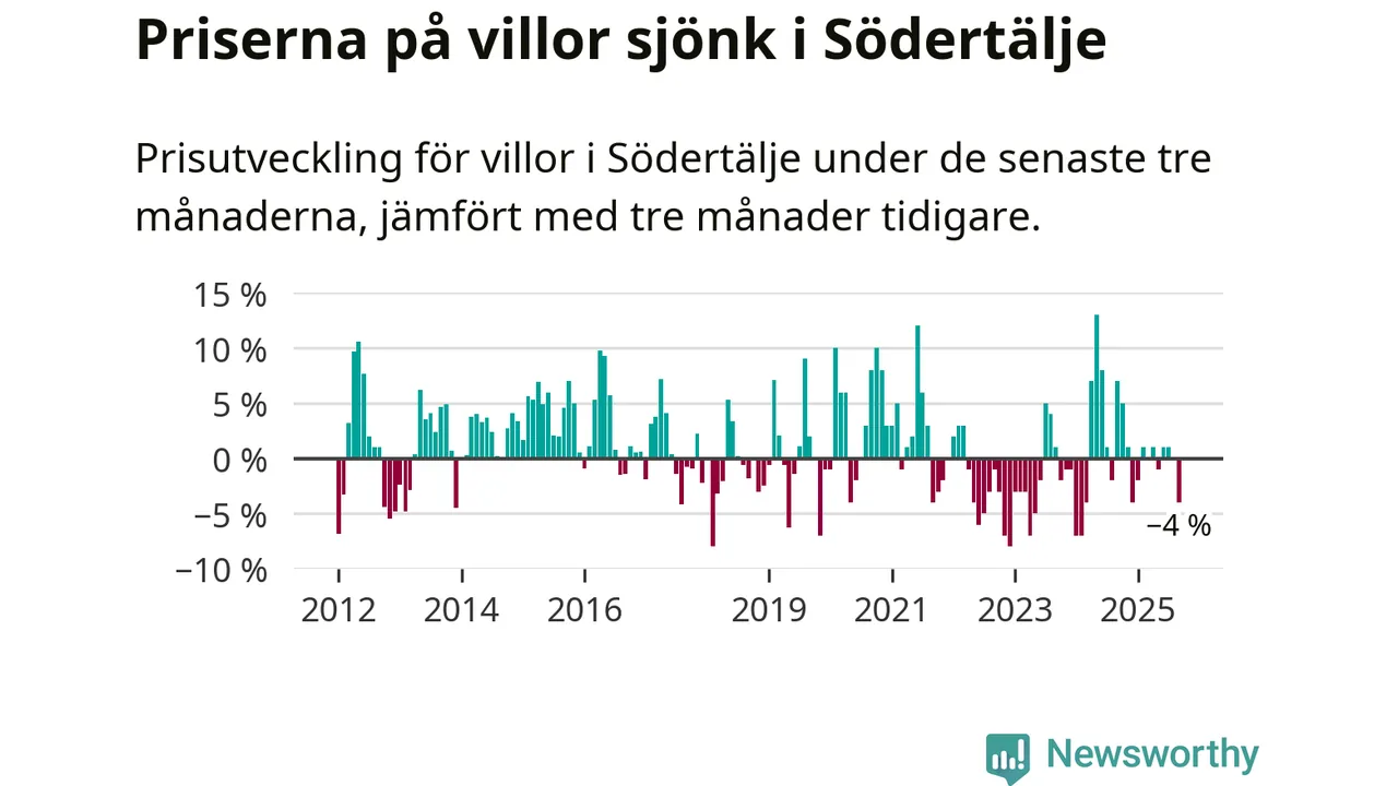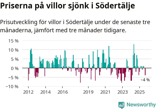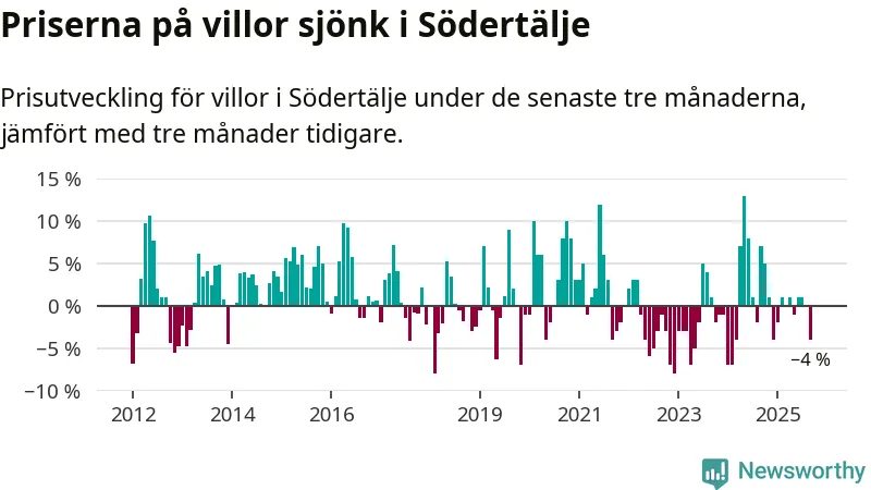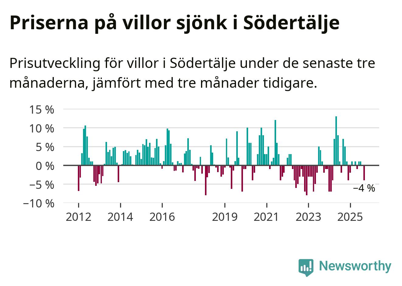 Villapriserna har gått ner i Södertälje kommun. Medelpriset på försäljningarna under de senaste tre månaderna visar på en nedgång med 4 procent.