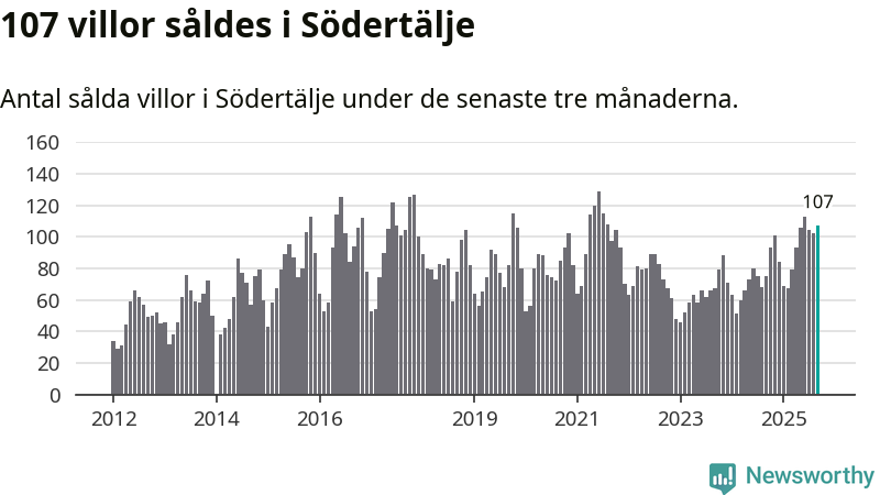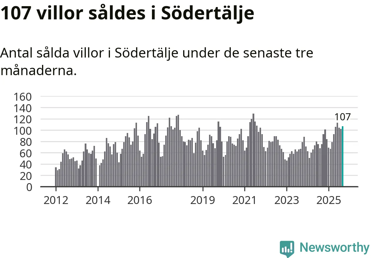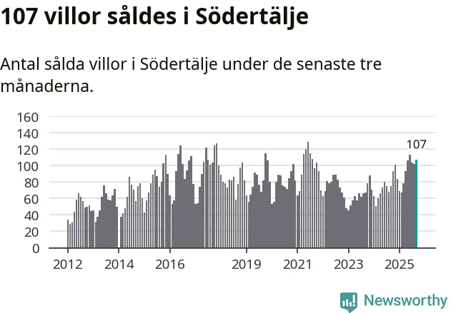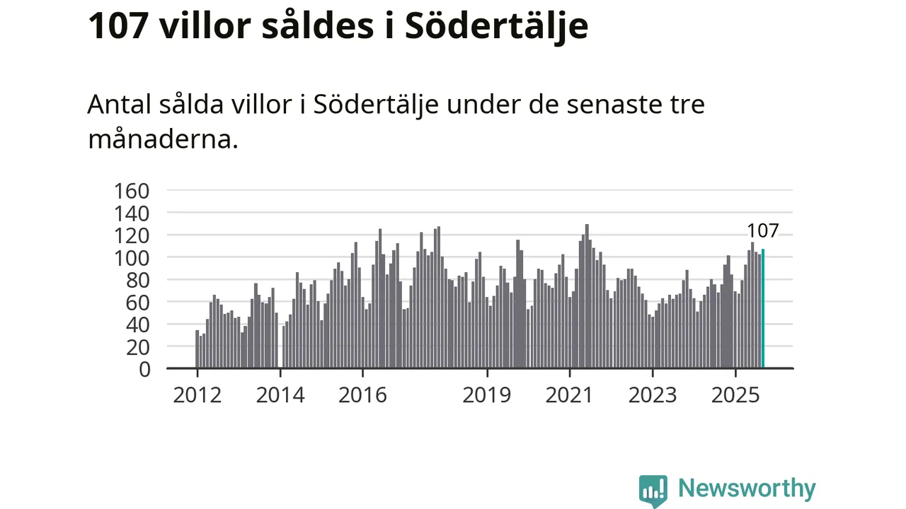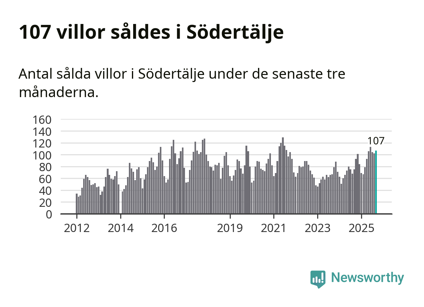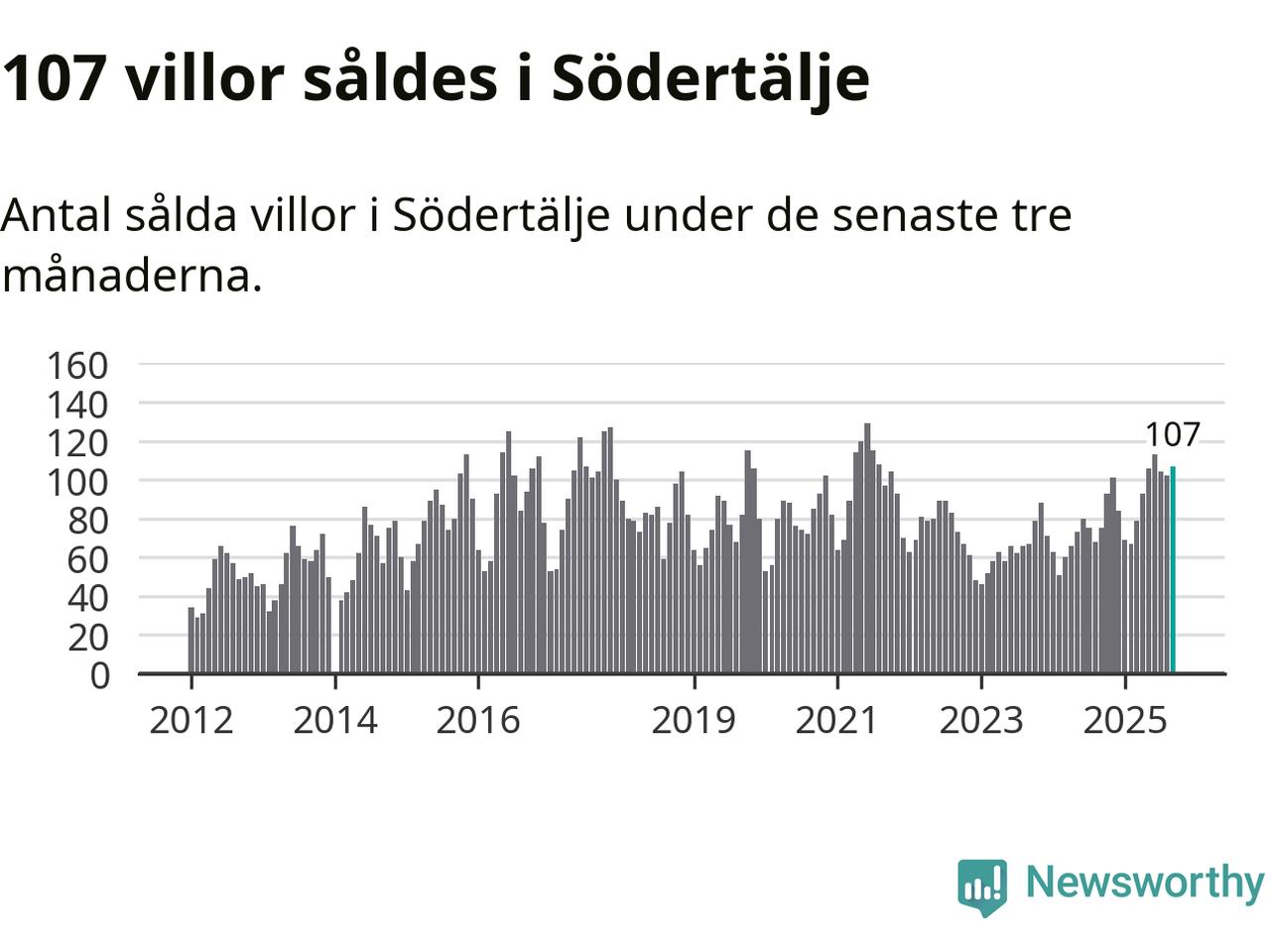 Sammanlagt såldes 107 villor i Södertälje kommun mellan juli och september till ett genomsnittligt pris på 4,1 miljoner kronor. I fjol gjordes 75 affärer vid den här tiden på året.