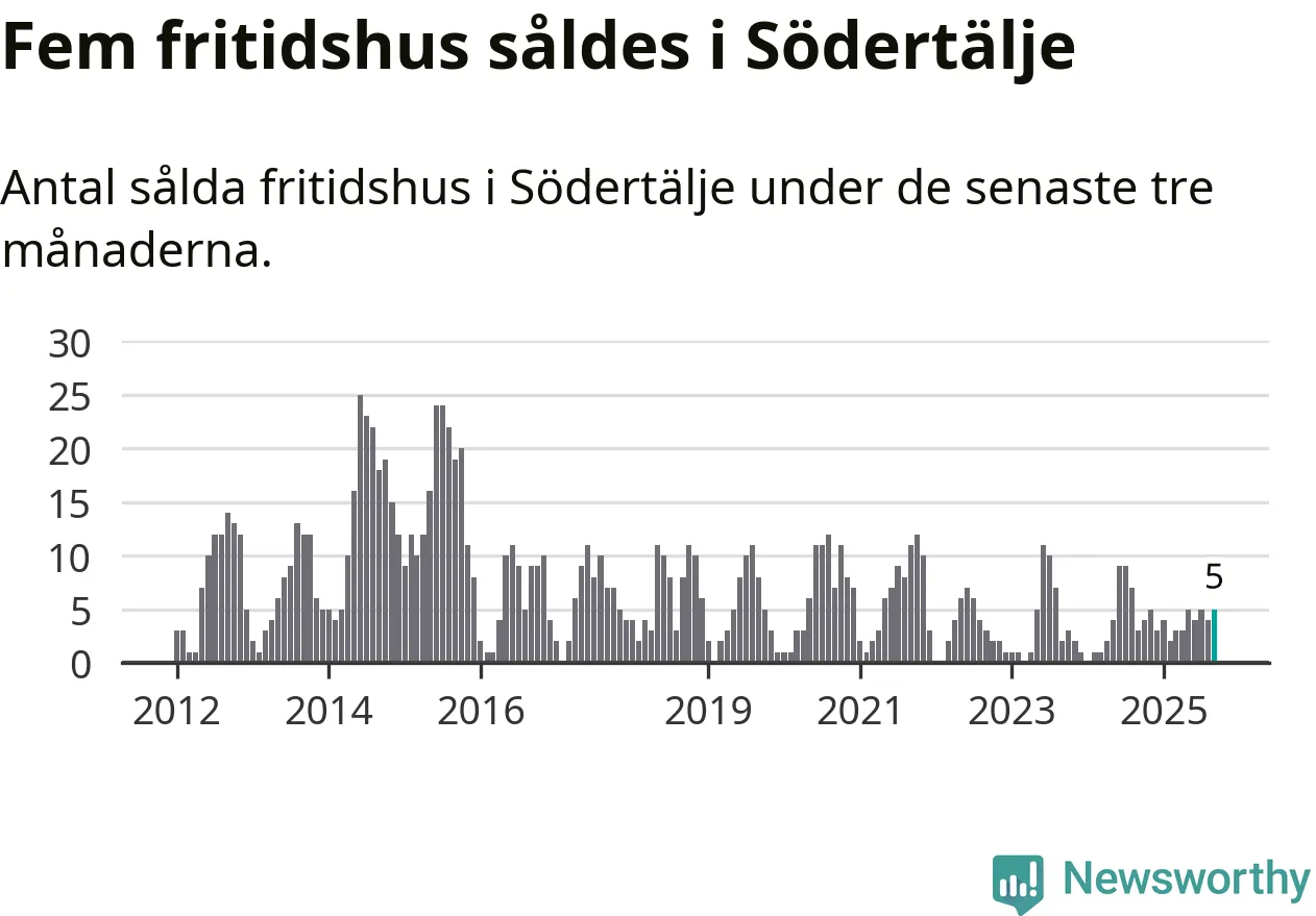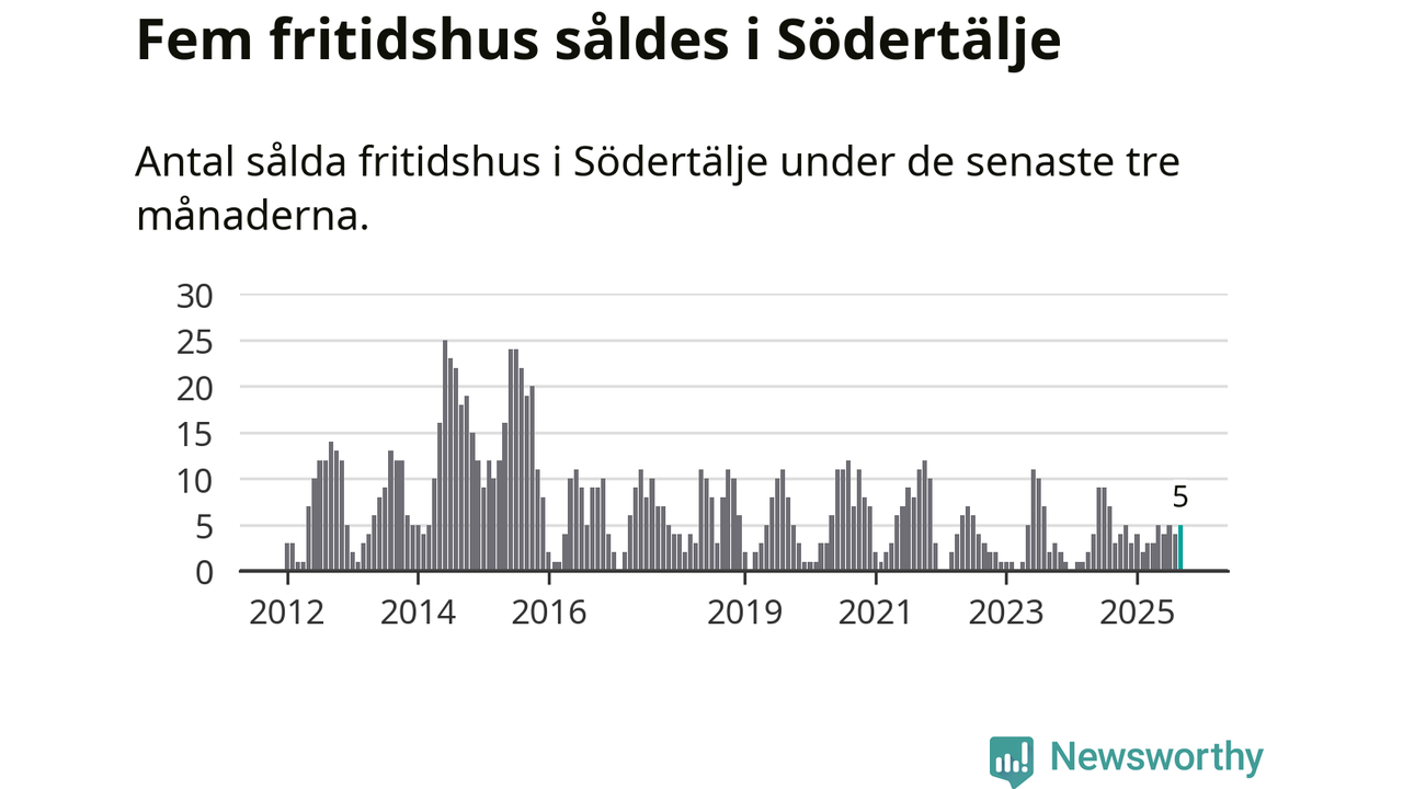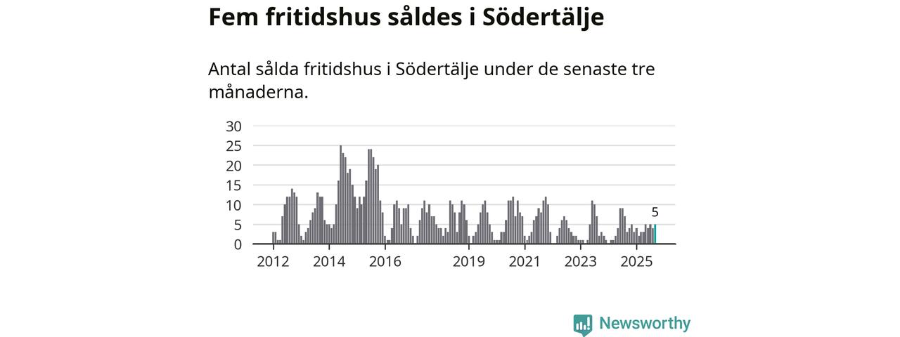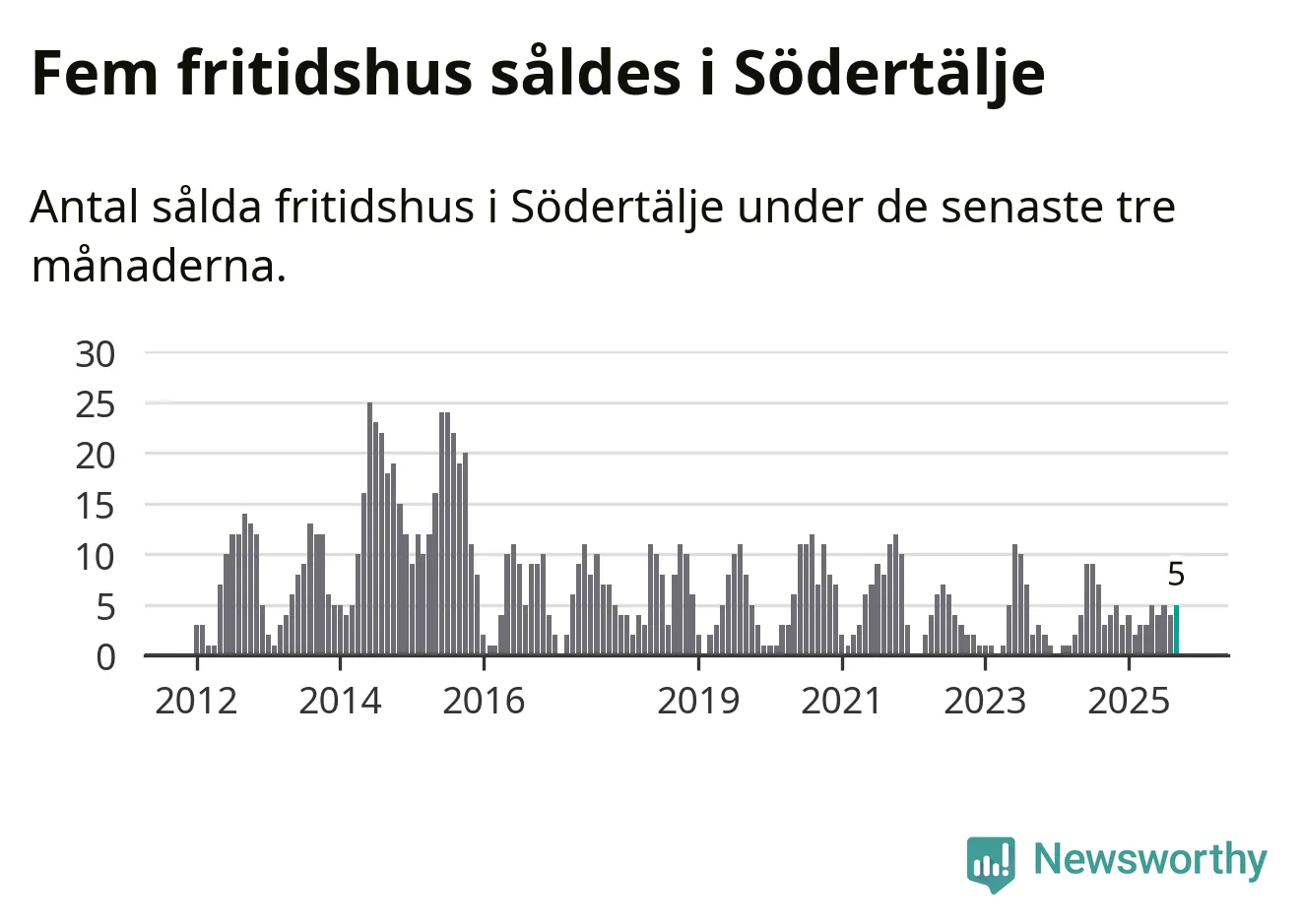 Mellan juli och september gjordes sammanlagt fem affärer med fritidshus i Södertälje kommun. Det kan jämföras med tre vid motsvarande tid i fjol.