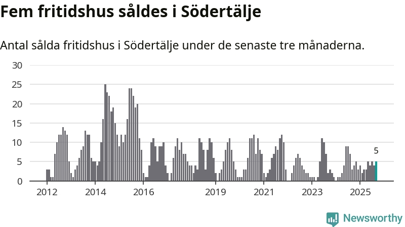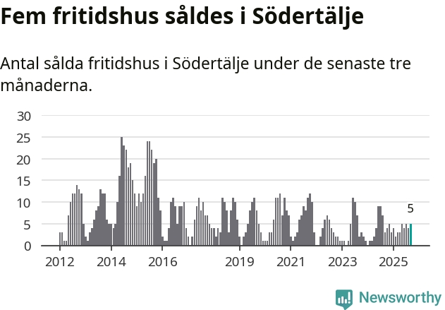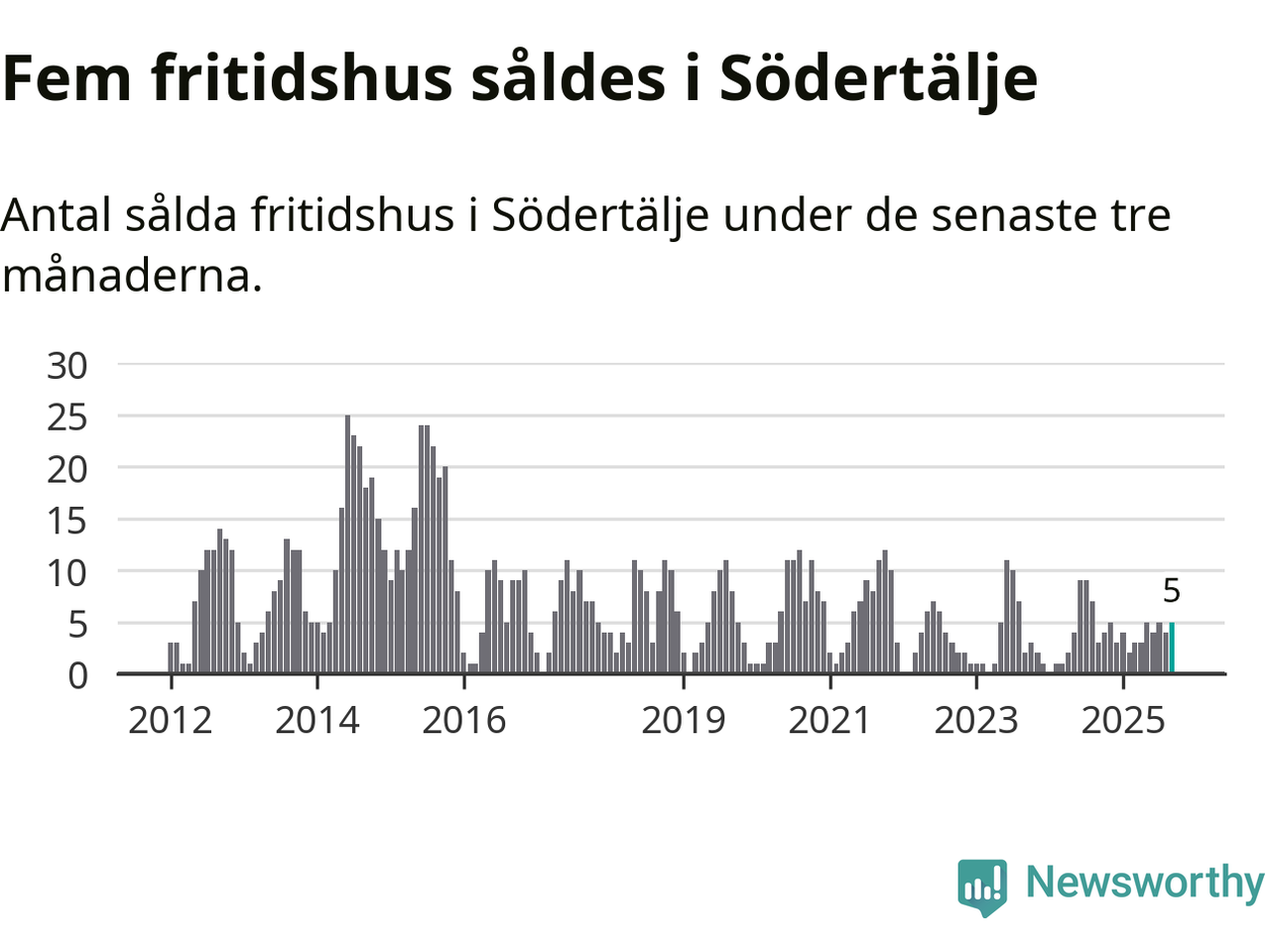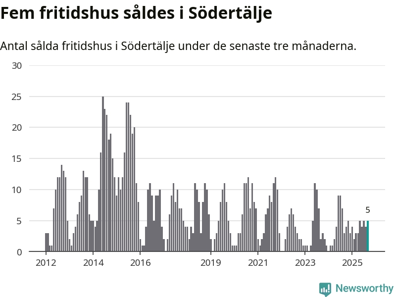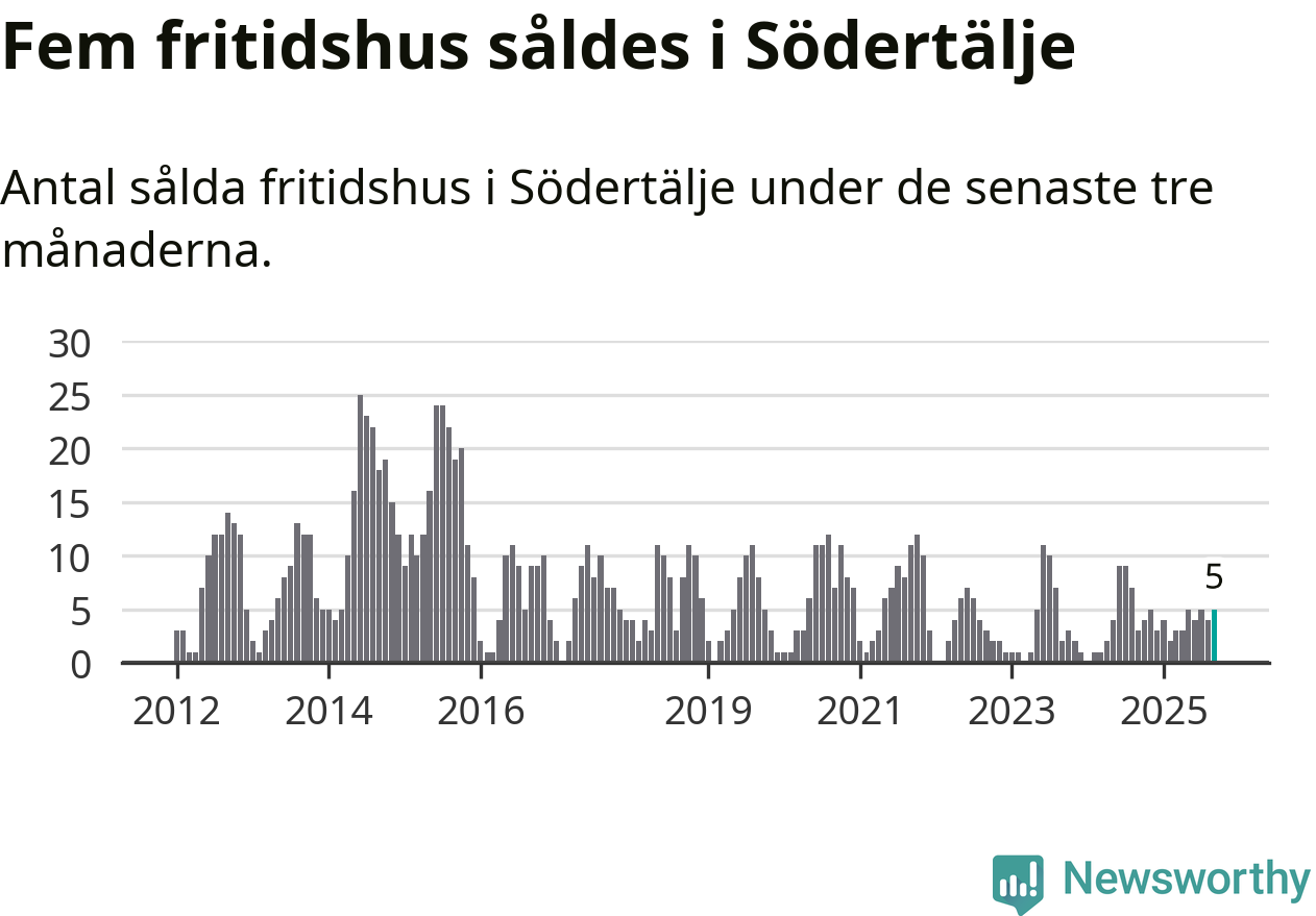Mellan juli och september gjordes sammanlagt fem affärer med fritidshus i Södertälje kommun. Det kan jämföras med tre vid motsvarande tid i fjol.