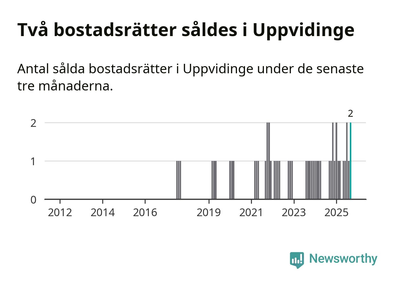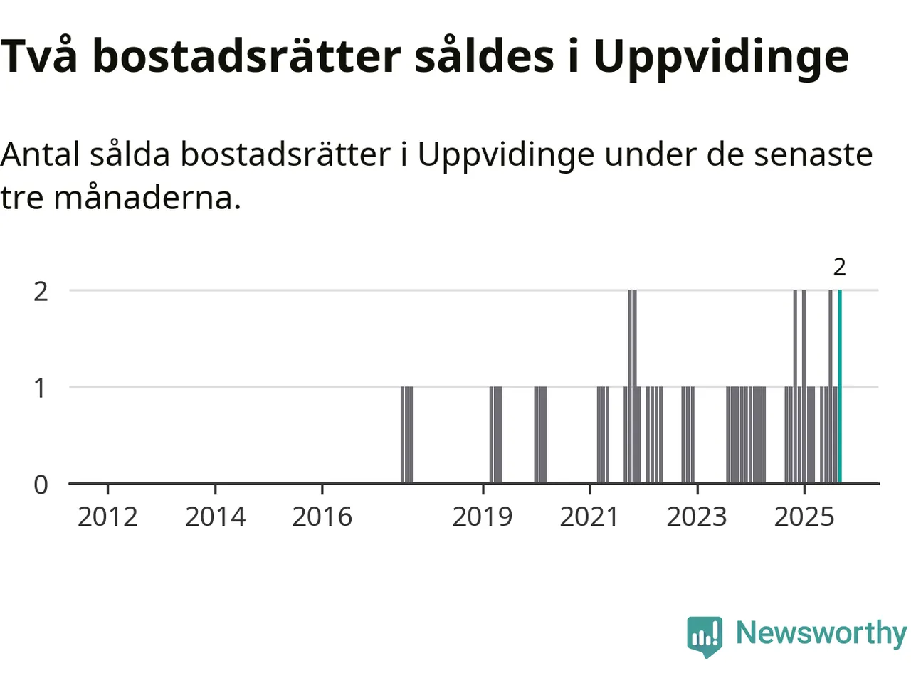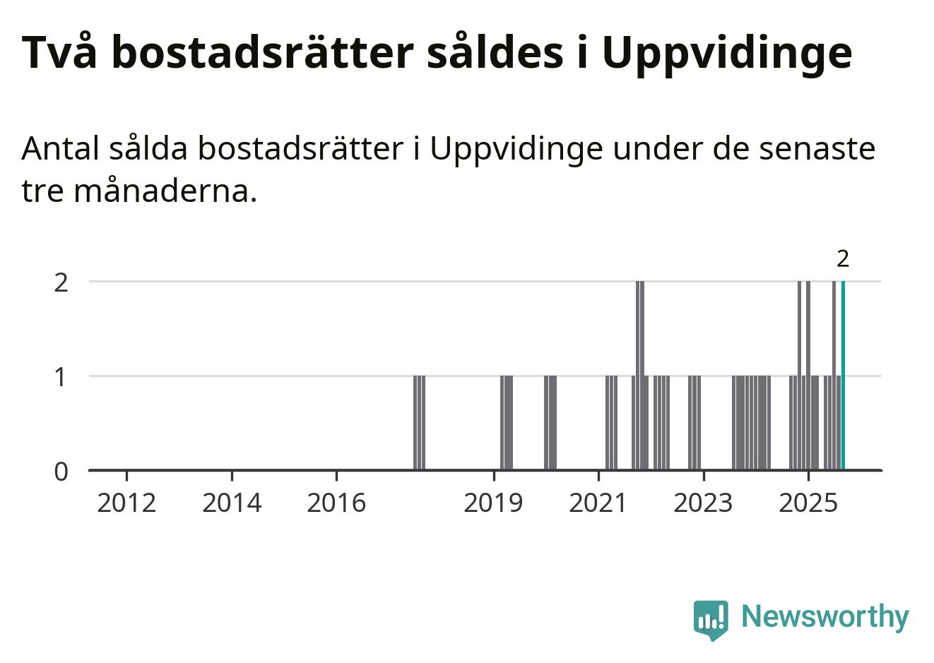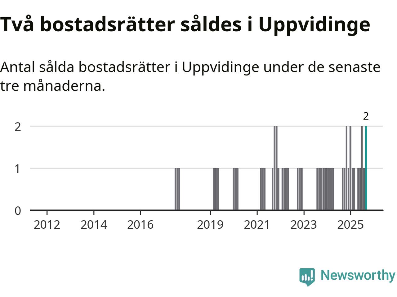 Mellan juli och september gjordes sammanlagt två affärer med bostadsrätter i Uppvidinge kommun. Det kan jämföras med ett vid motsvarande tid i fjol.