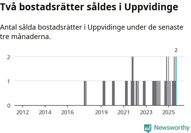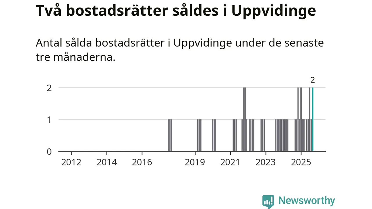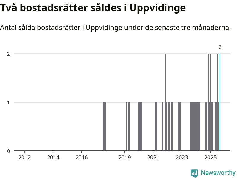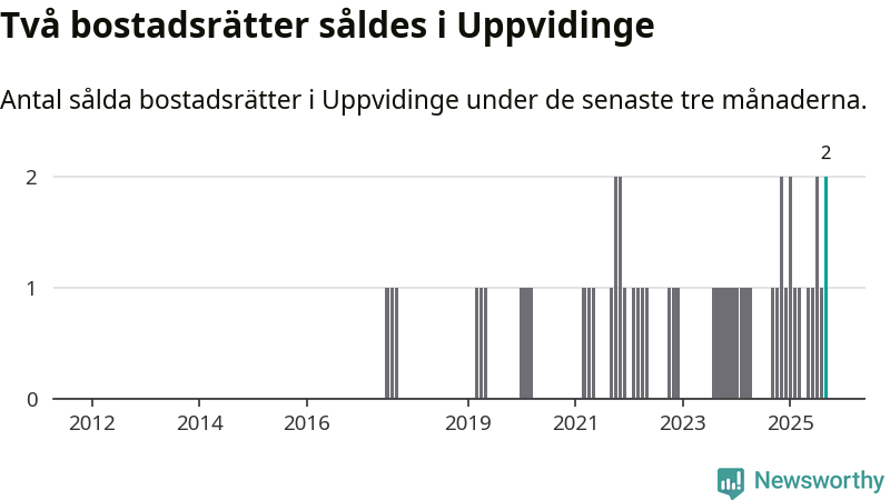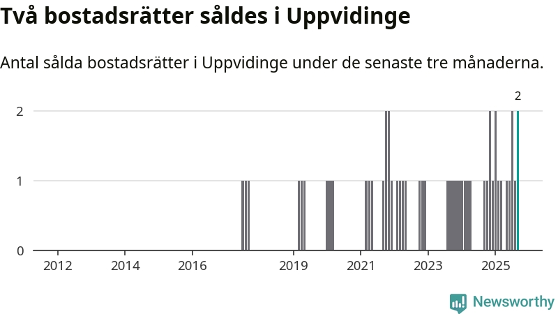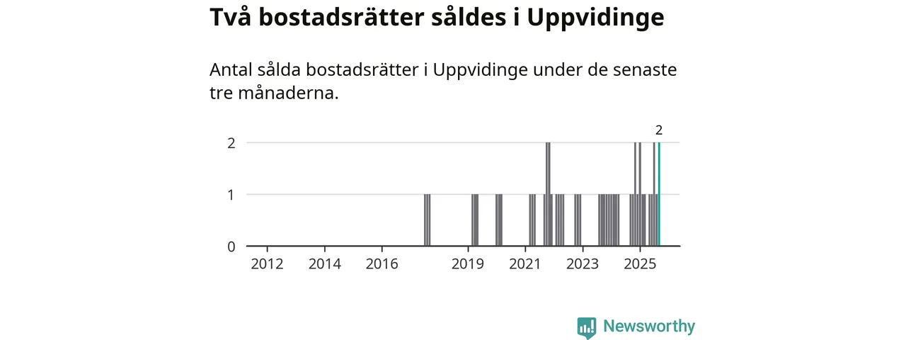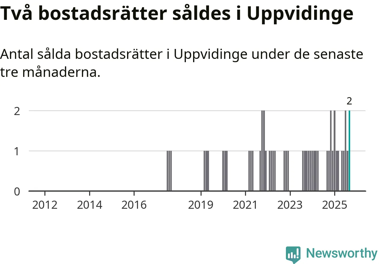Mellan juli och september gjordes sammanlagt två affärer med bostadsrätter i Uppvidinge kommun. Det kan jämföras med ett vid motsvarande tid i fjol.
