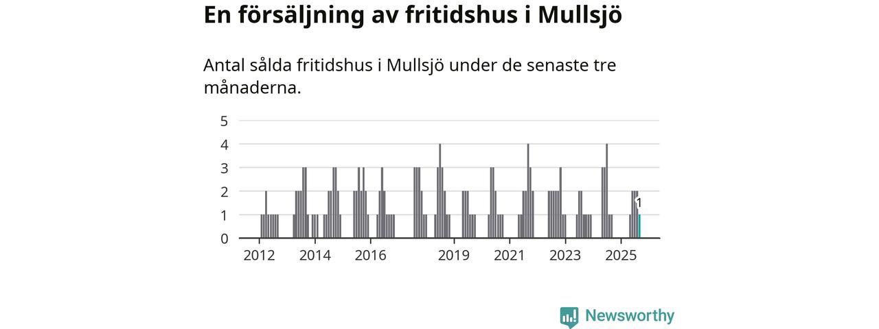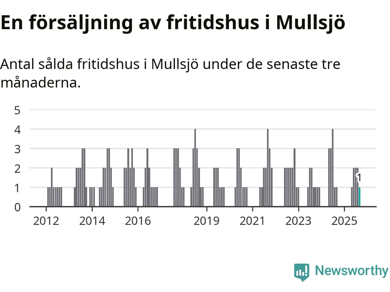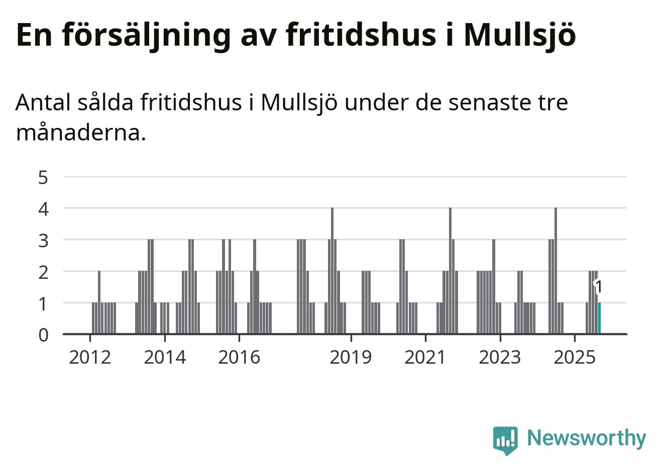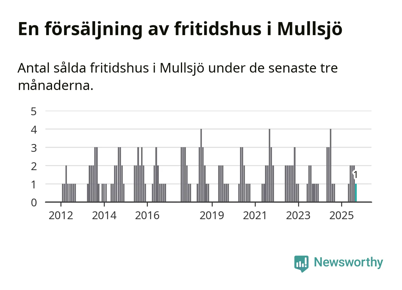 Mellan juli och september gjordes sammanlagt en affär med fritidshus i Mullsjö kommun. Det är lika många affärer som vid motsvarande tid i fjol.