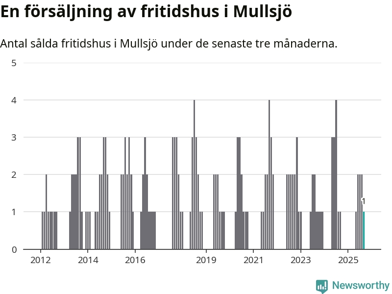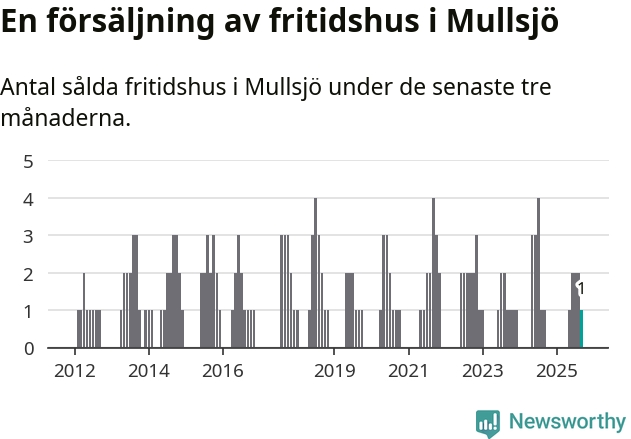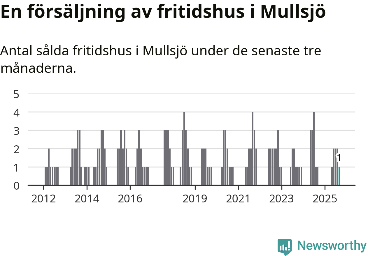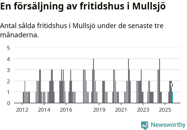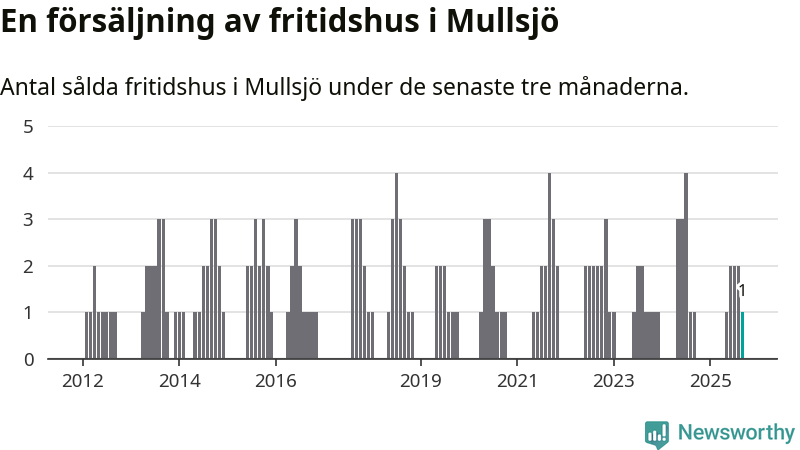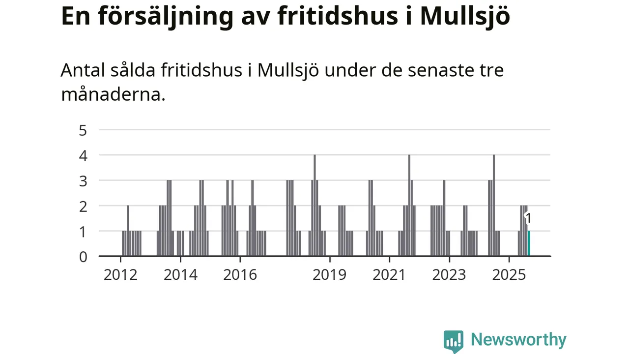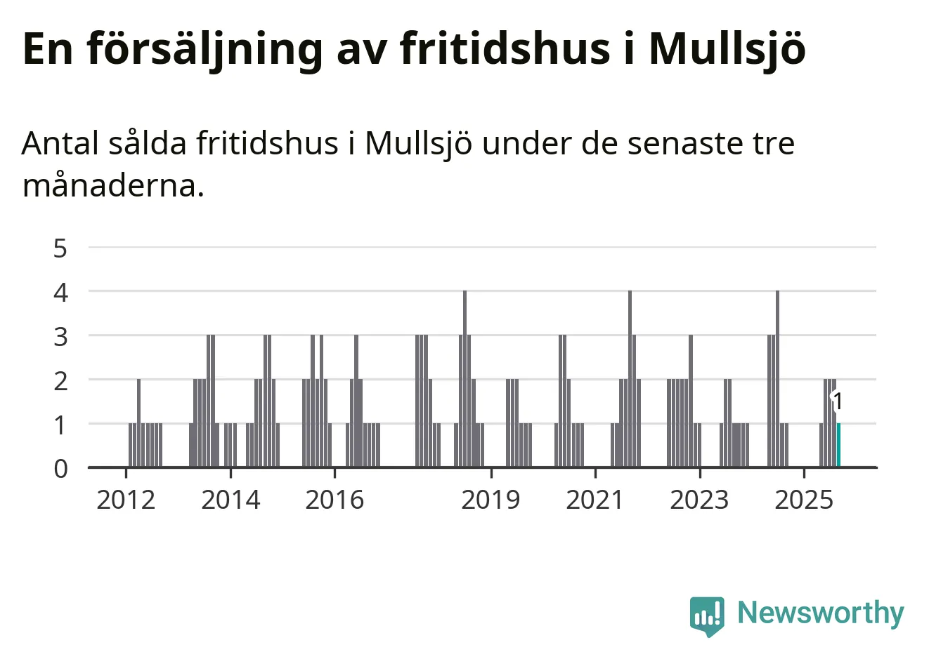 Mellan juli och september gjordes sammanlagt en affär med fritidshus i Mullsjö kommun. Det är lika många affärer som vid motsvarande tid i fjol.