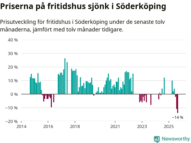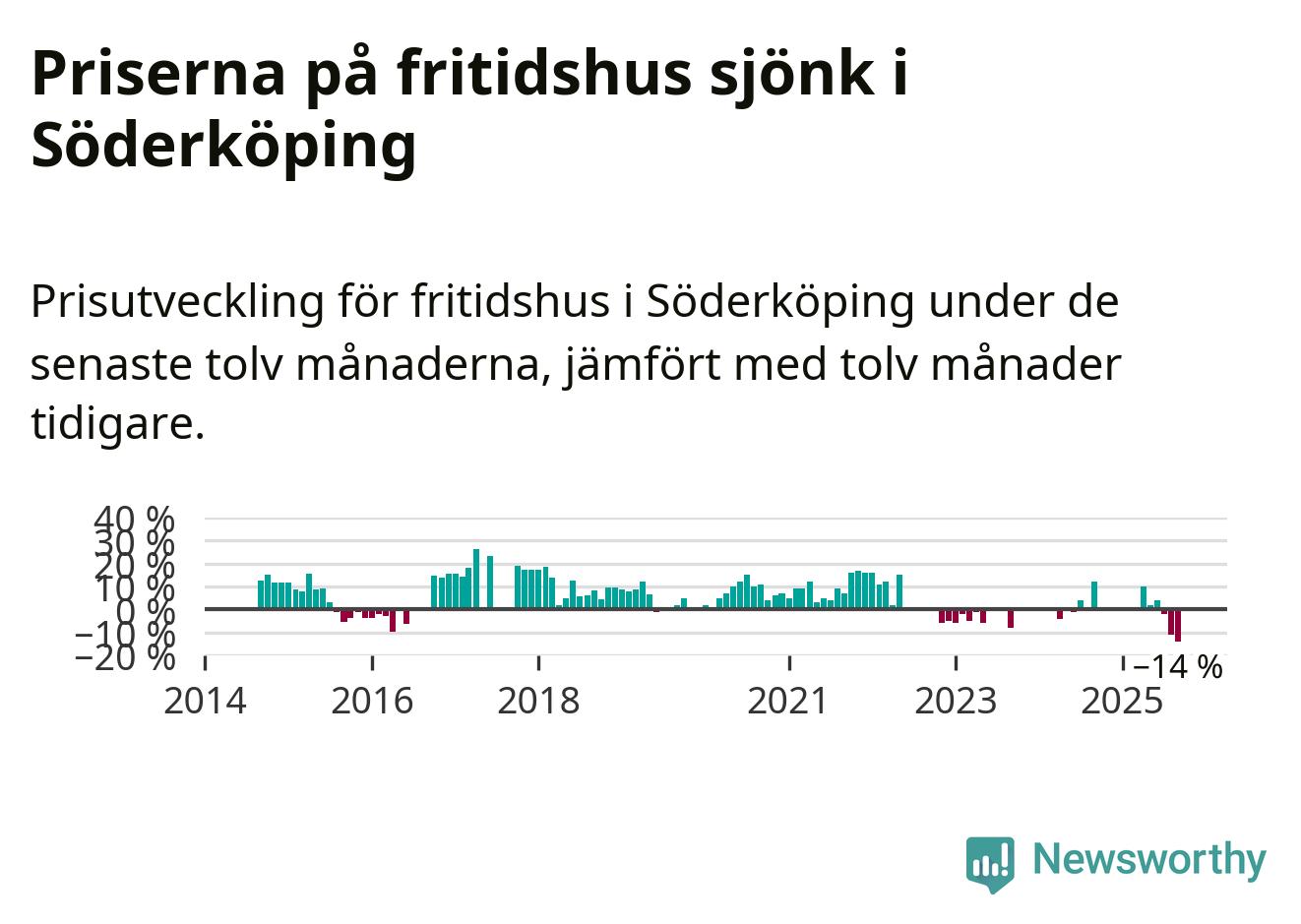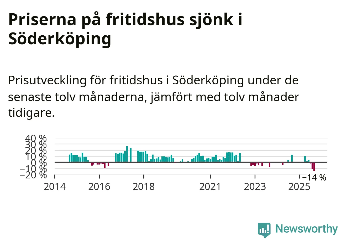 Priserna på fritidshus har gått ner i Söderköpings kommun. Medelpriset på försäljningarna under de senaste tolv månaderna visar på en nedgång med 14 procent.