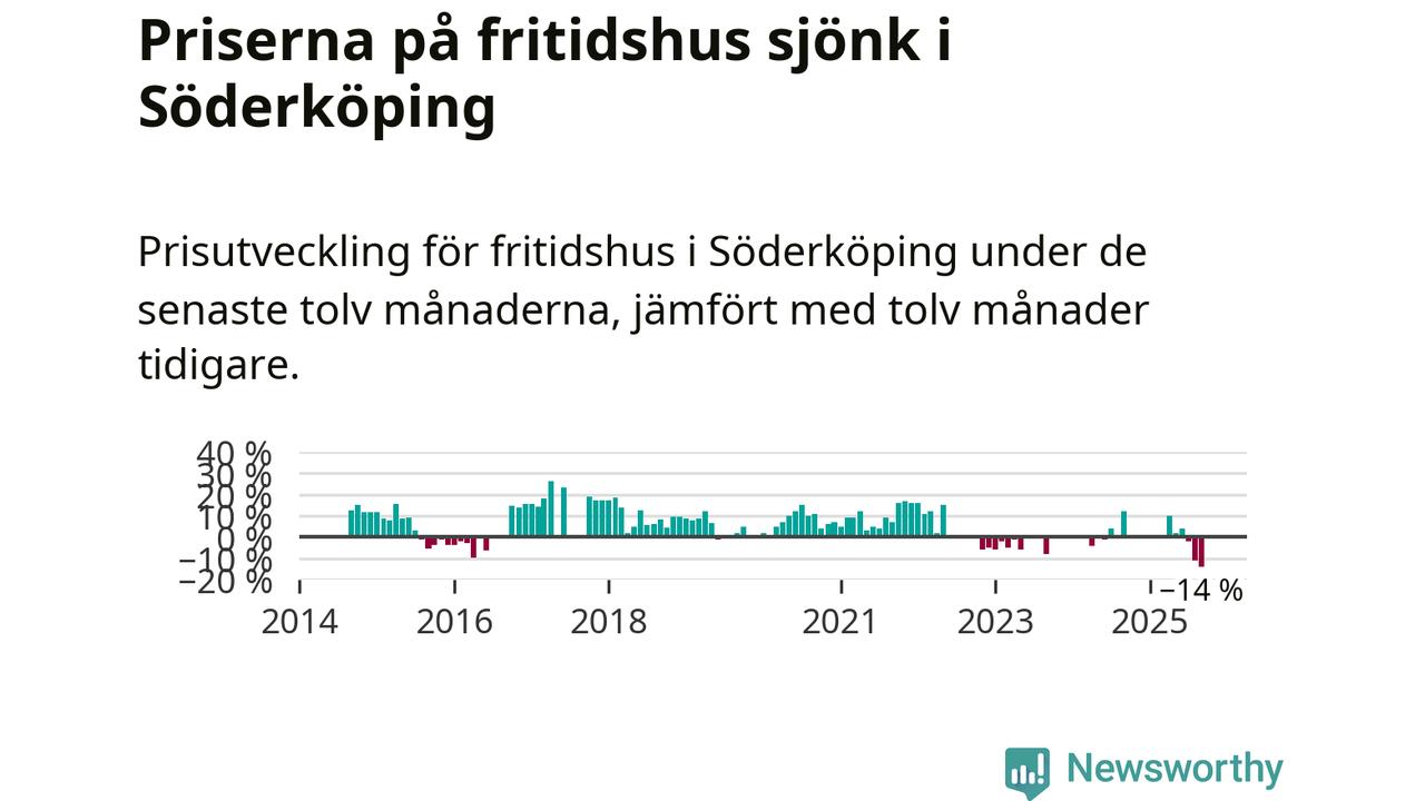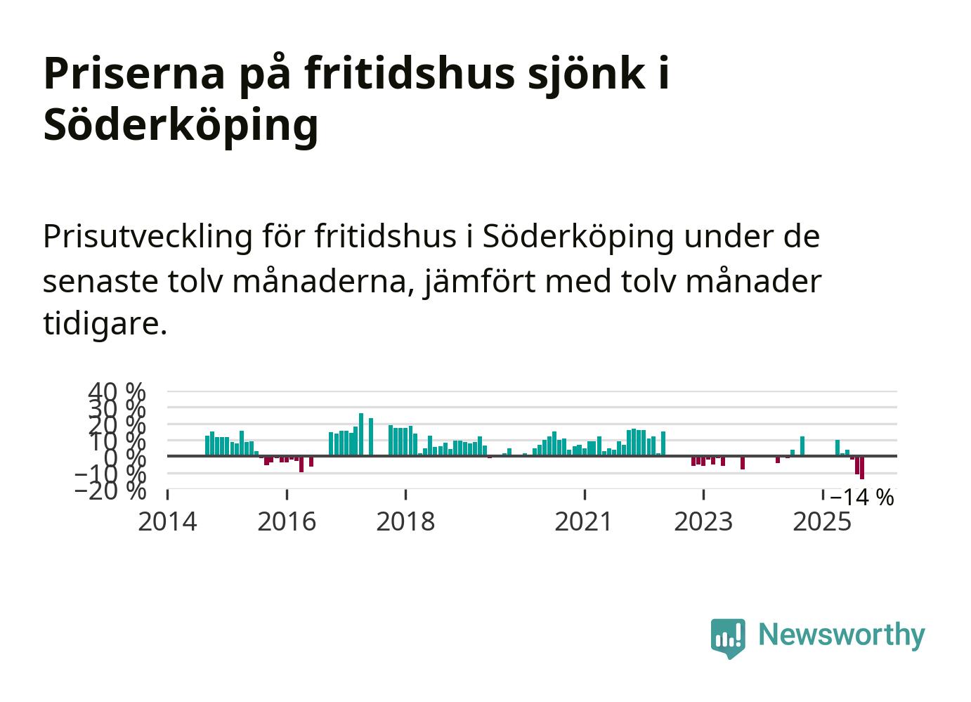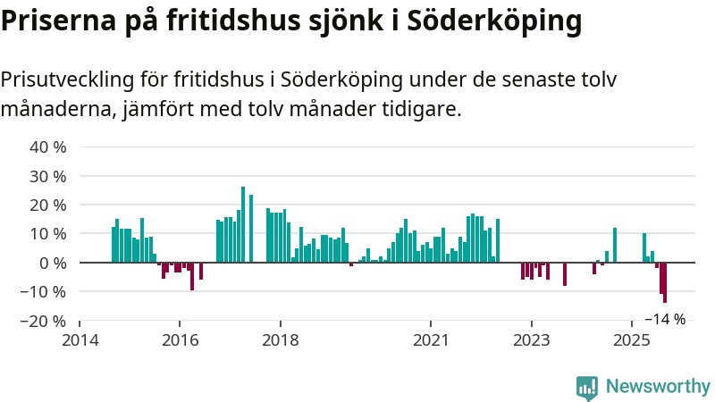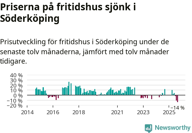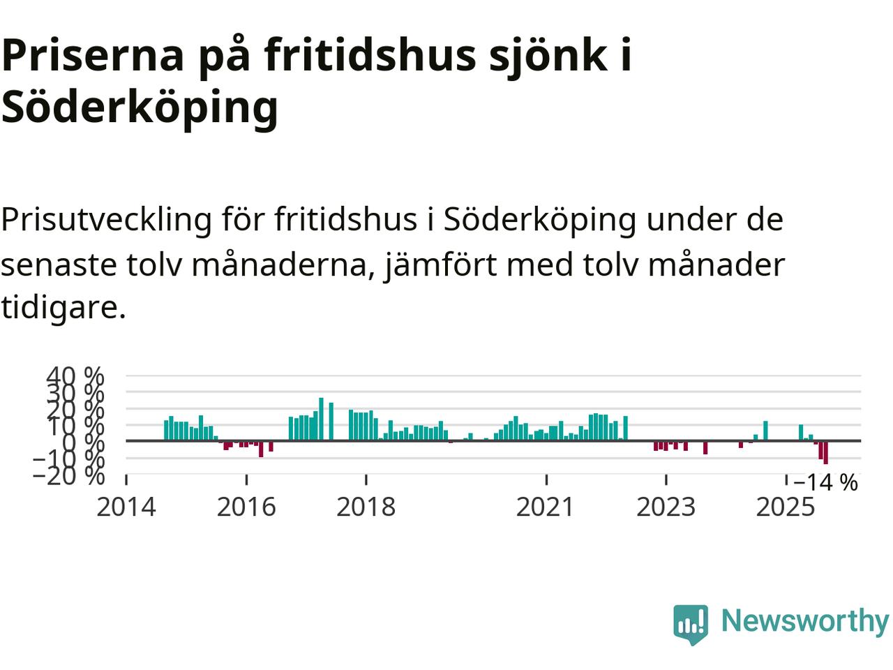 Priserna på fritidshus har gått ner i Söderköpings kommun. Medelpriset på försäljningarna under de senaste tolv månaderna visar på en nedgång med 14 procent.