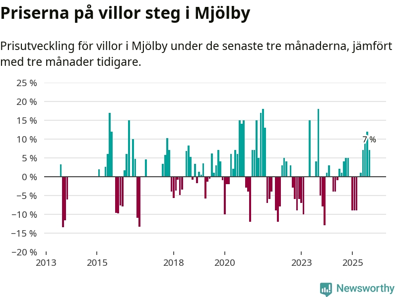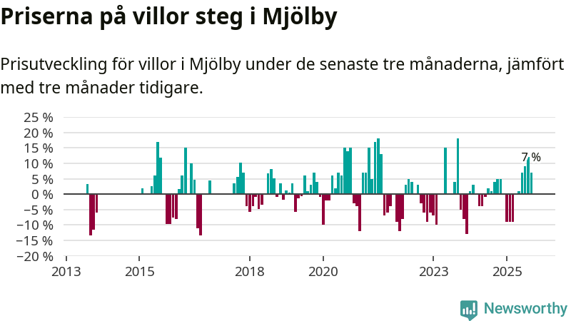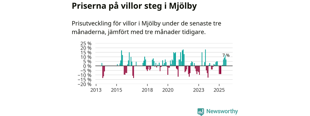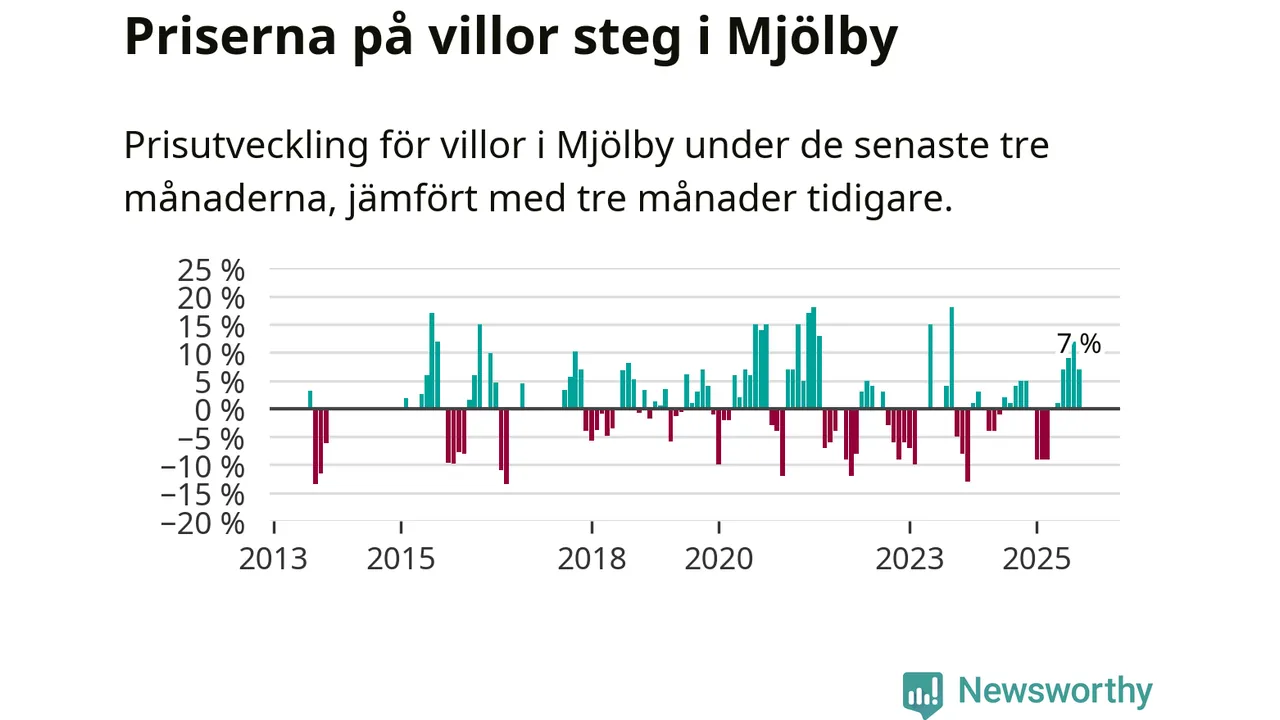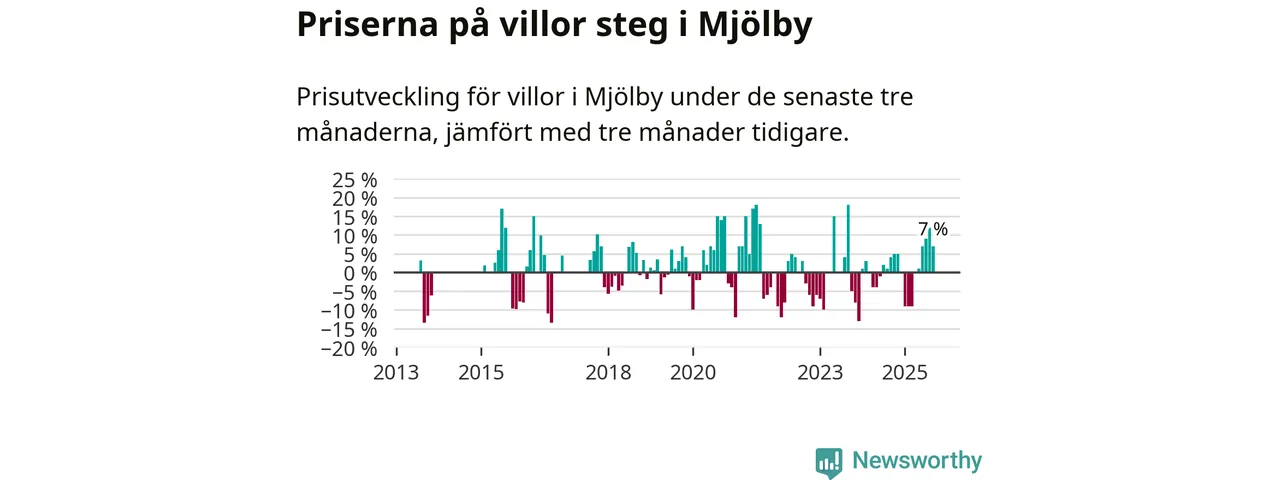 Villapriserna har gått upp i Mjölby kommun. Medelpriset på försäljningarna under de senaste tre månaderna visar på en uppgång med 7 procent.