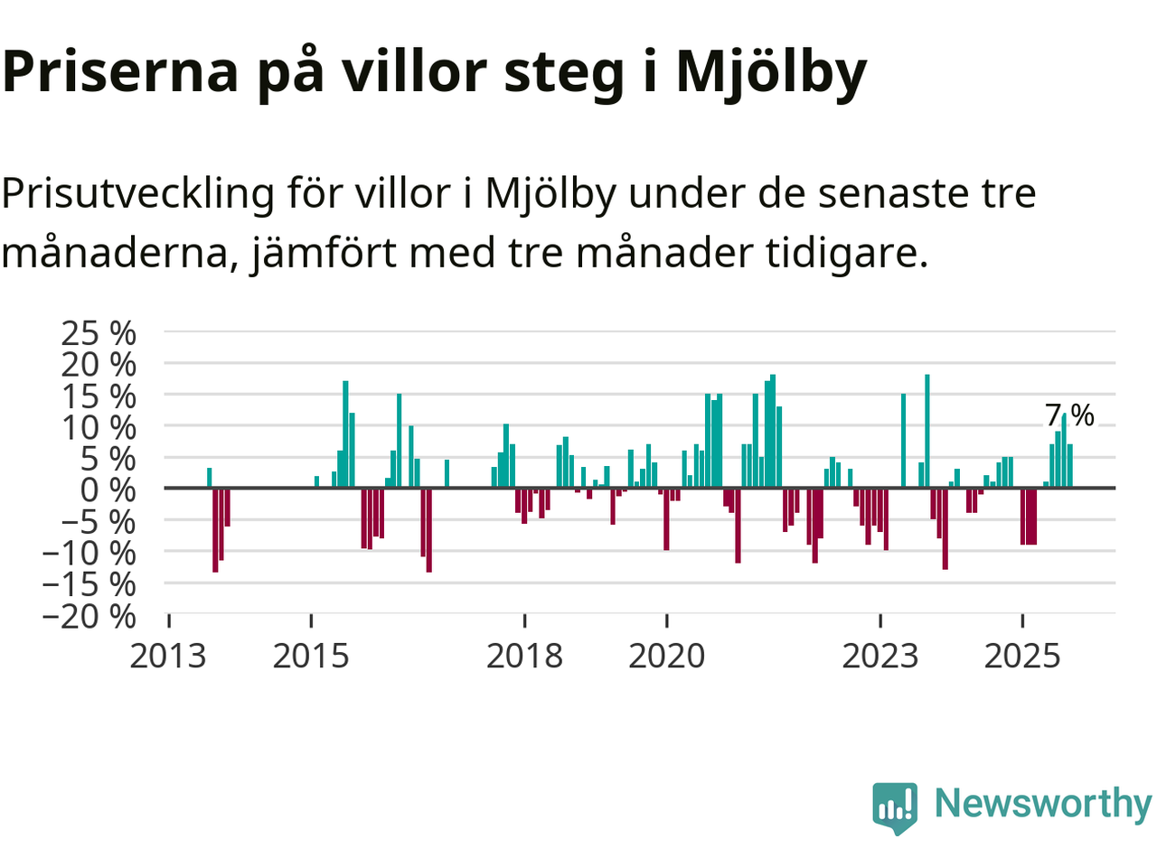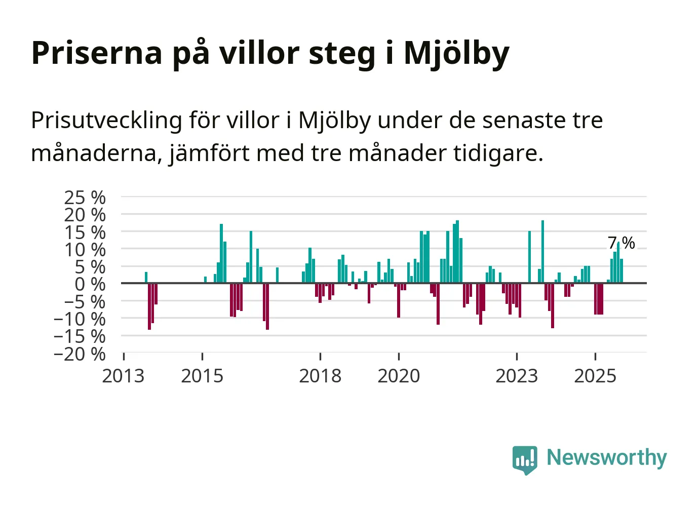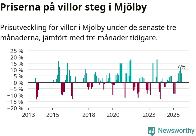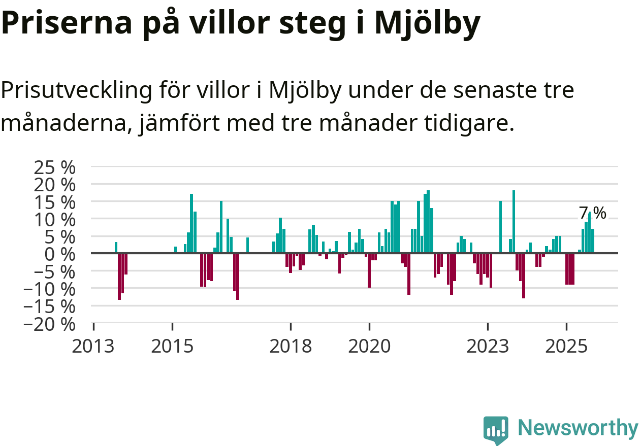 Villapriserna har gått upp i Mjölby kommun. Medelpriset på försäljningarna under de senaste tre månaderna visar på en uppgång med 7 procent.
