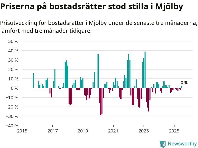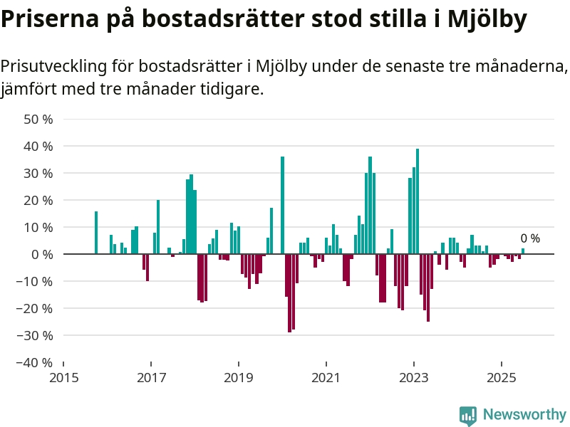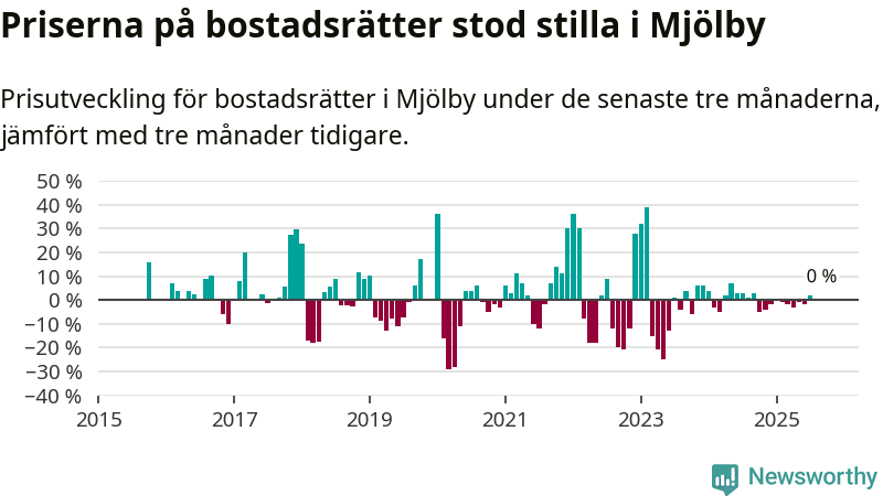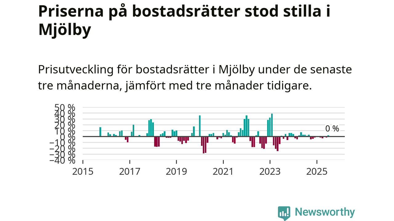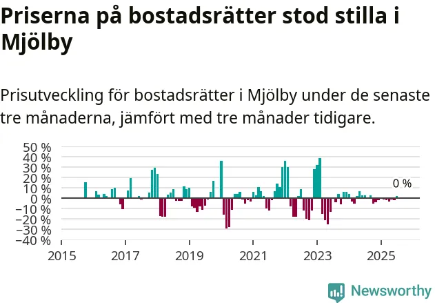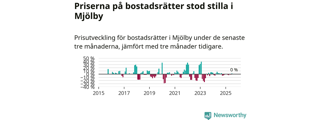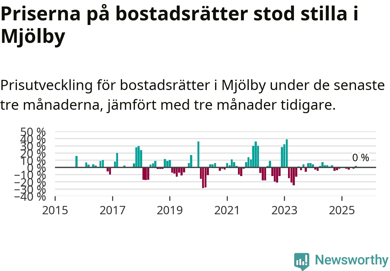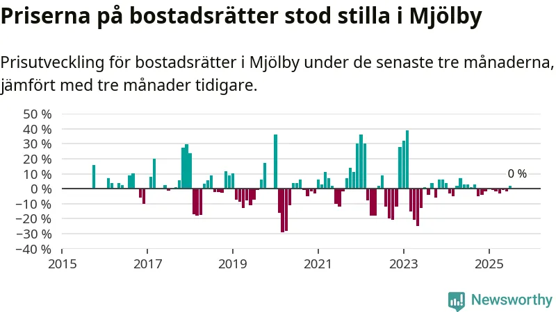 Priserna på bostadsrätter står i stort sett stilla i Mjölby kommun. Medelpriset på de på försäljningarna under de senaste tre månaderna låg på samma nivå som för tre månader sedan.