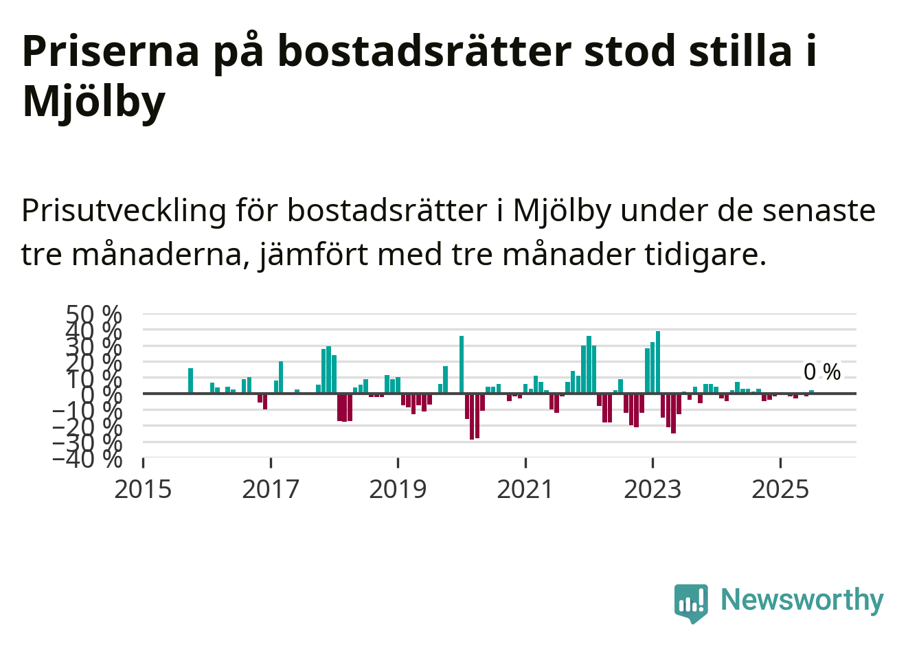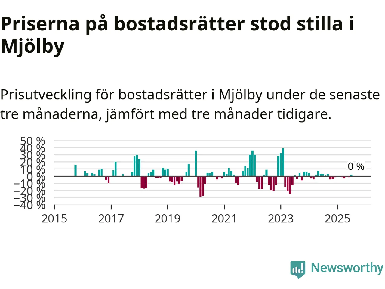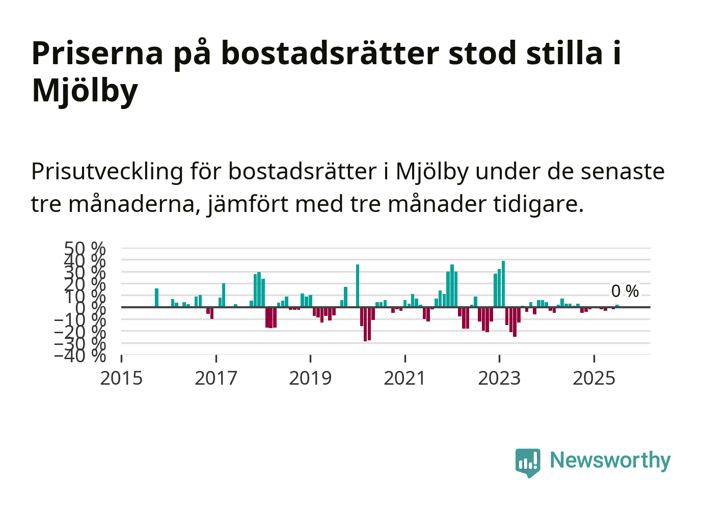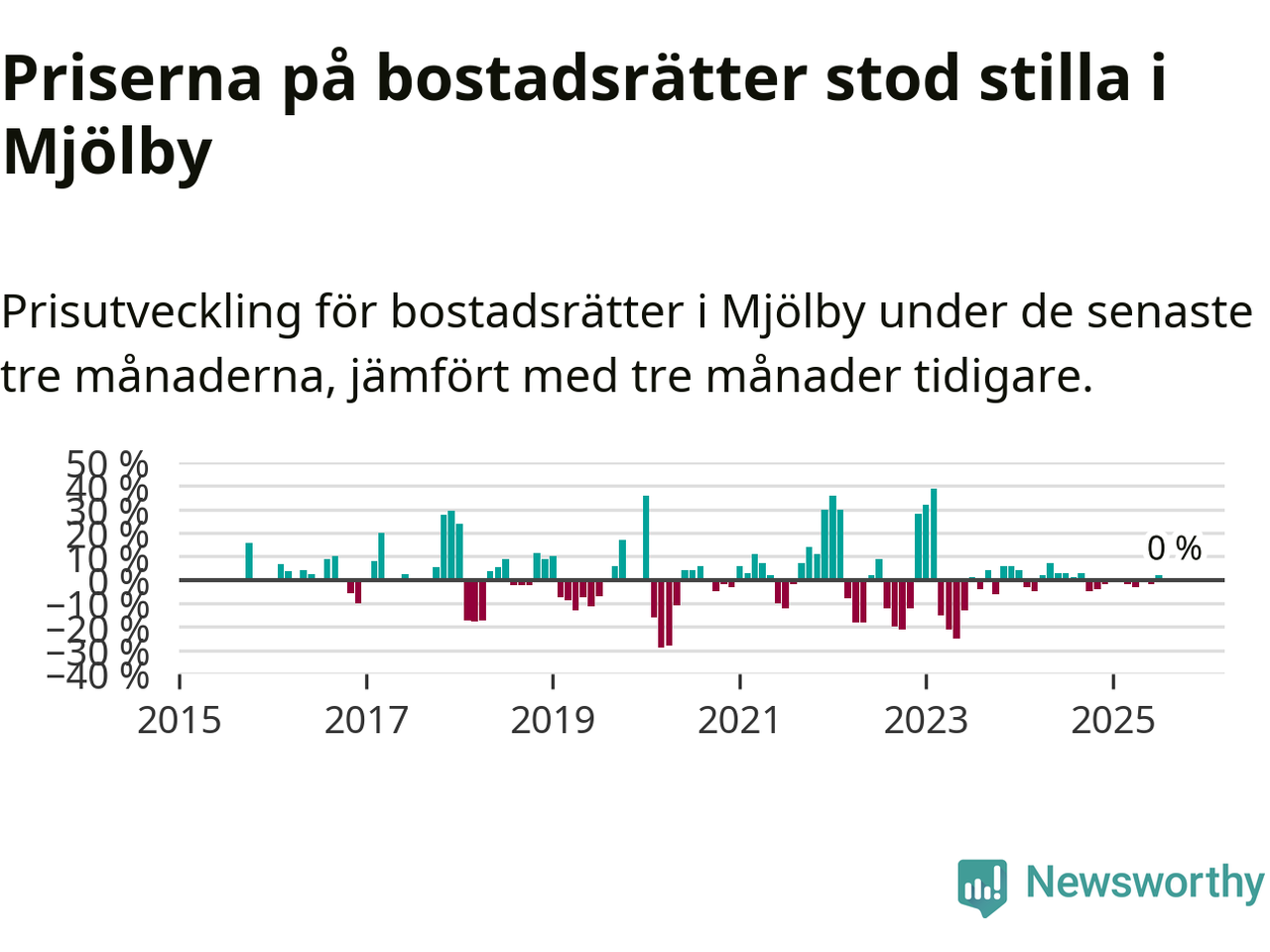 Priserna på bostadsrätter står i stort sett stilla i Mjölby kommun. Medelpriset på de på försäljningarna under de senaste tre månaderna låg på samma nivå som för tre månader sedan.