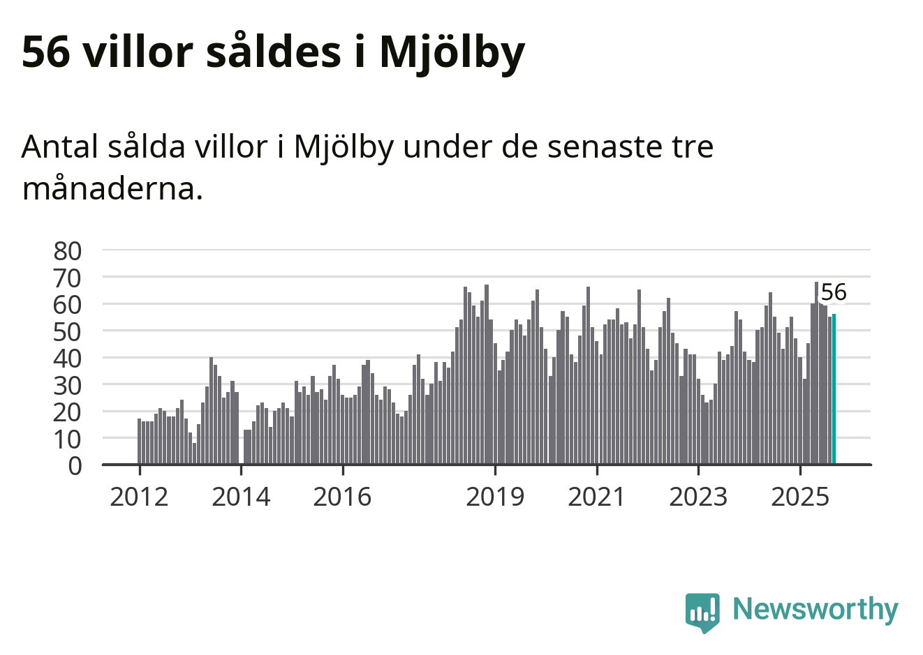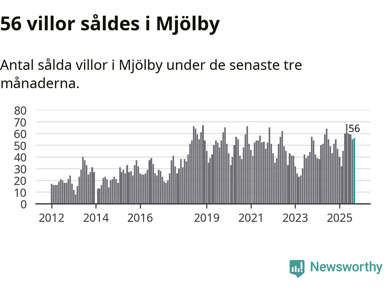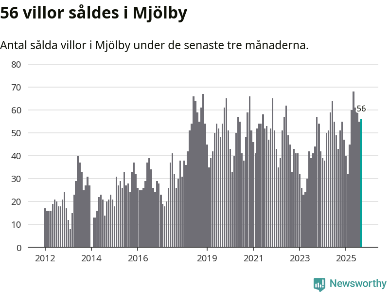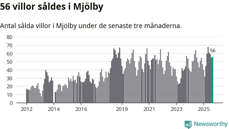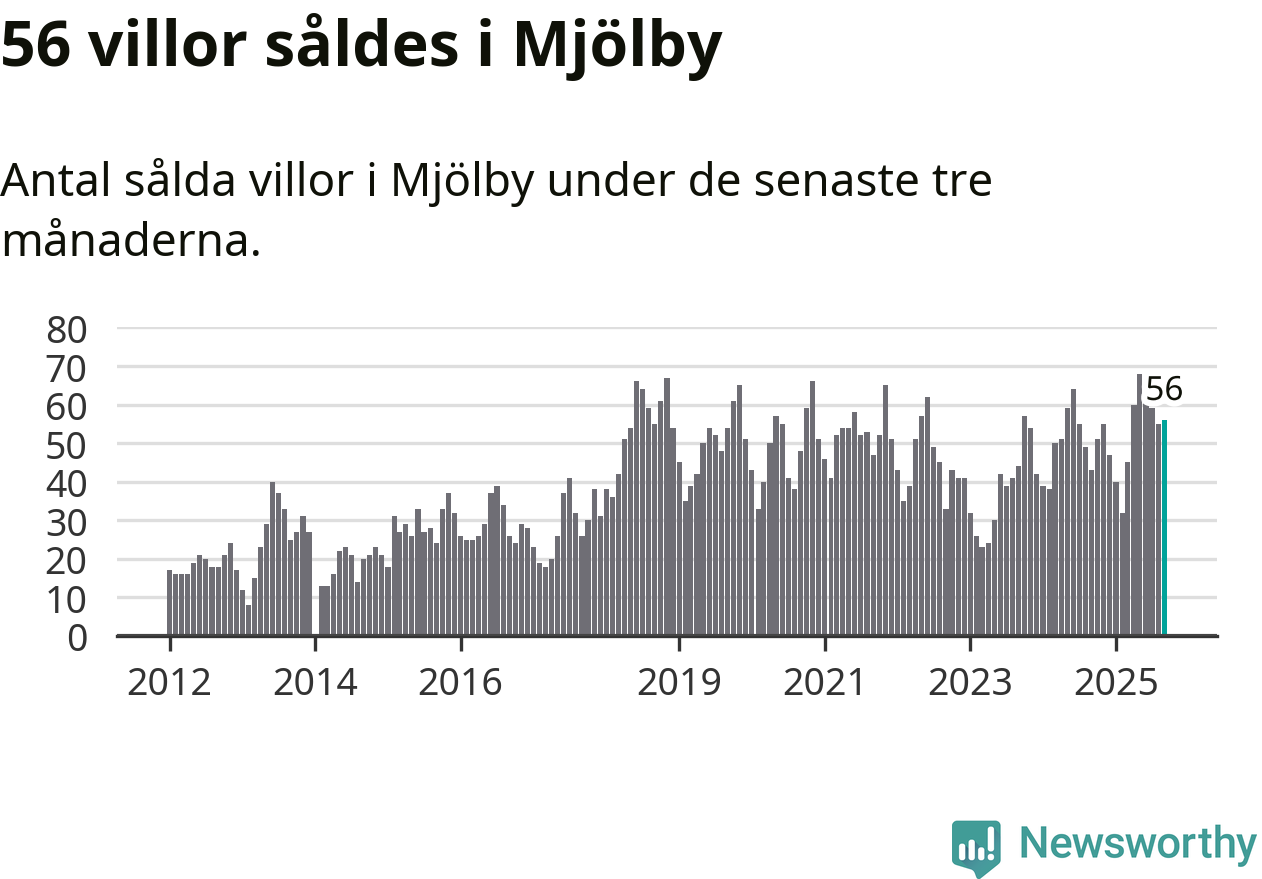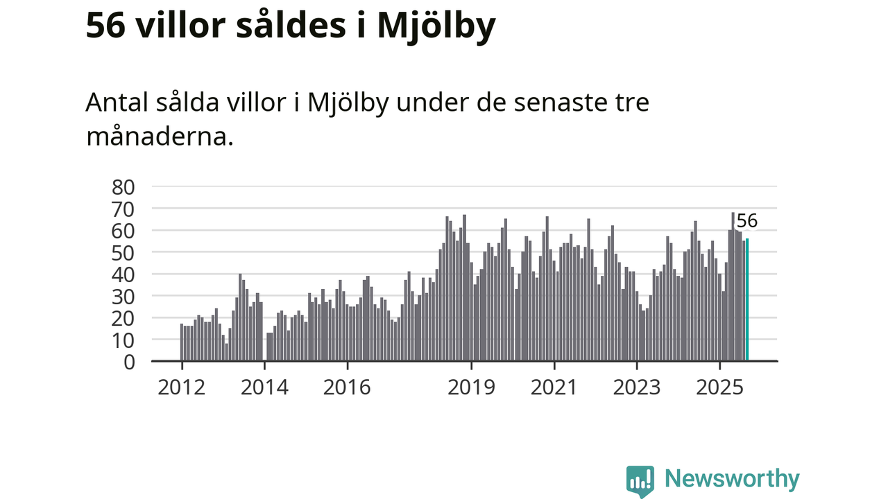 Sammanlagt såldes 56 villor i Mjölby kommun mellan juli och september till ett genomsnittligt pris på 3,0 miljoner kronor. I fjol gjordes 43 affärer vid den här tiden på året.