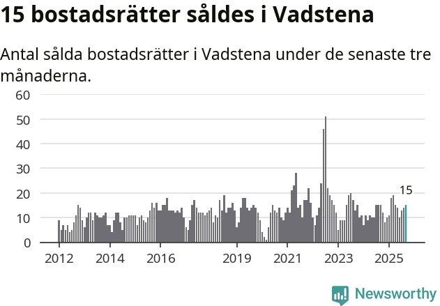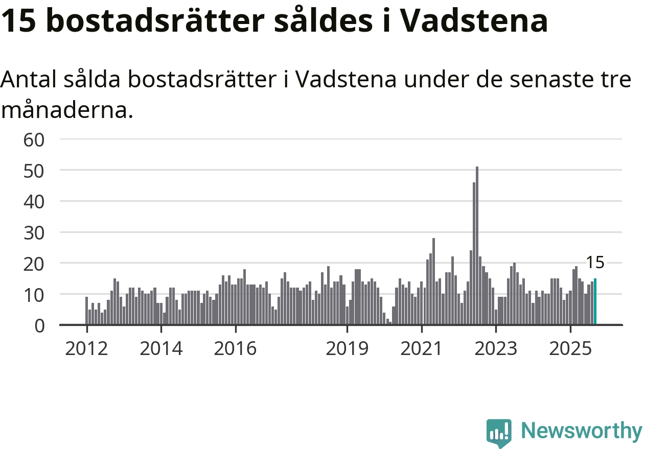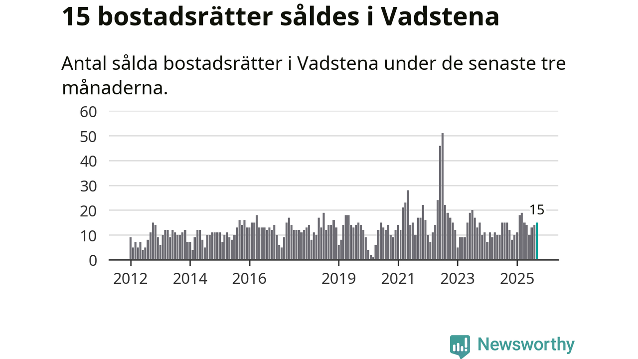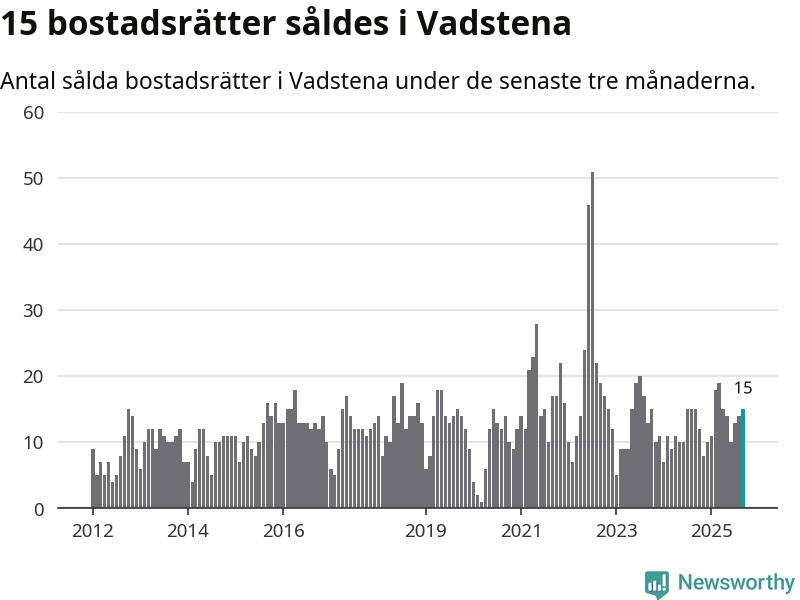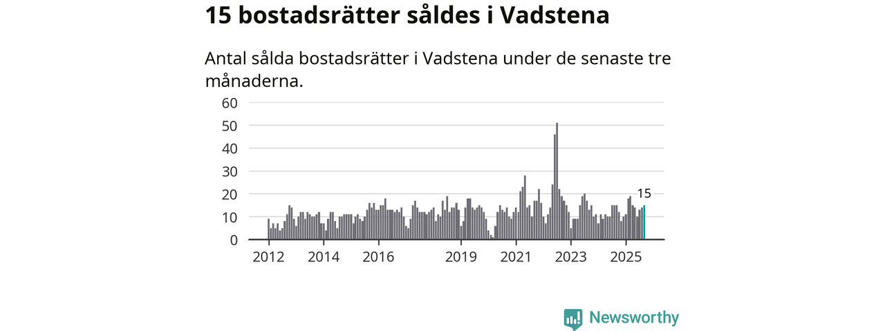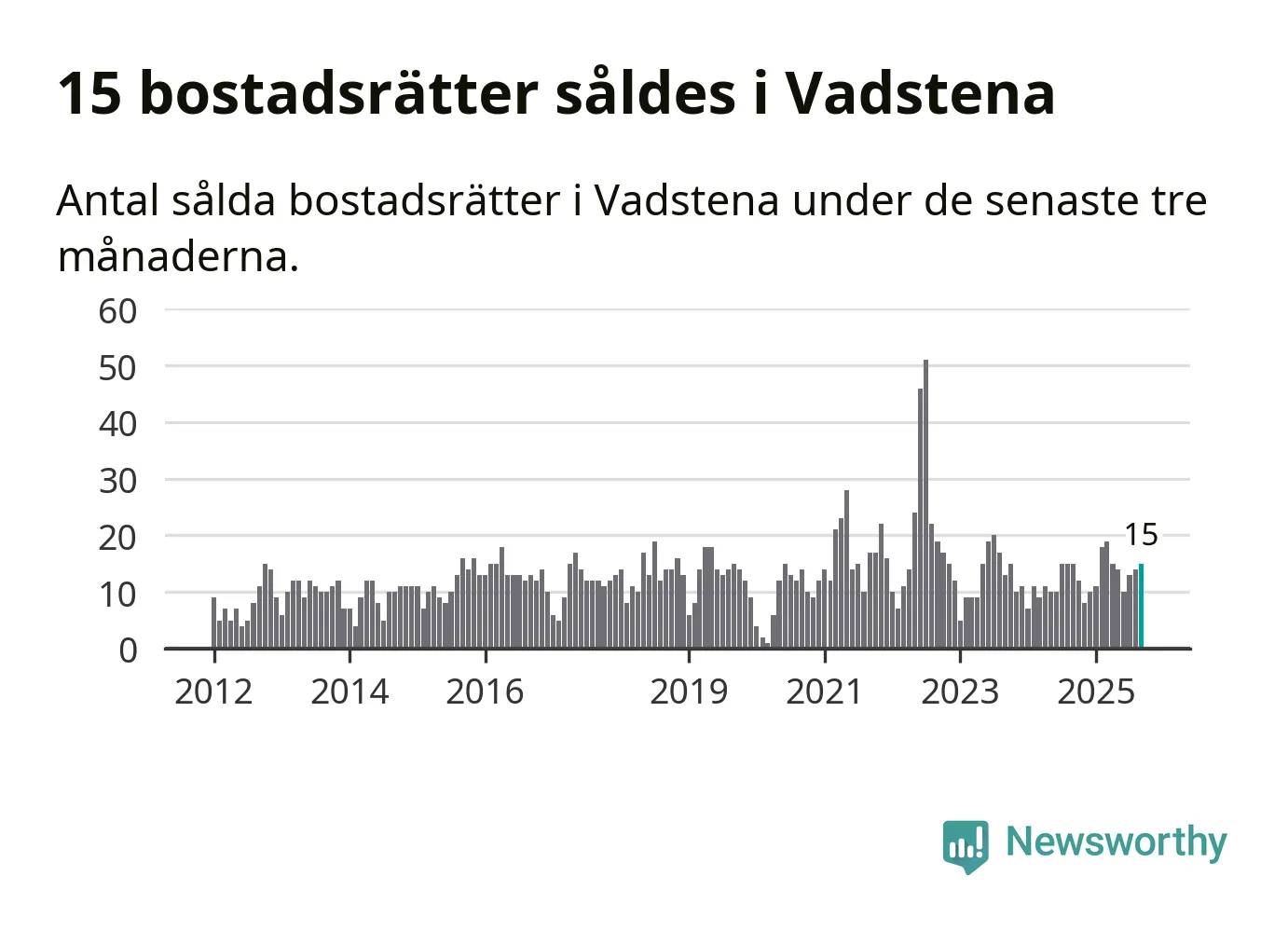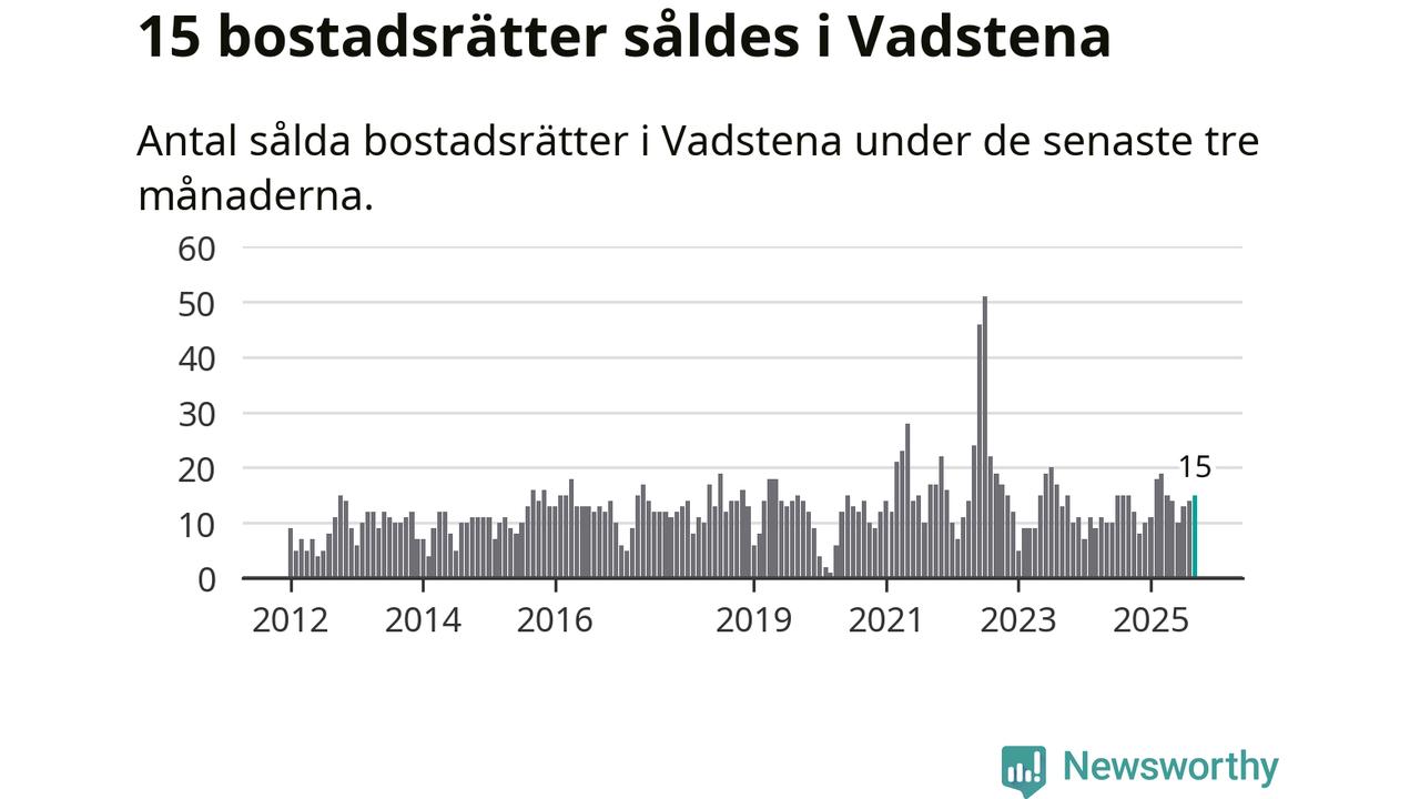 Mellan juli och september gjordes sammanlagt 15 affärer med bostadsrätter i Vadstena kommun. Det är lika många affärer som vid motsvarande tid i fjol.