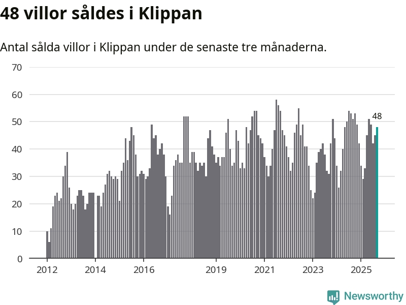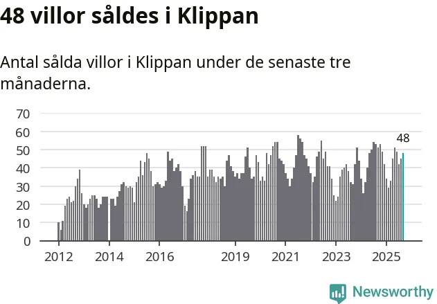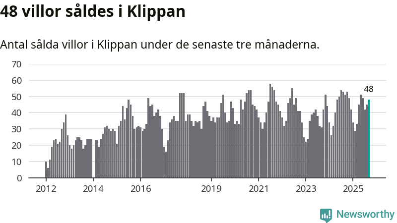 Sammanlagt såldes 48 villor i Klippans kommun mellan juli och september till ett genomsnittligt pris på 1,7 miljoner kronor. I fjol gjordes 51 affärer vid den här tiden på året.