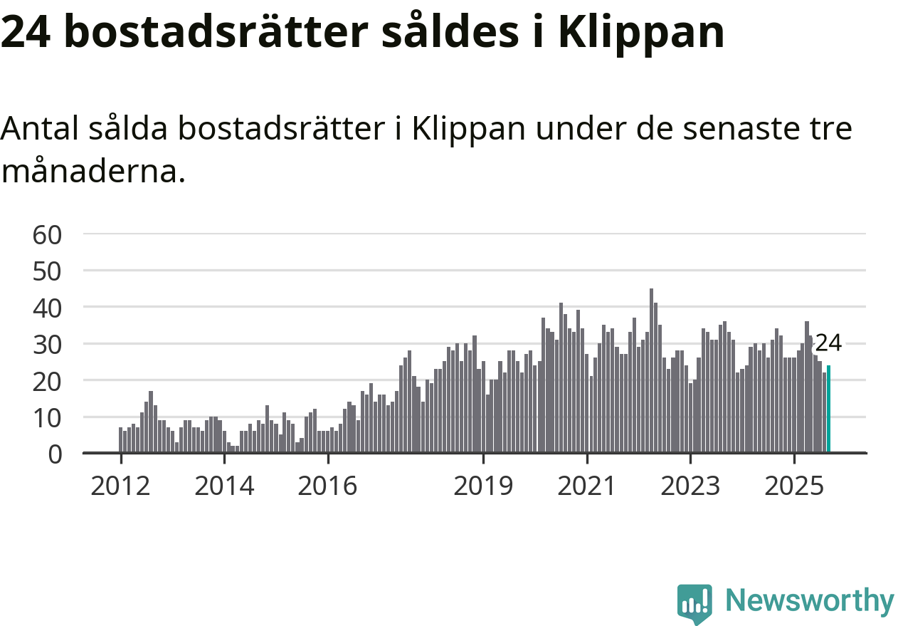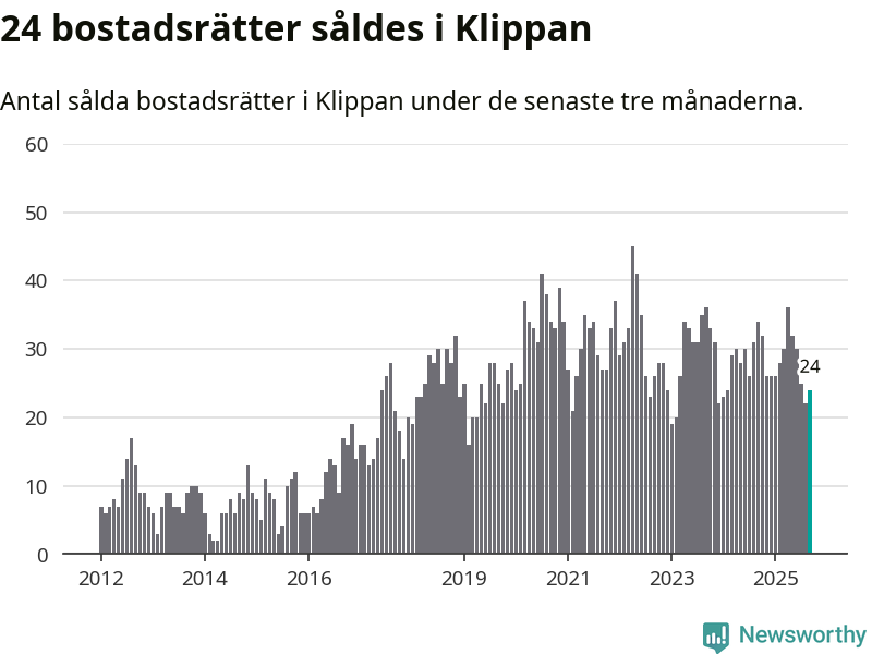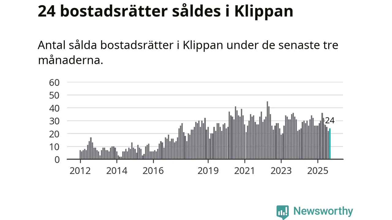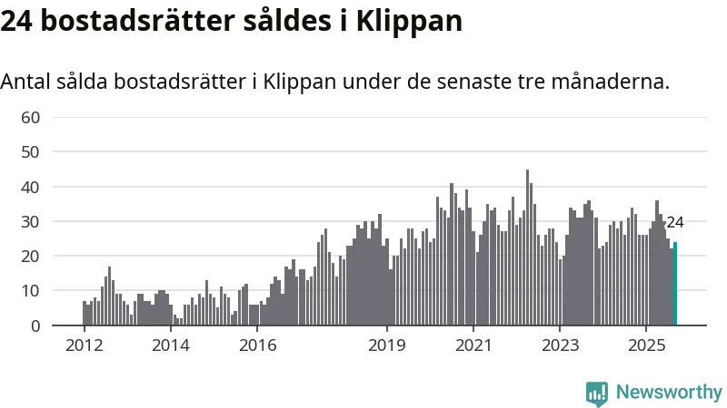 Mellan juli och september såldes 24 bostadsrätter i Klippans kommun. Det är relativt få sett till aktiviteten på bostadsmarknaden i kommunen under de senaste tolv månaderna, samt det historiska snittet för den här tiden på året.