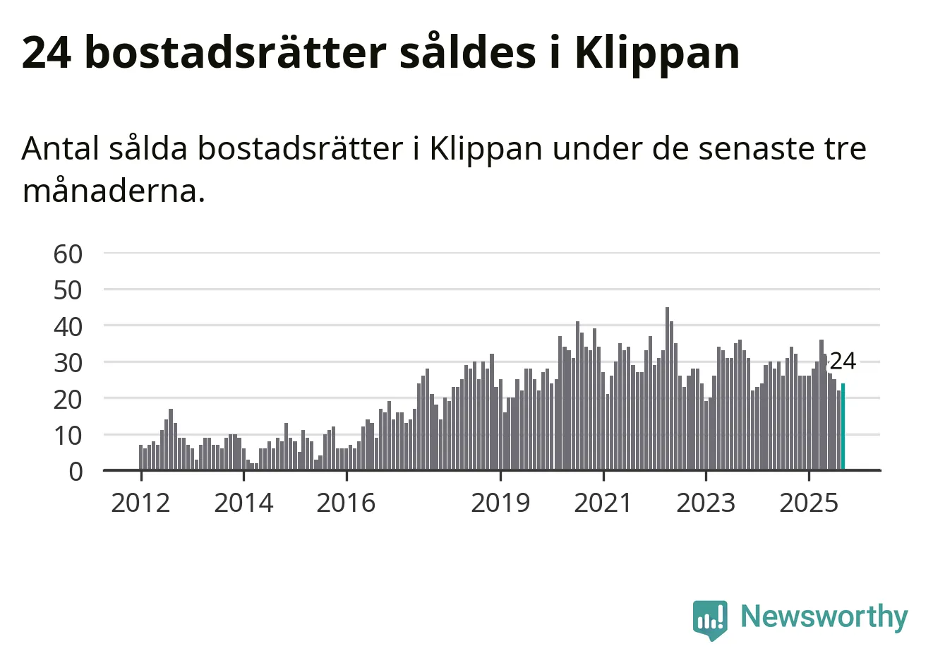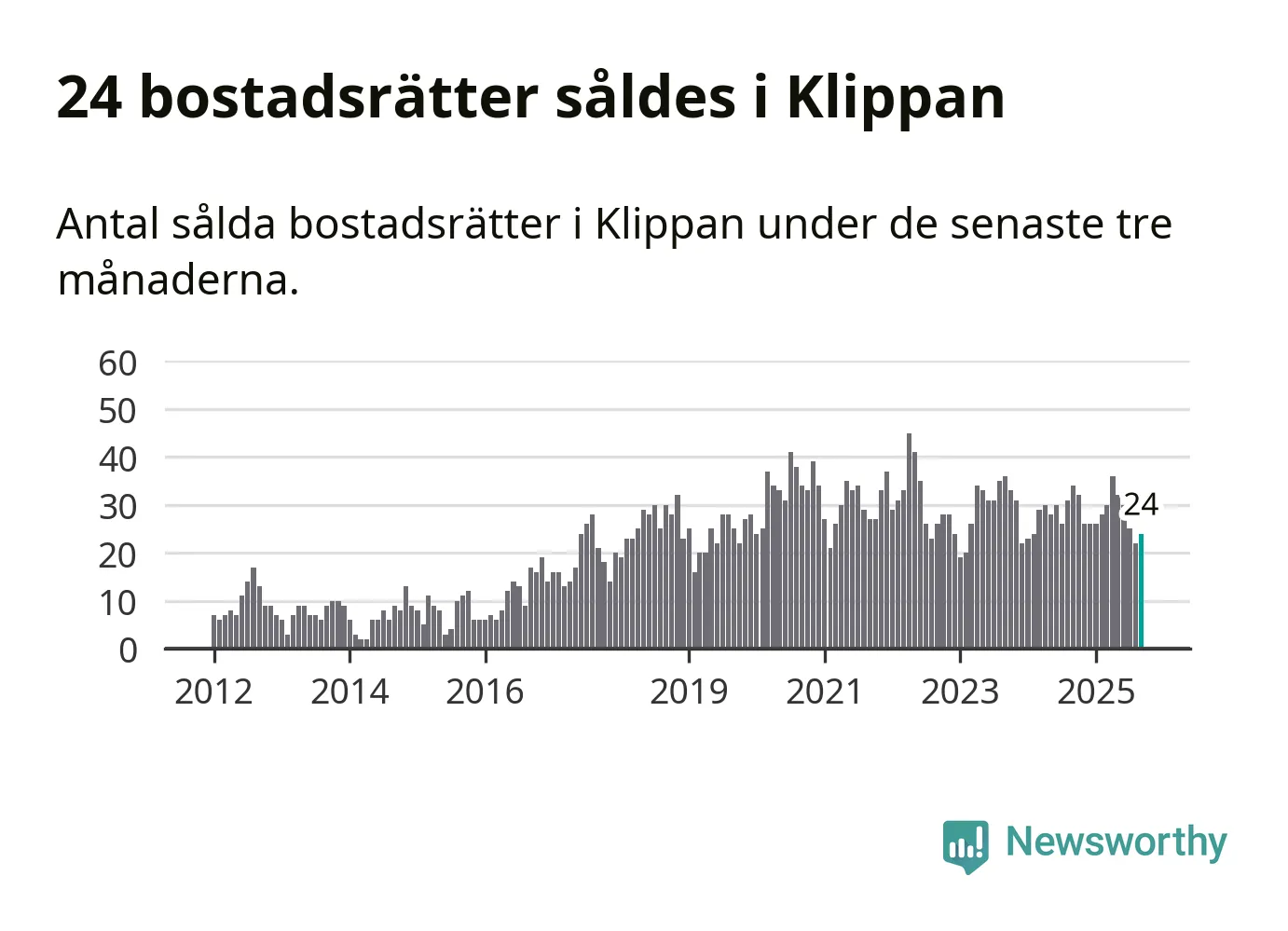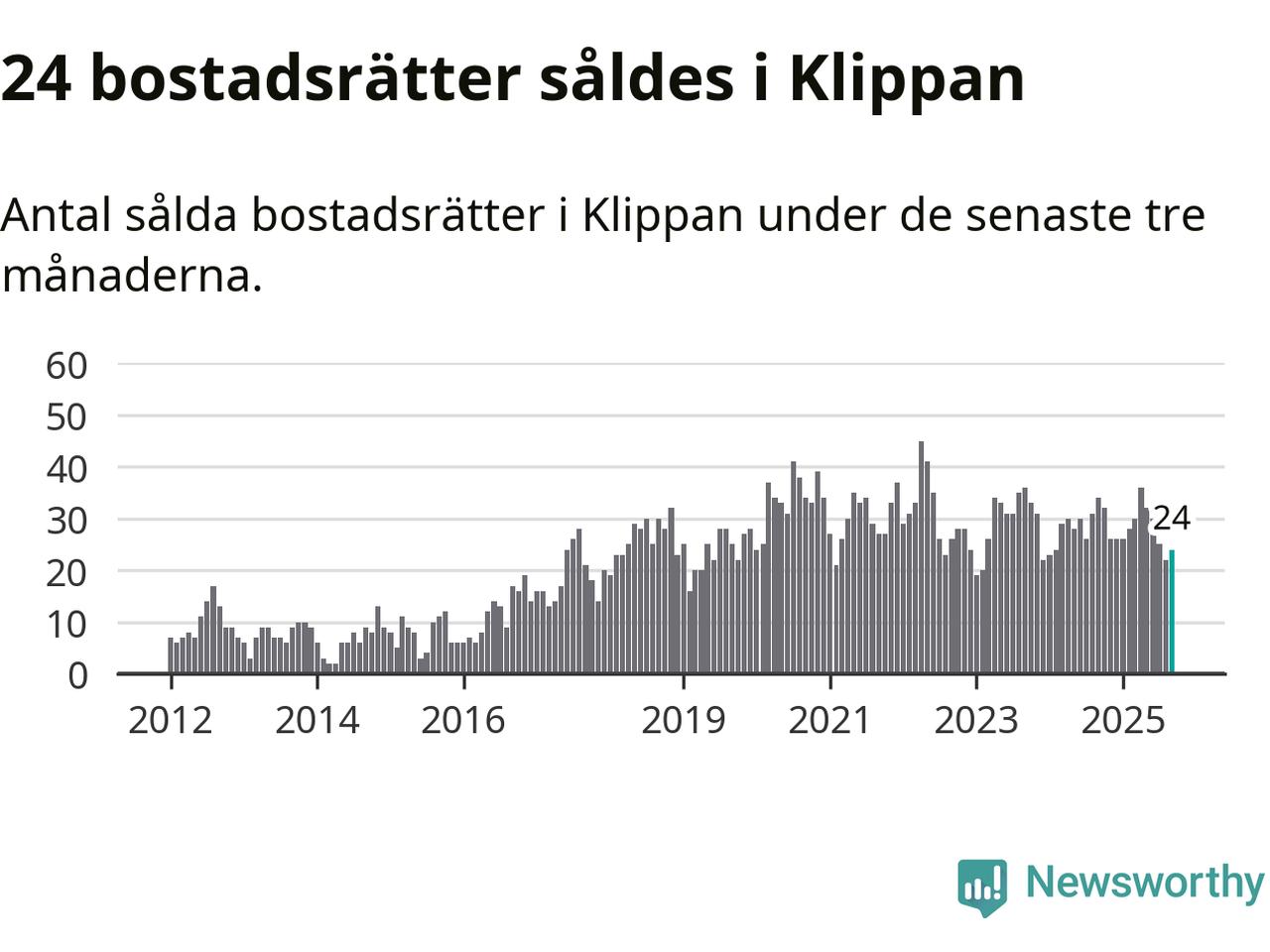 Mellan juli och september såldes 24 bostadsrätter i Klippans kommun. Det är relativt få sett till aktiviteten på bostadsmarknaden i kommunen under de senaste tolv månaderna, samt det historiska snittet för den här tiden på året.