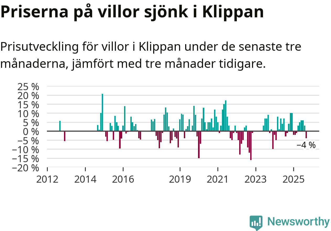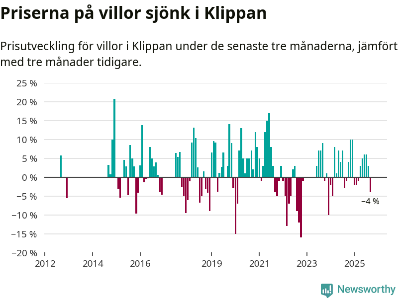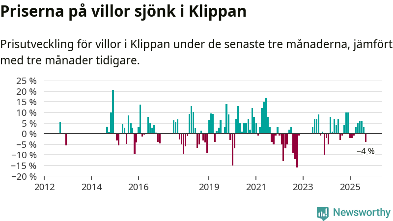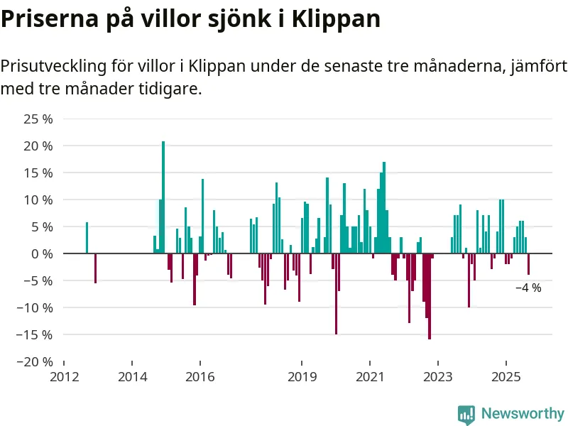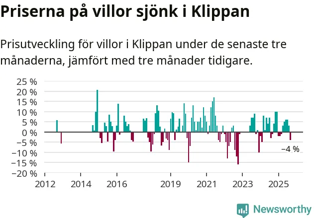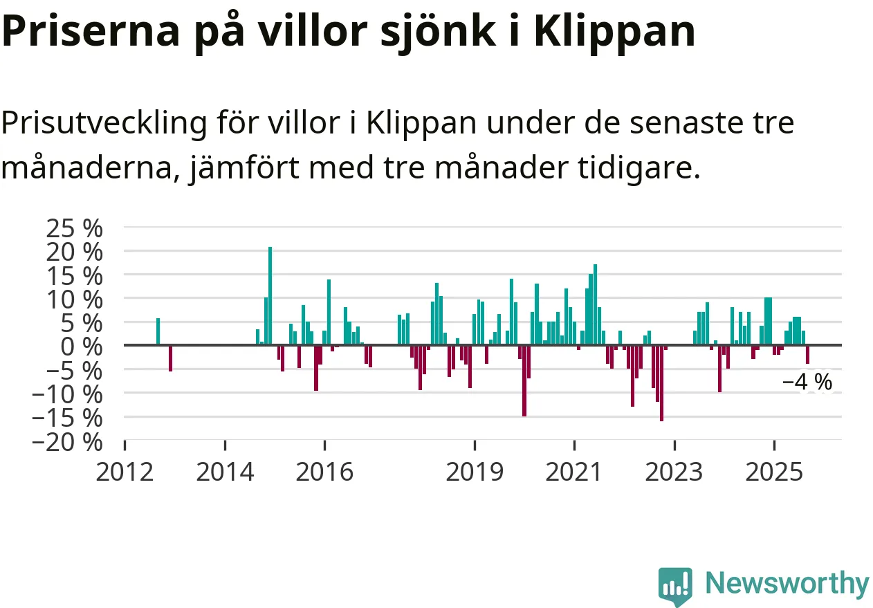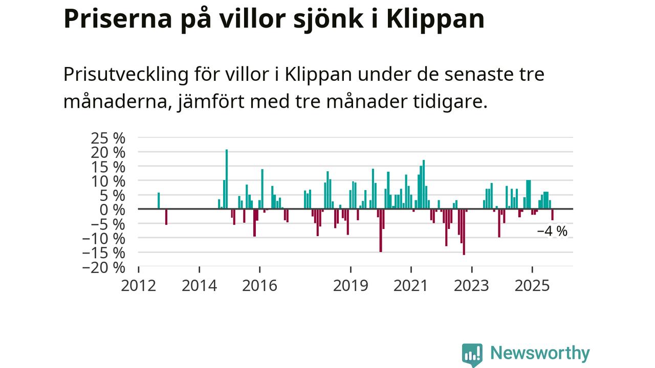 Villapriserna har gått ner i Klippans kommun. Medelpriset på försäljningarna under de senaste tre månaderna visar på en nedgång med 4 procent.