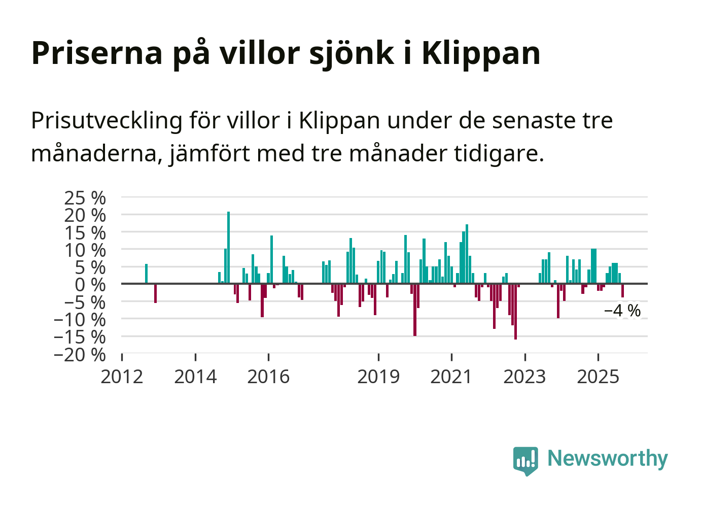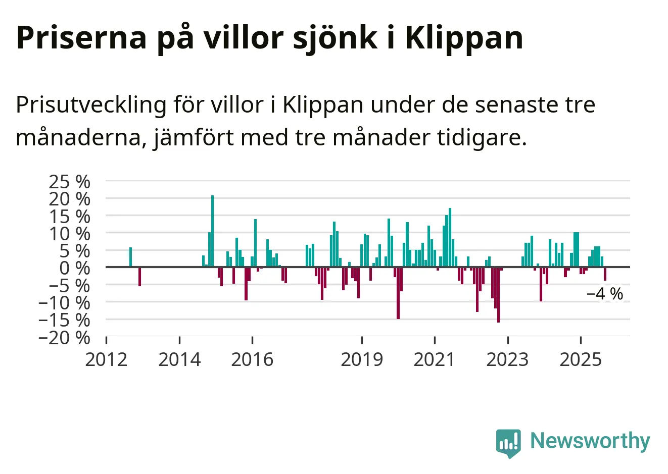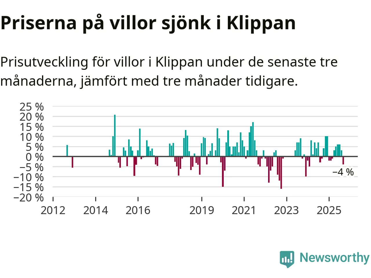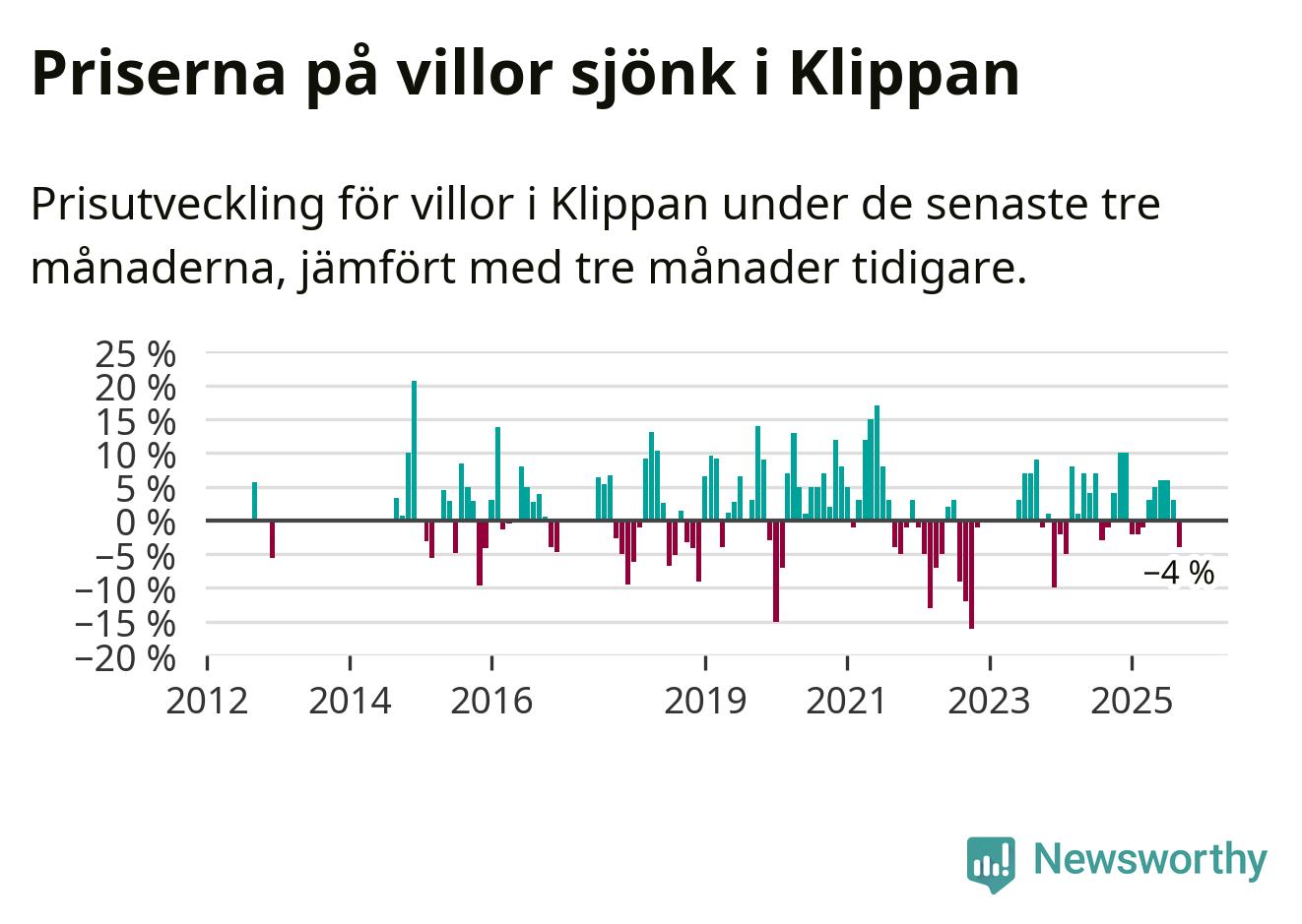 Villapriserna har gått ner i Klippans kommun. Medelpriset på försäljningarna under de senaste tre månaderna visar på en nedgång med 4 procent.