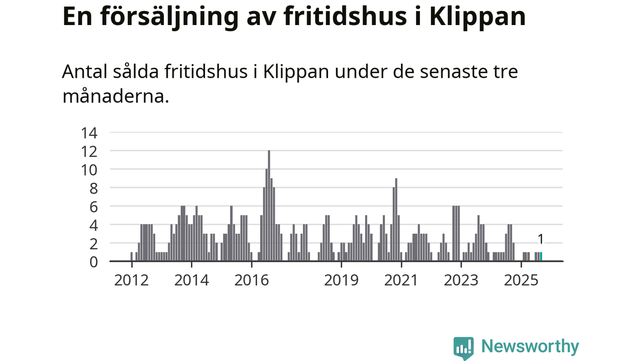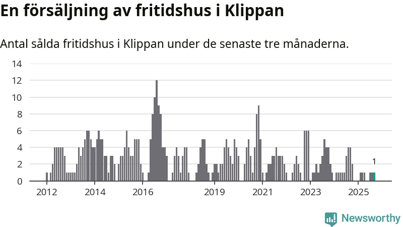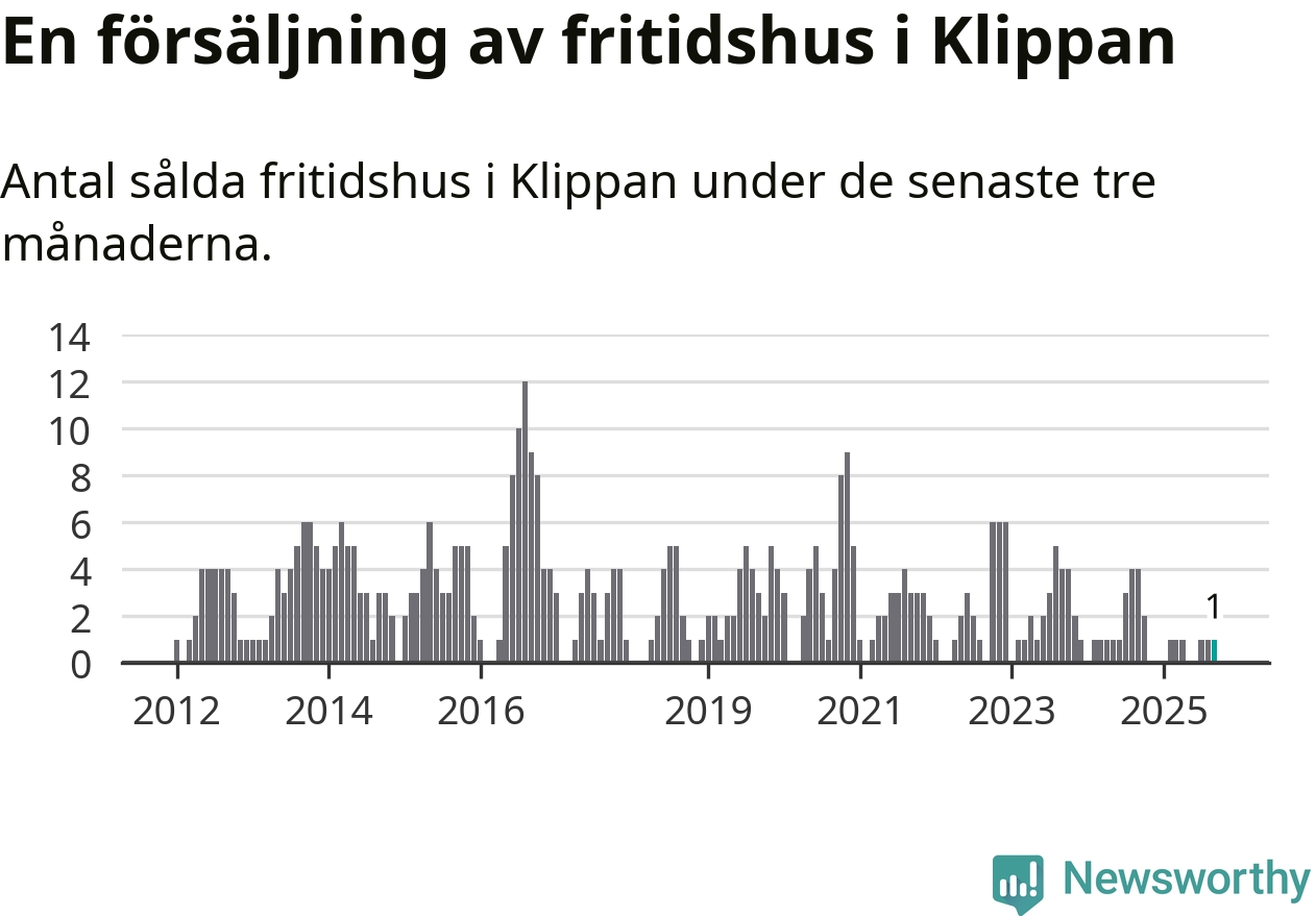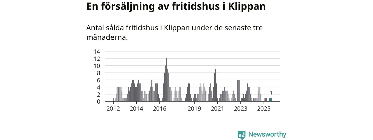 Mellan juli och september gjordes sammanlagt en affär med fritidshus i Klippans kommun. Det kan jämföras med fyra vid motsvarande tid i fjol.