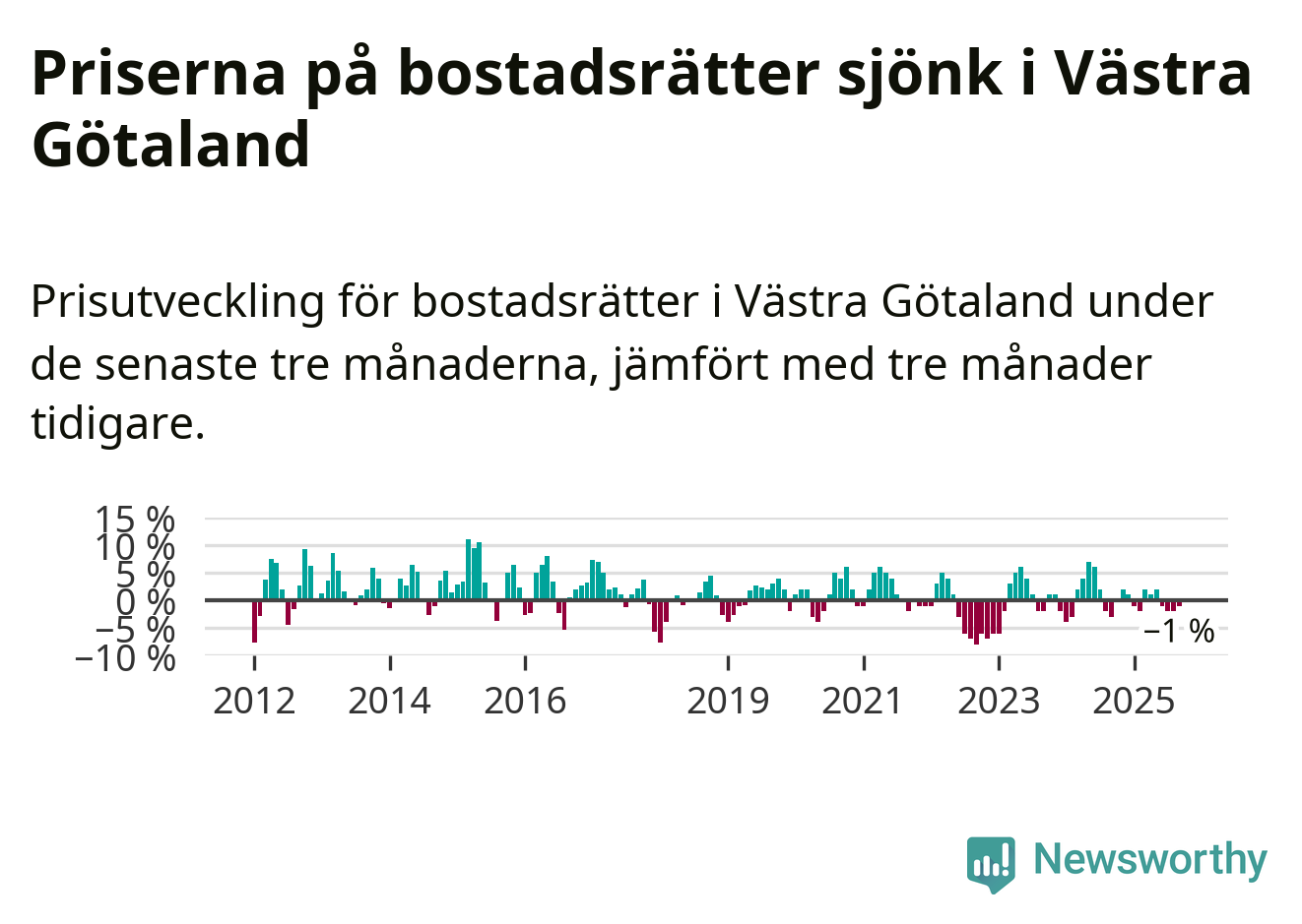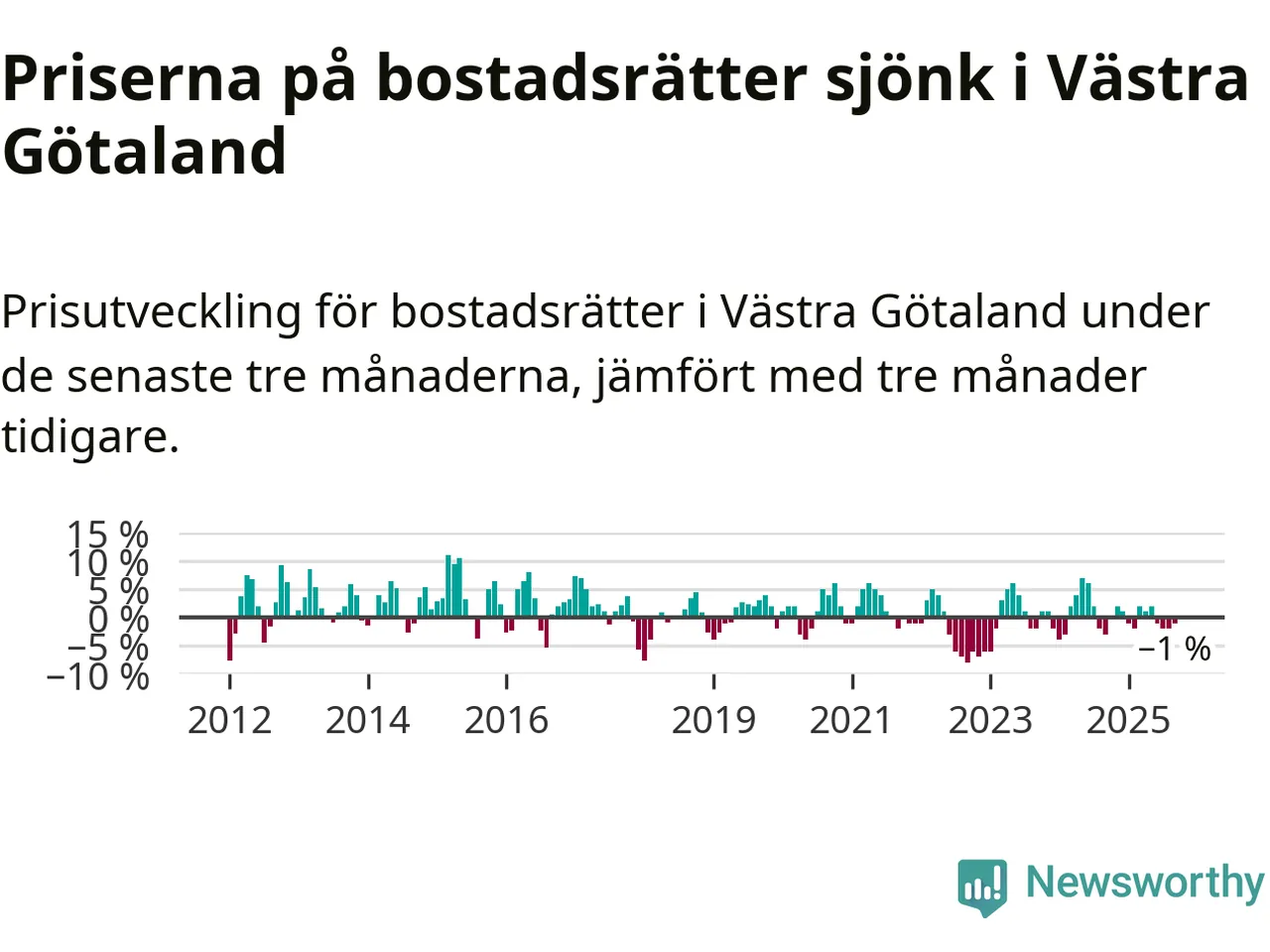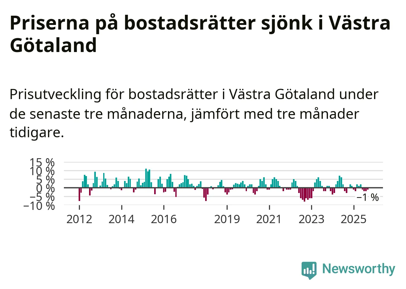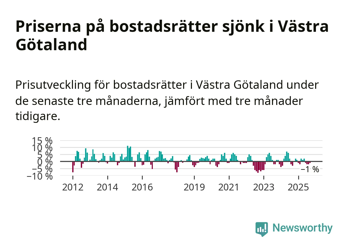 Priserna på bostadsrätter har gått ner i Västra Götalands län. Medelpriset på försäljningarna under de senaste tre månaderna visar på en nedgång med 1 procent.