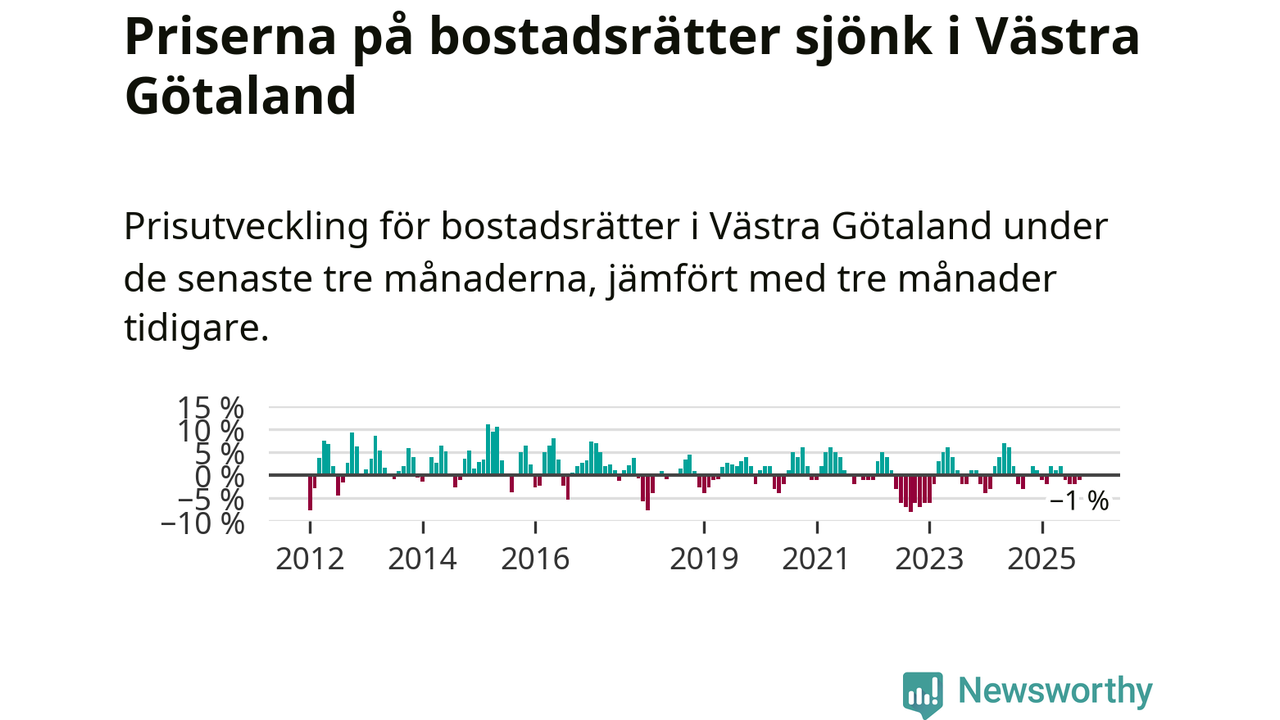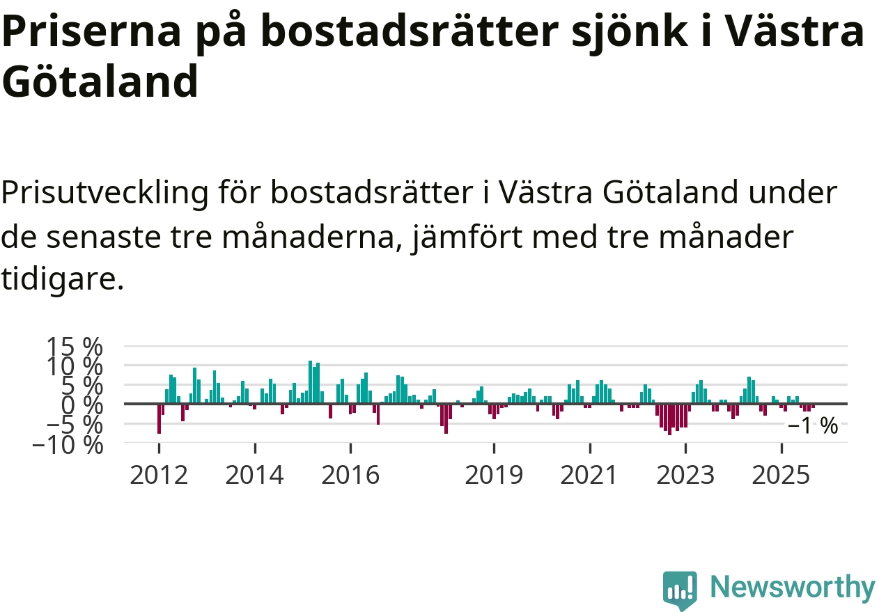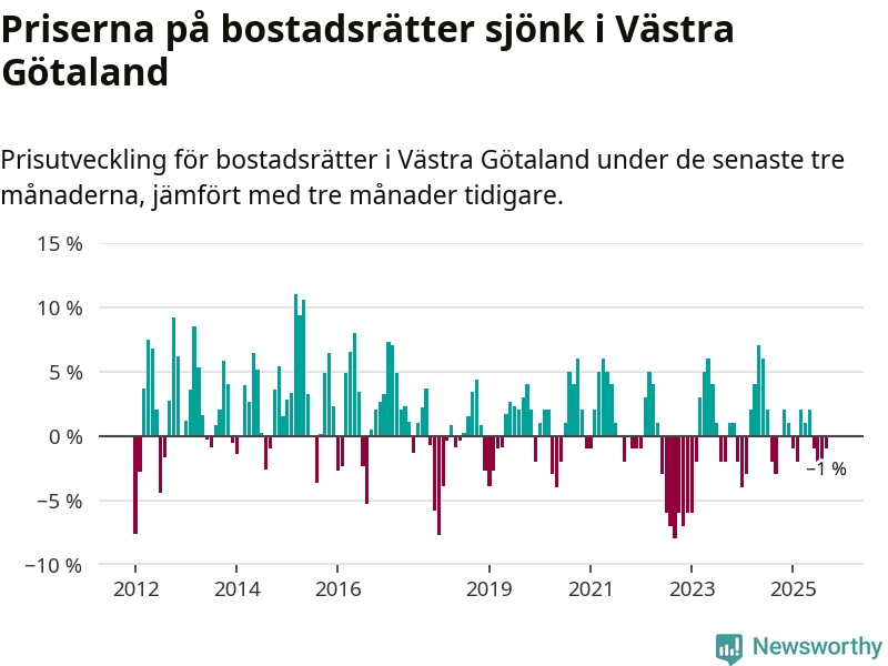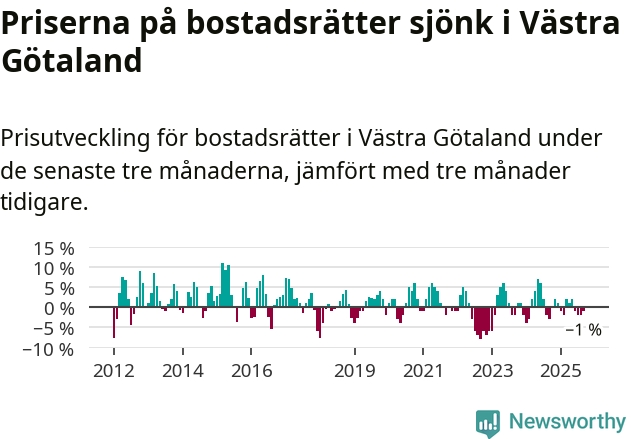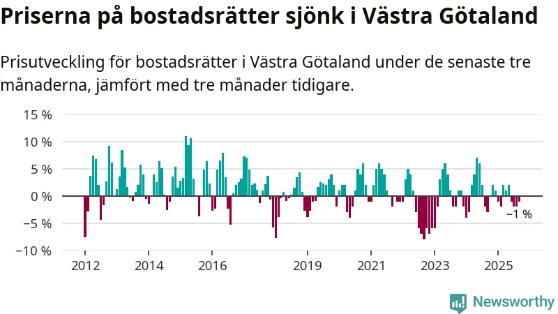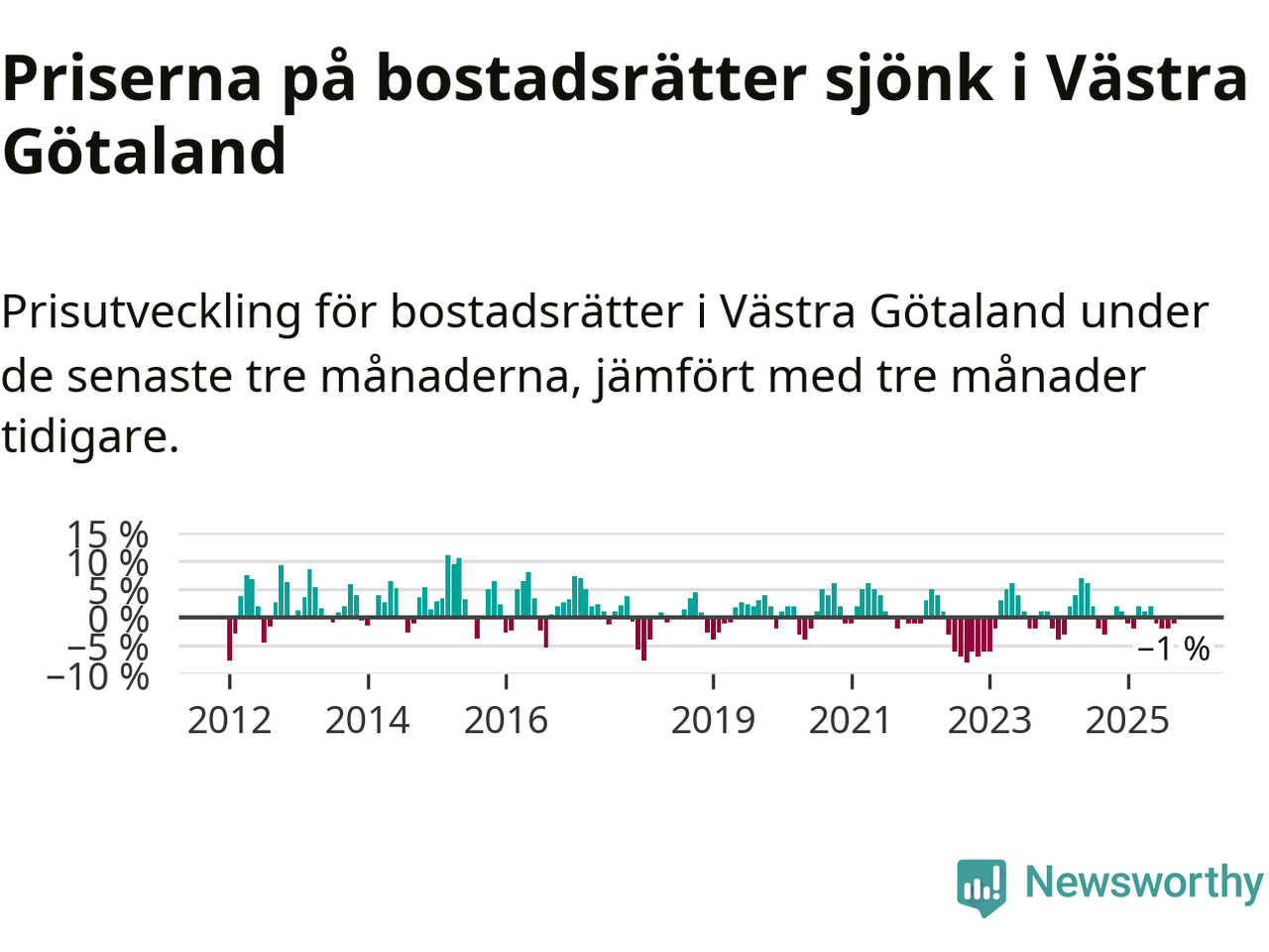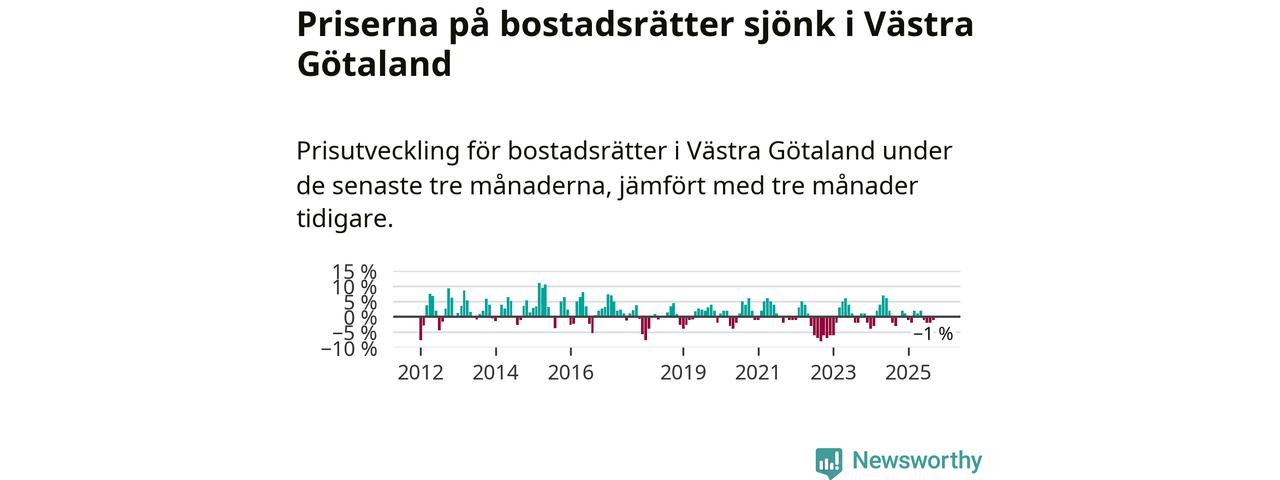 Priserna på bostadsrätter har gått ner i Västra Götalands län. Medelpriset på försäljningarna under de senaste tre månaderna visar på en nedgång med 1 procent.