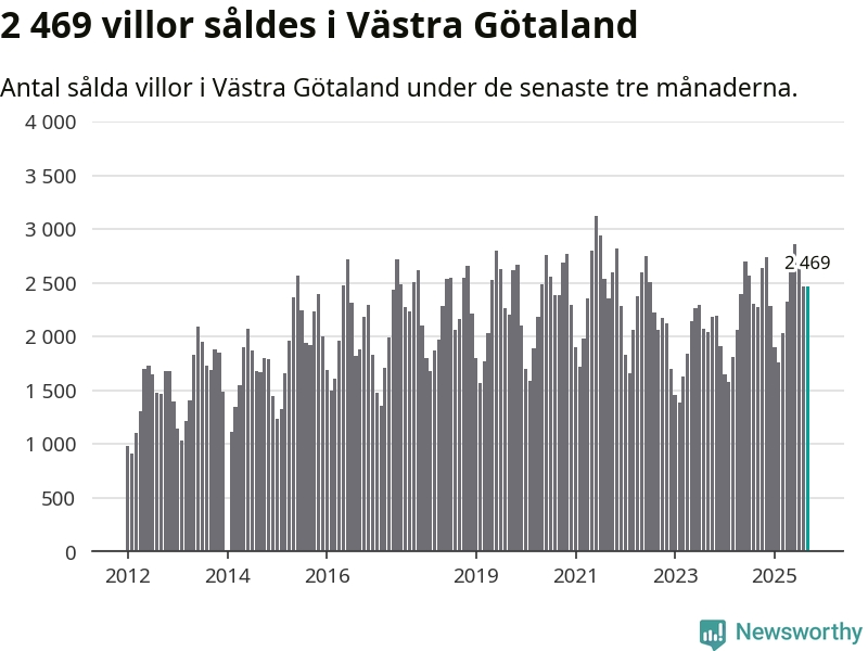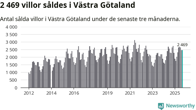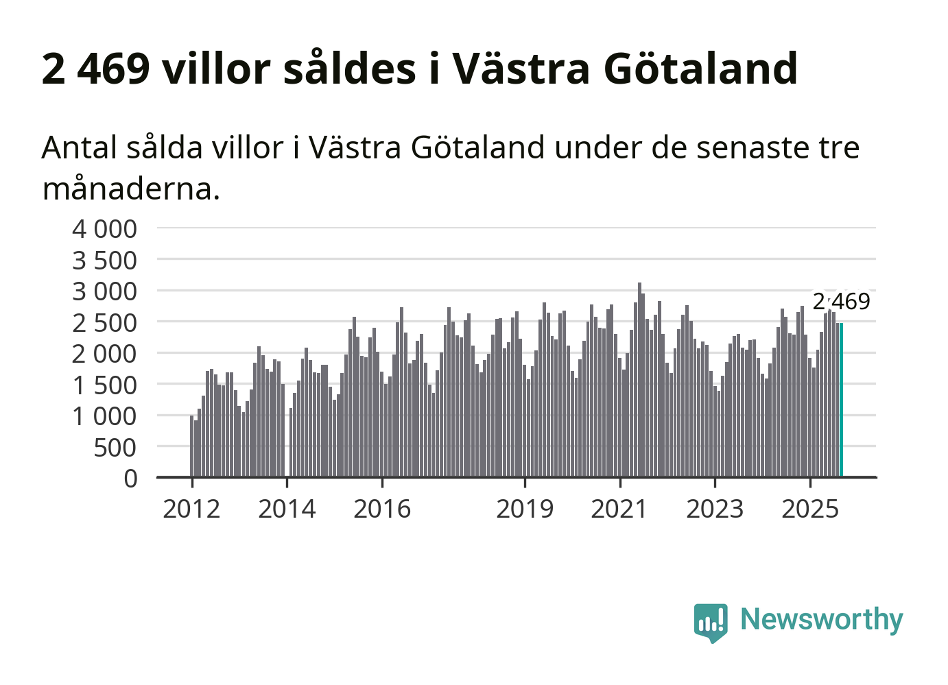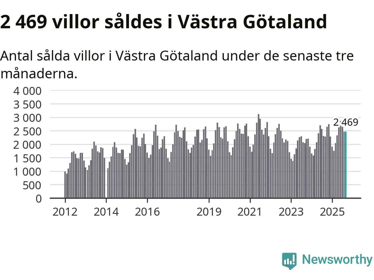 Sammanlagt såldes 2 469 villor i Västra Götalands län mellan juli och september till ett genomsnittligt pris på 4,0 miljoner kronor. I fjol gjordes 2 281 affärer vid den här tiden på året.