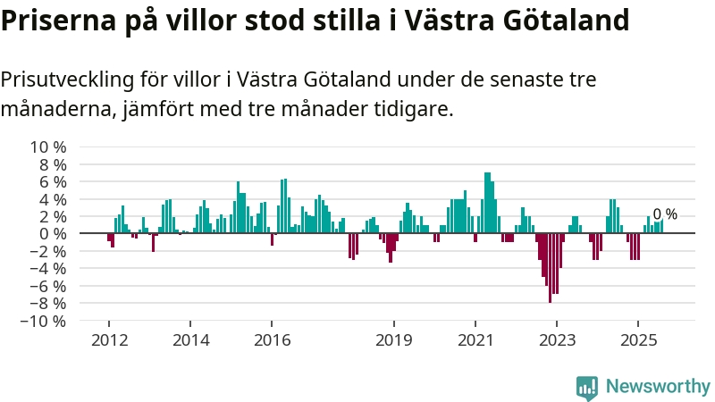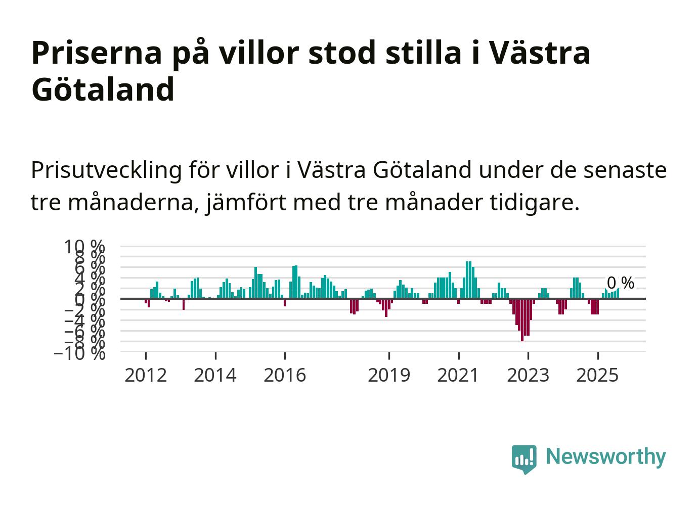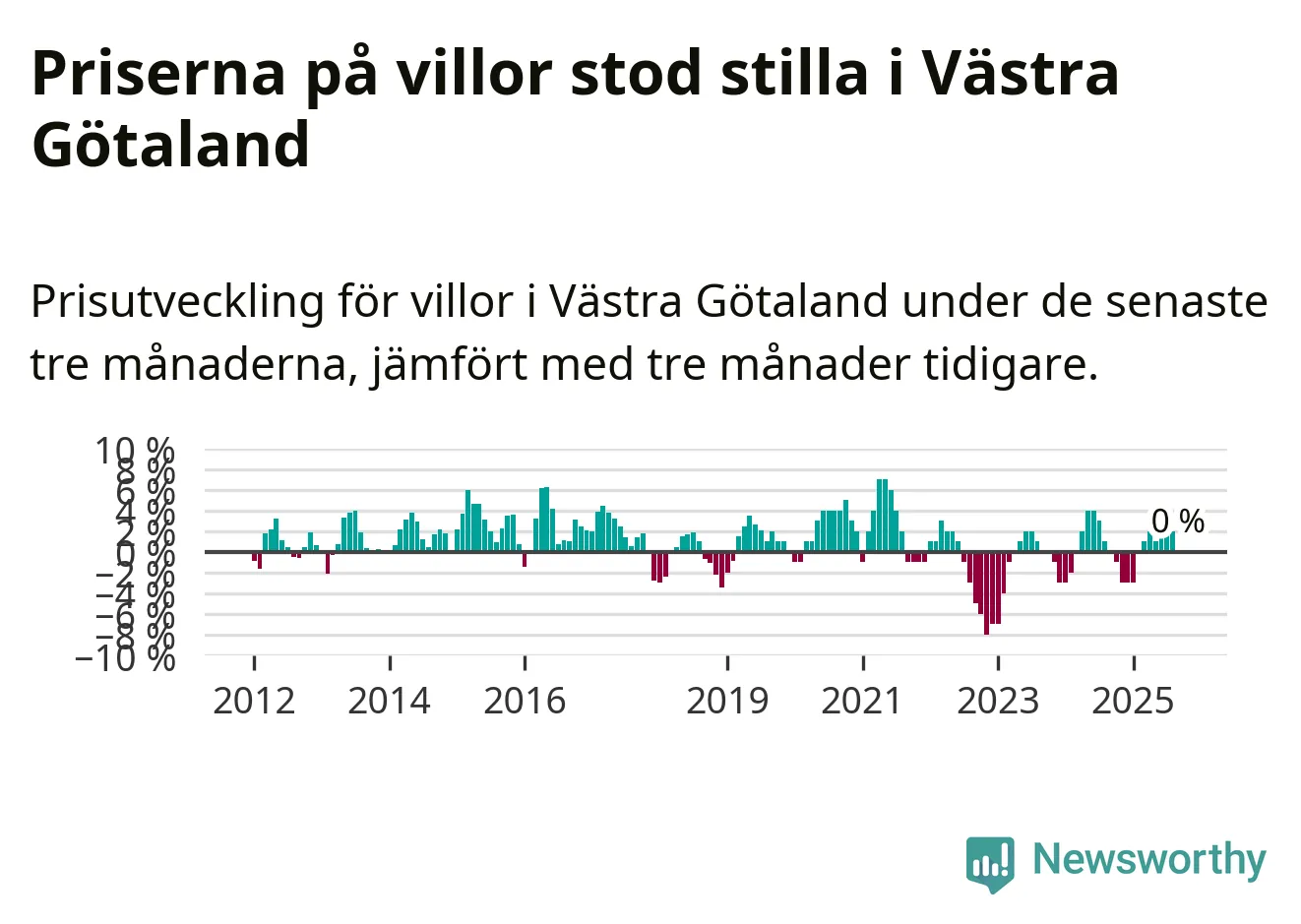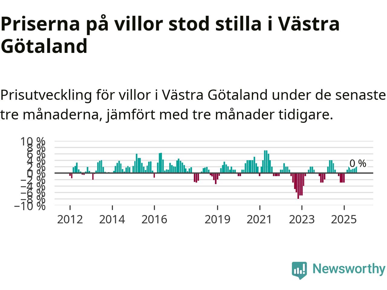 Villapriserna står i stort sett stilla i Västra Götalands län. Medelpriset på de på försäljningarna under de senaste tre månaderna låg på samma nivå som för tre månader sedan.