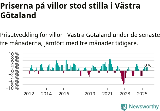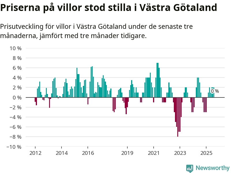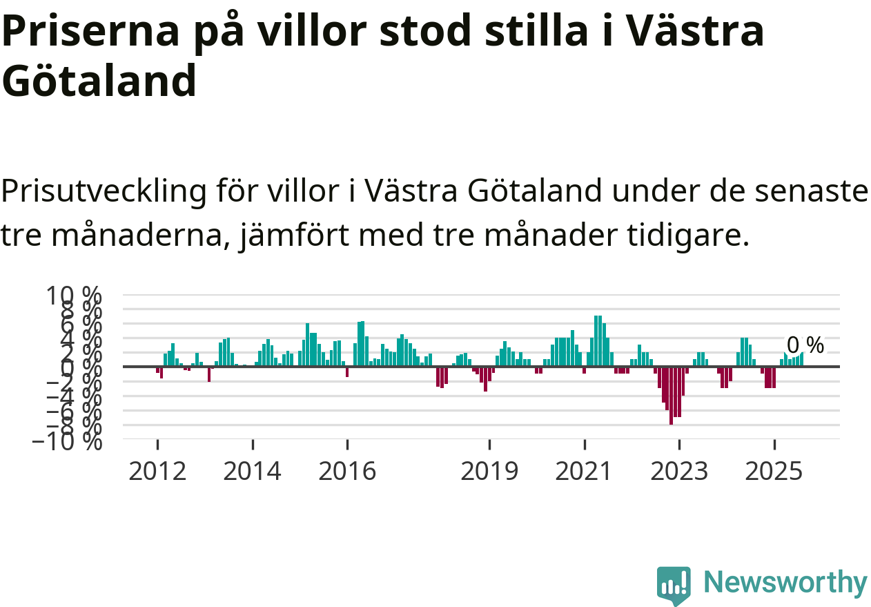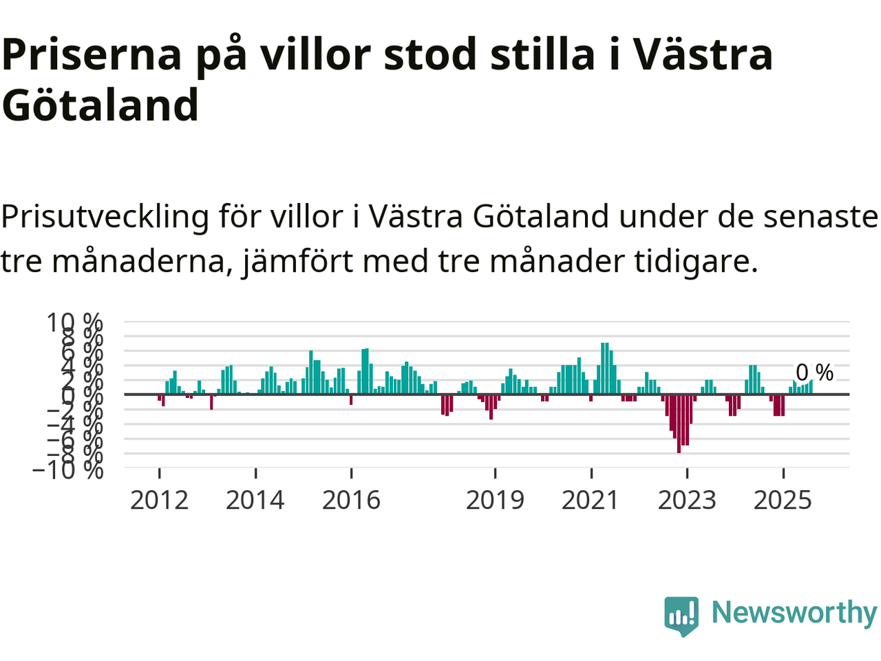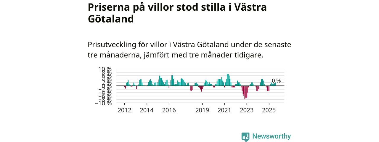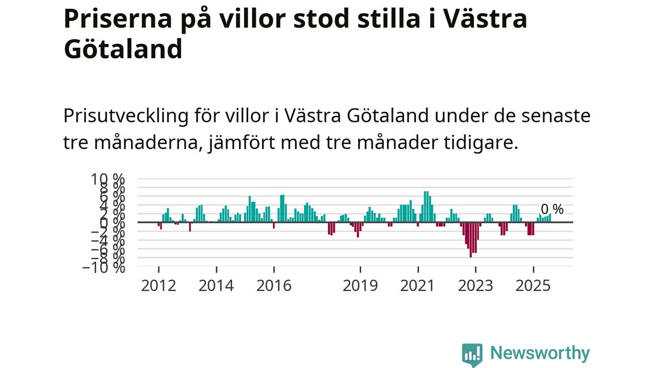 Villapriserna står i stort sett stilla i Västra Götalands län. Medelpriset på de på försäljningarna under de senaste tre månaderna låg på samma nivå som för tre månader sedan.