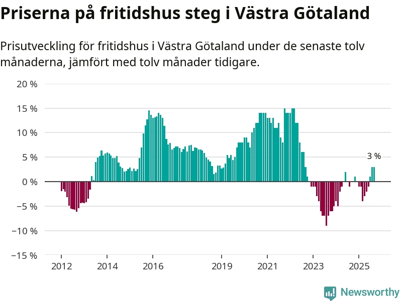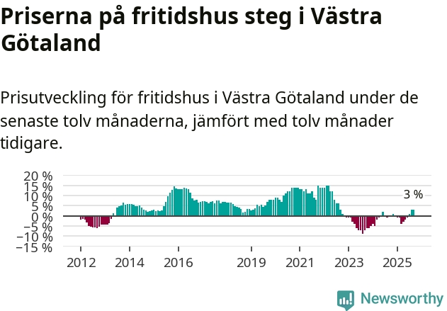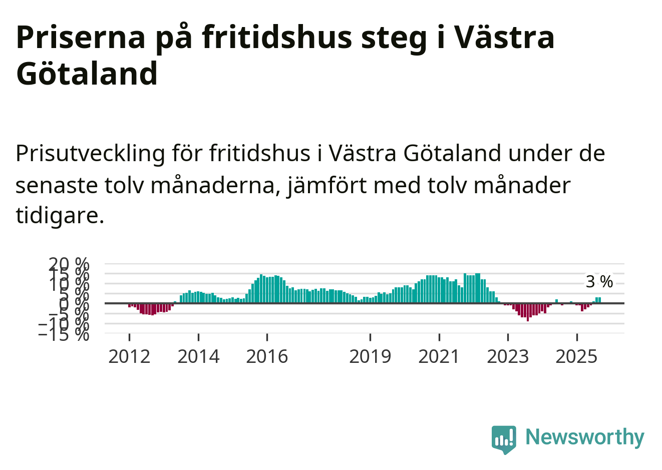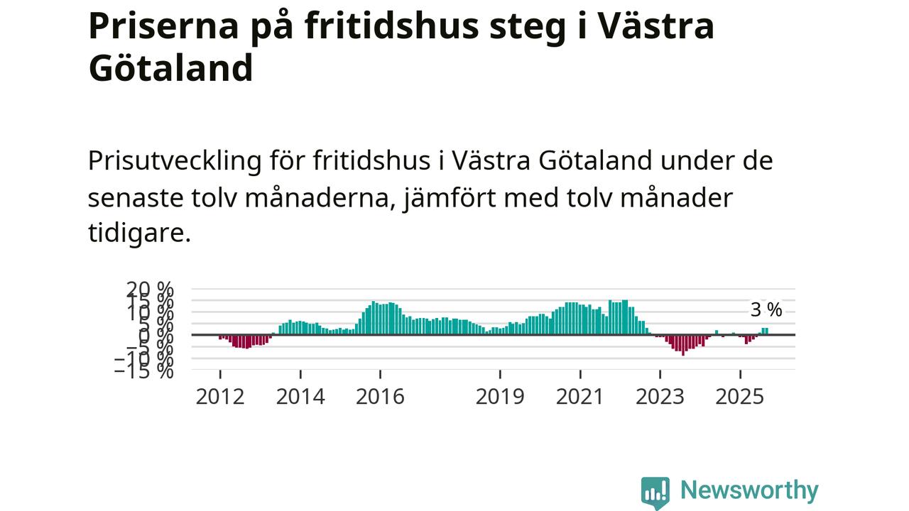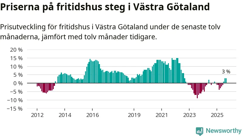 Priserna på fritidshus har gått upp i Västra Götalands län. Medelpriset på försäljningarna under de senaste tolv månaderna visar på en uppgång med 3 procent.