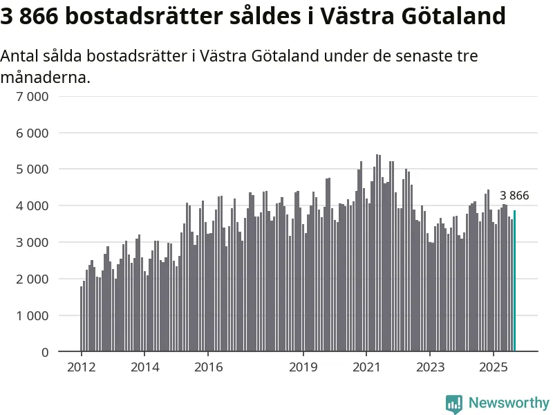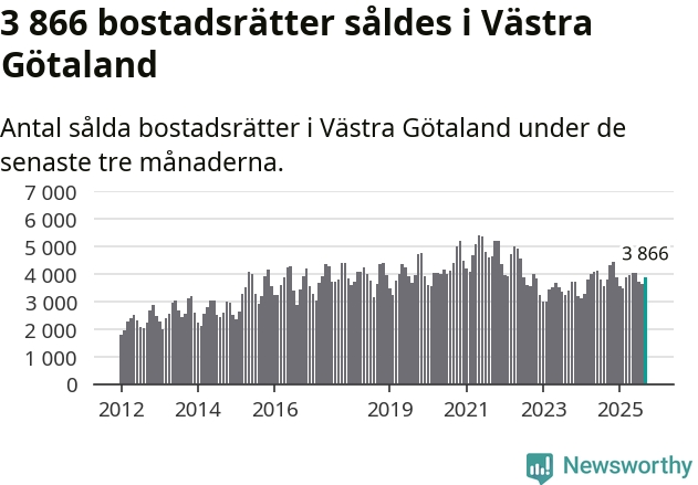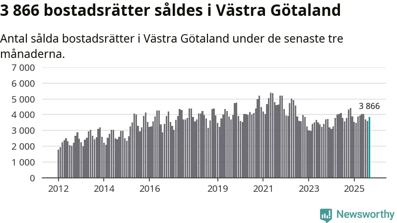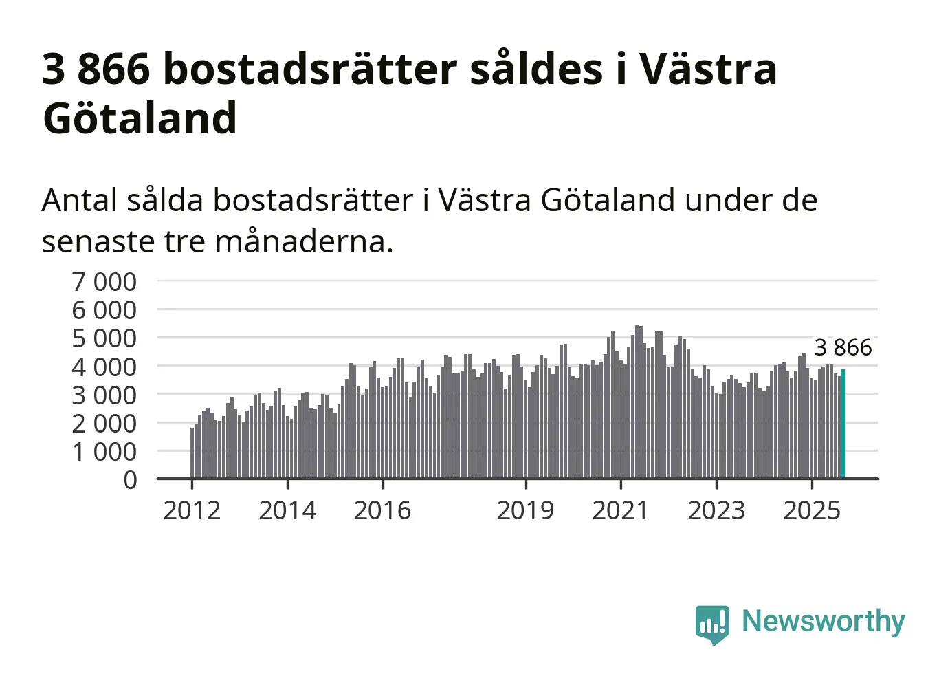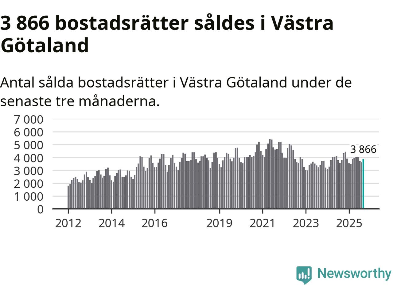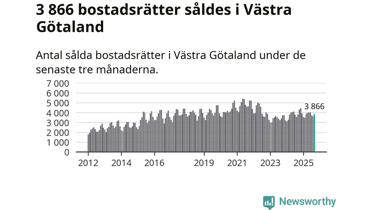 Sammanlagt såldes 3 866 bostadsrätter i Västra Götalands län mellan juli och september till ett genomsnittligt pris på 2,5 miljoner kronor. I fjol gjordes 3 810 affärer vid den här tiden på året.