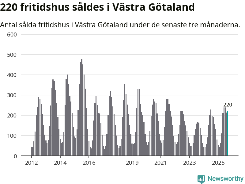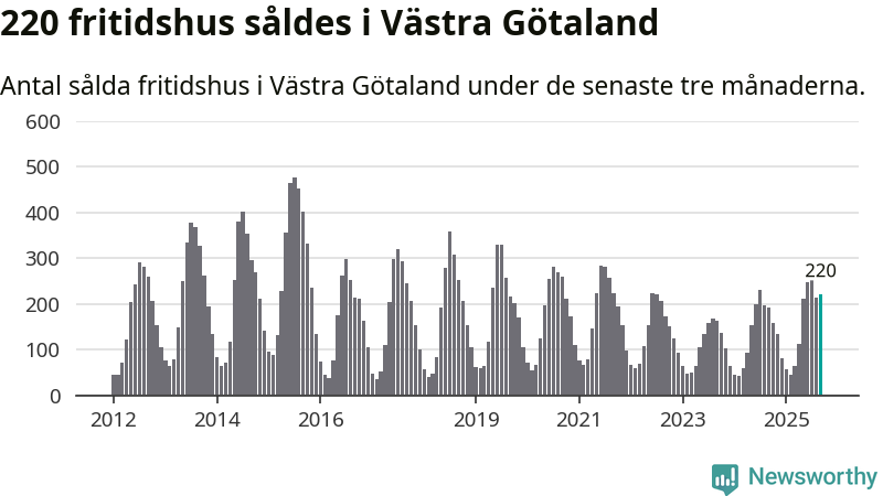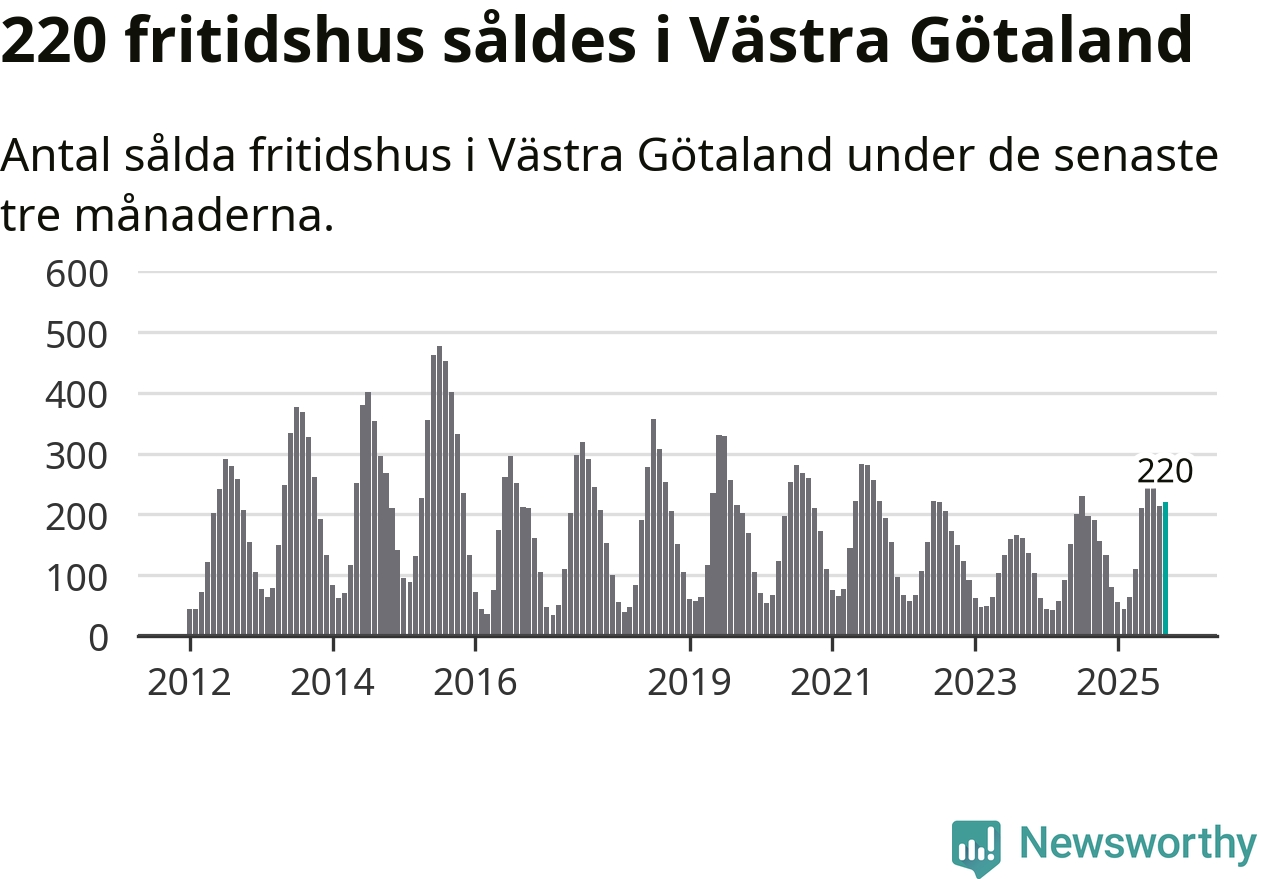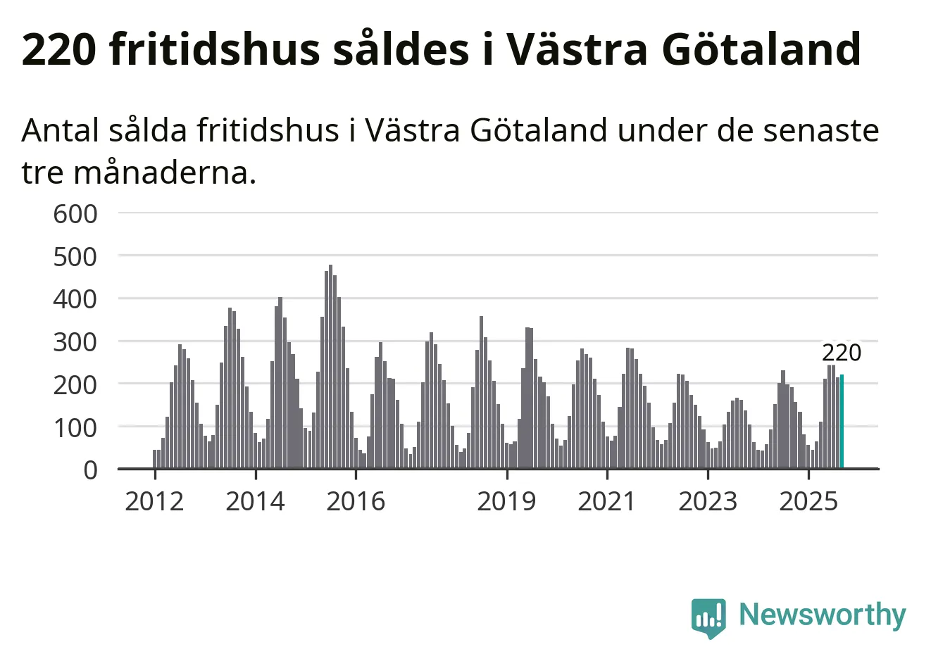 Sammanlagt såldes 220 fritidshus i Västra Götalands län mellan juli och september till ett genomsnittligt pris på 3,0 miljoner kronor. I fjol gjordes 191 affärer vid den här tiden på året.