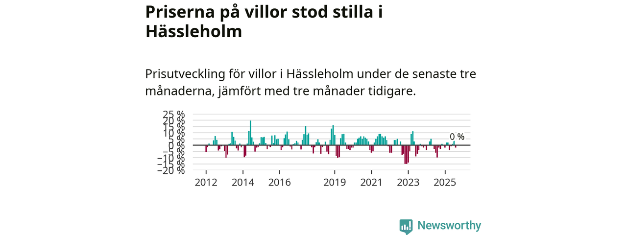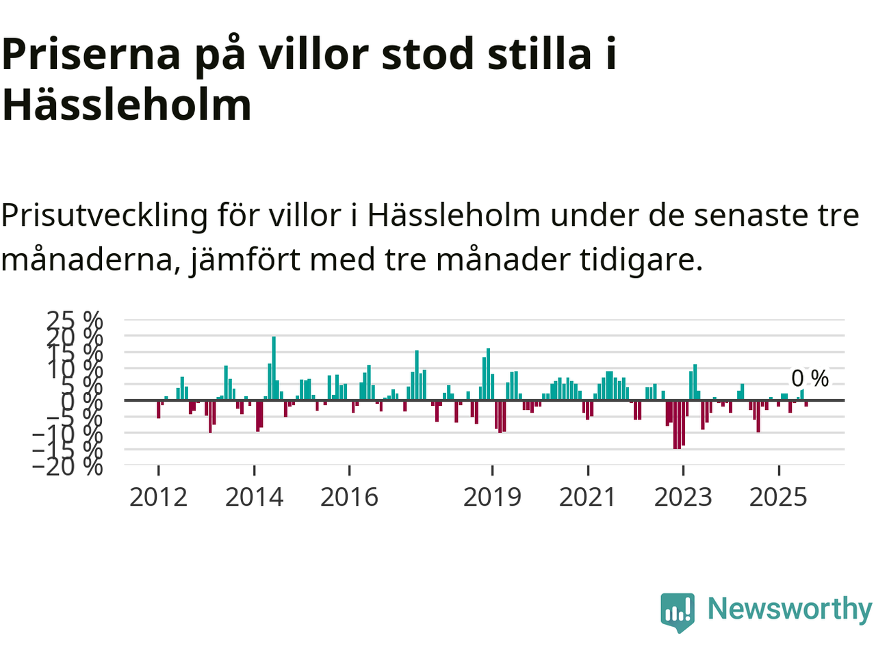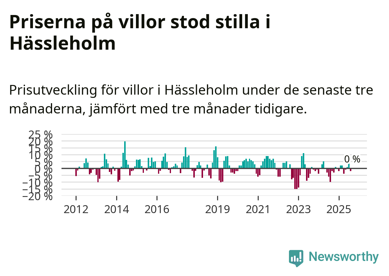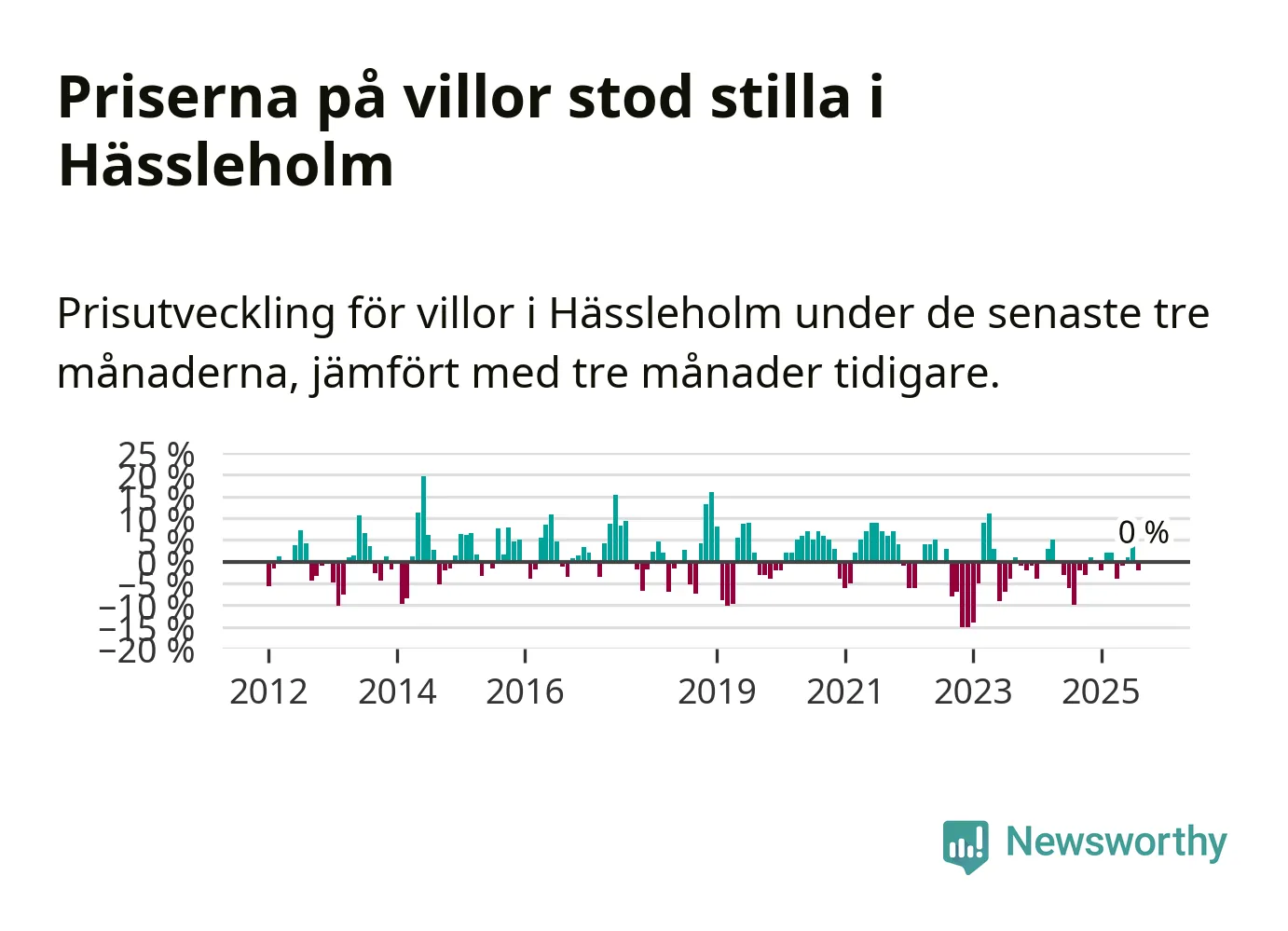 Villapriserna står i stort sett stilla i Hässleholms kommun. Medelpriset på de på försäljningarna under de senaste tre månaderna låg på samma nivå som för tre månader sedan.