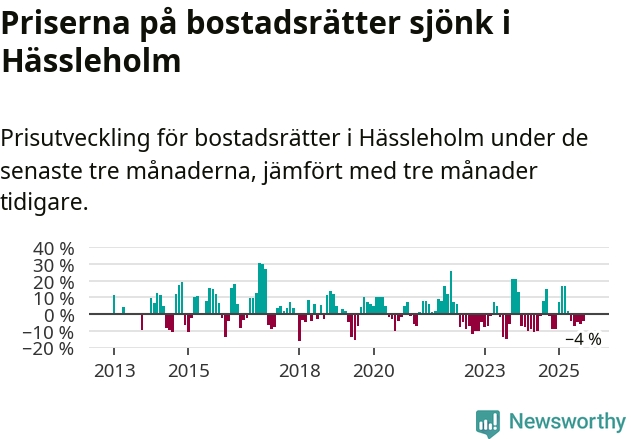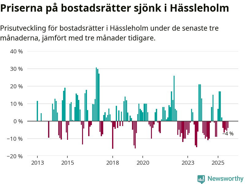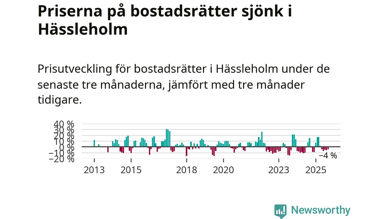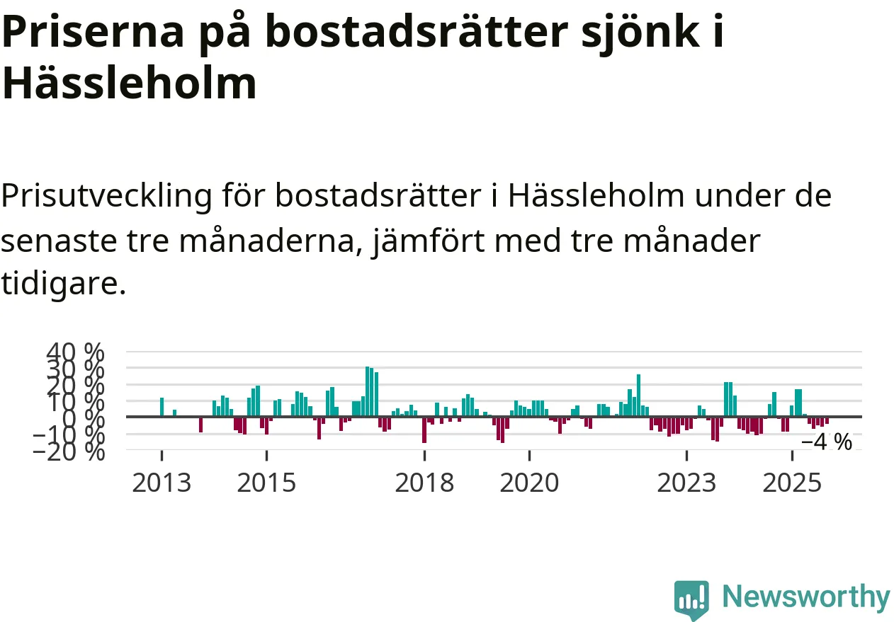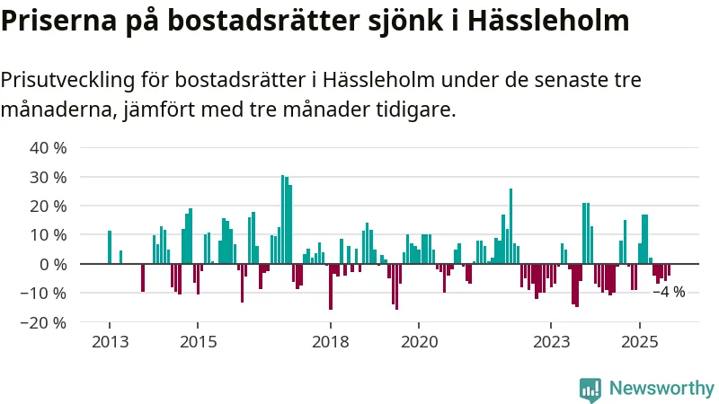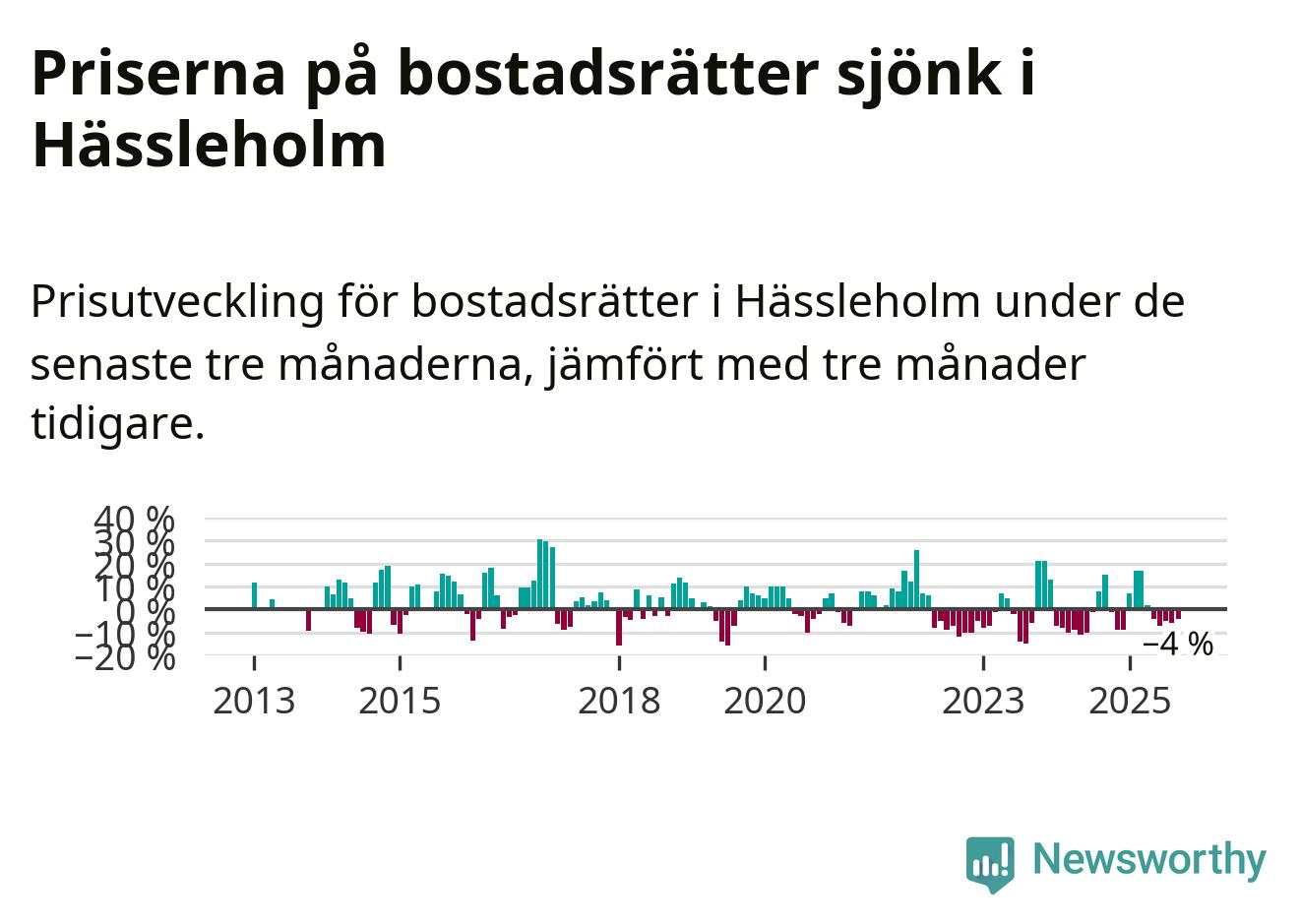 Statistiken visar även på en kännbar prisnedgång i Hässleholms kommun. Medelpriset på försäljningarna av bostadsrätter i kommunen var 4 procent lägre än för tre månader sedan. I hela Skåne däremot ligger priserna på bostadsrätter stilla.