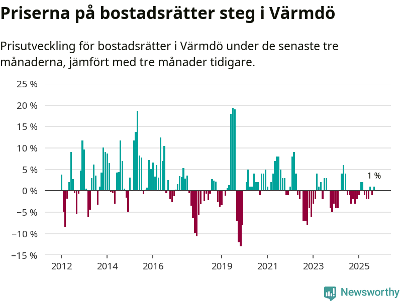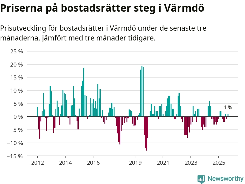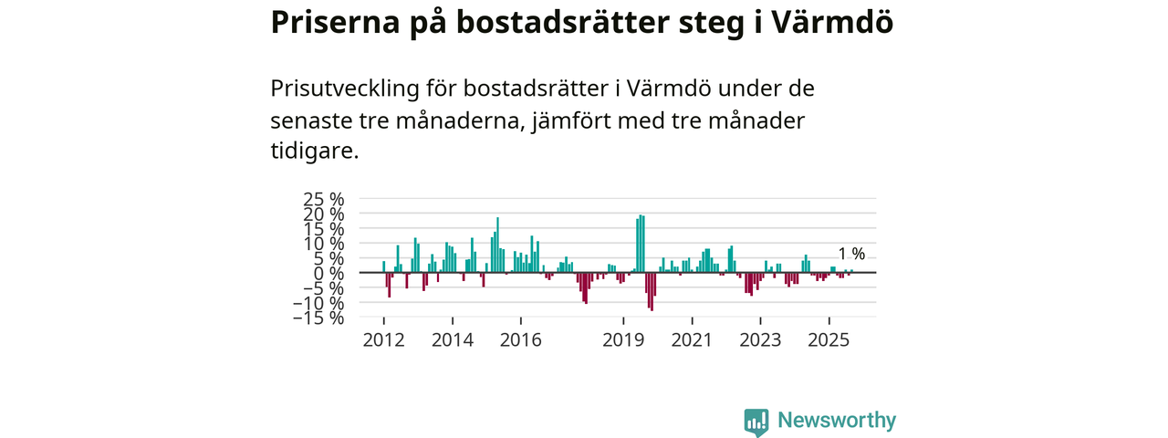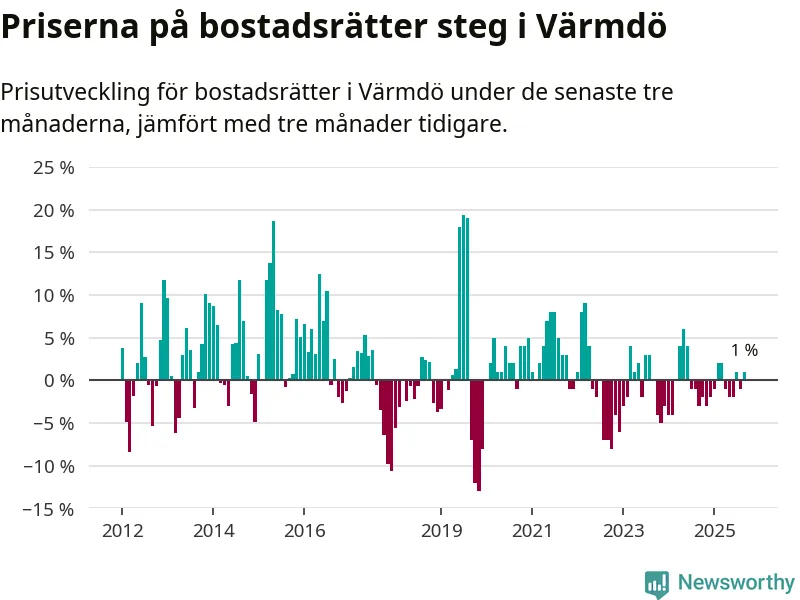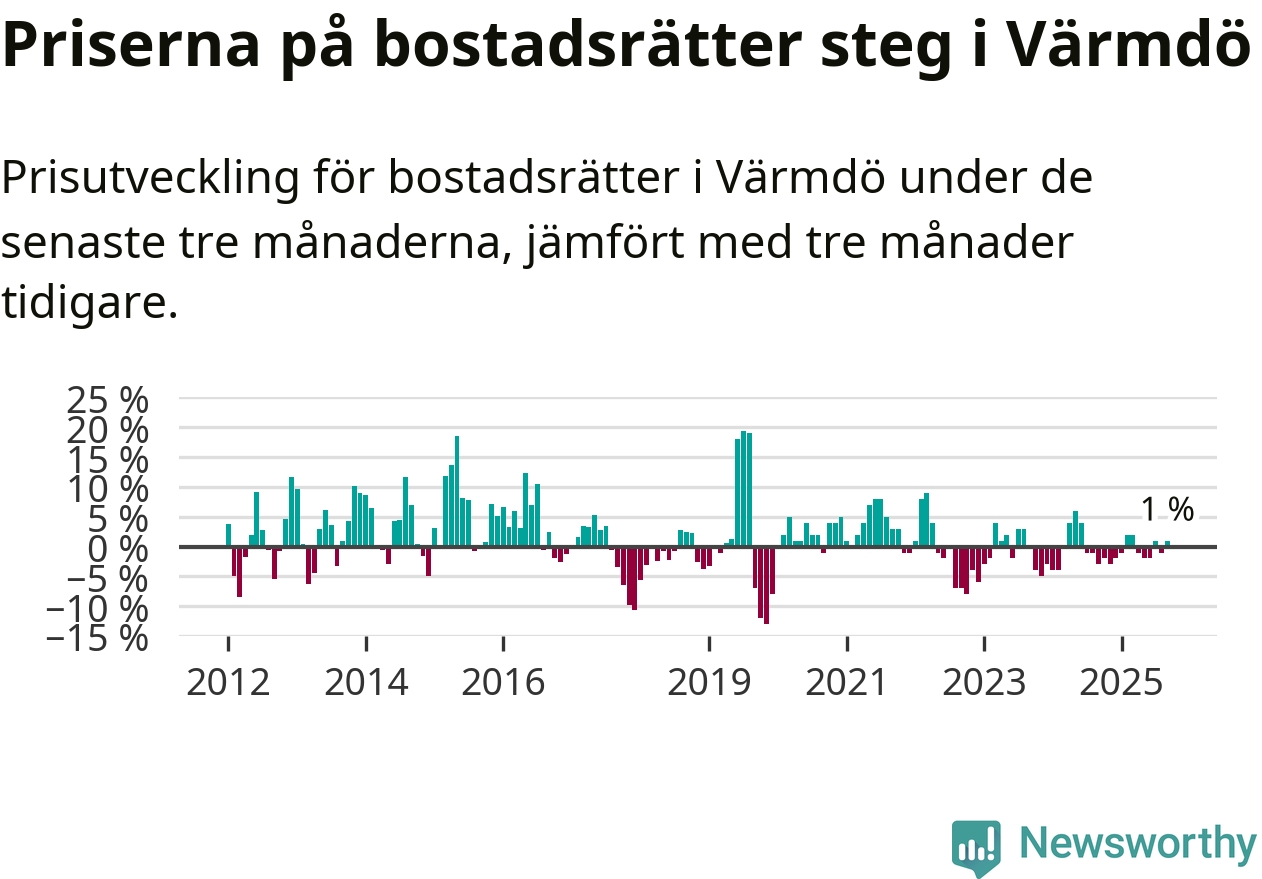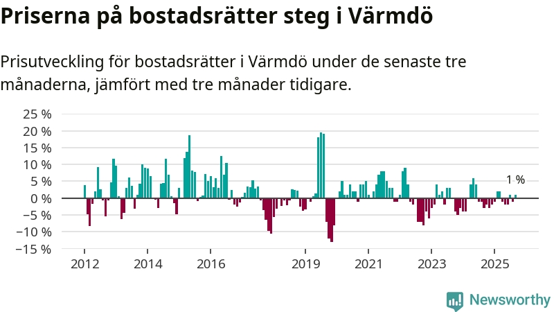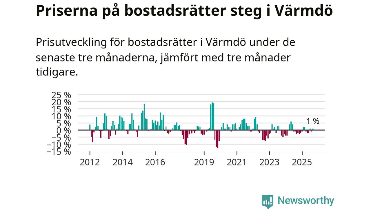 Priserna på bostadsrätter har gått upp i Värmdö kommun. Medelpriset på försäljningarna under de senaste tre månaderna visar på en uppgång med 1 procent.