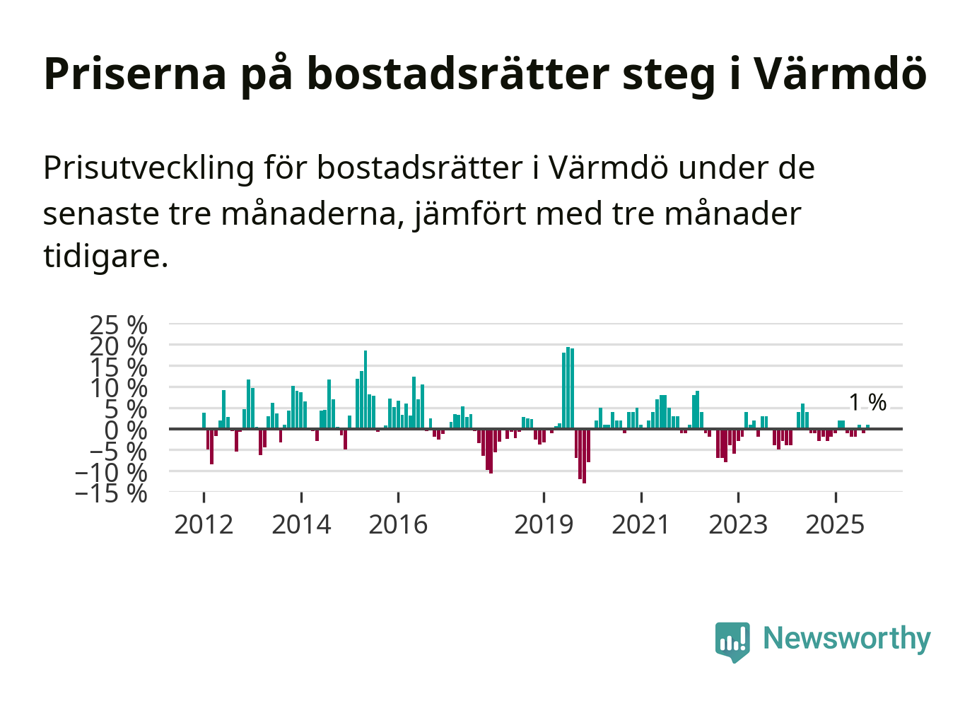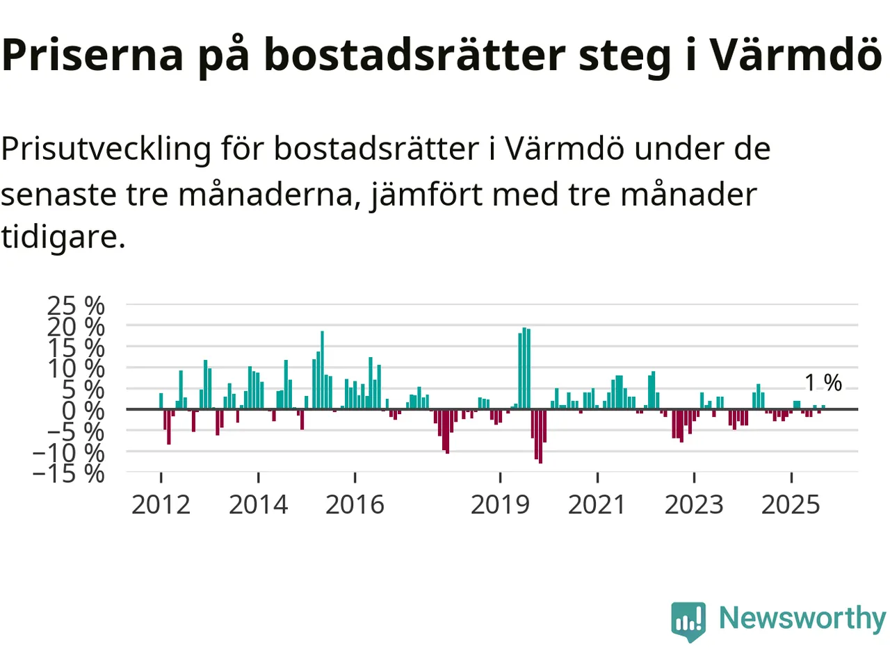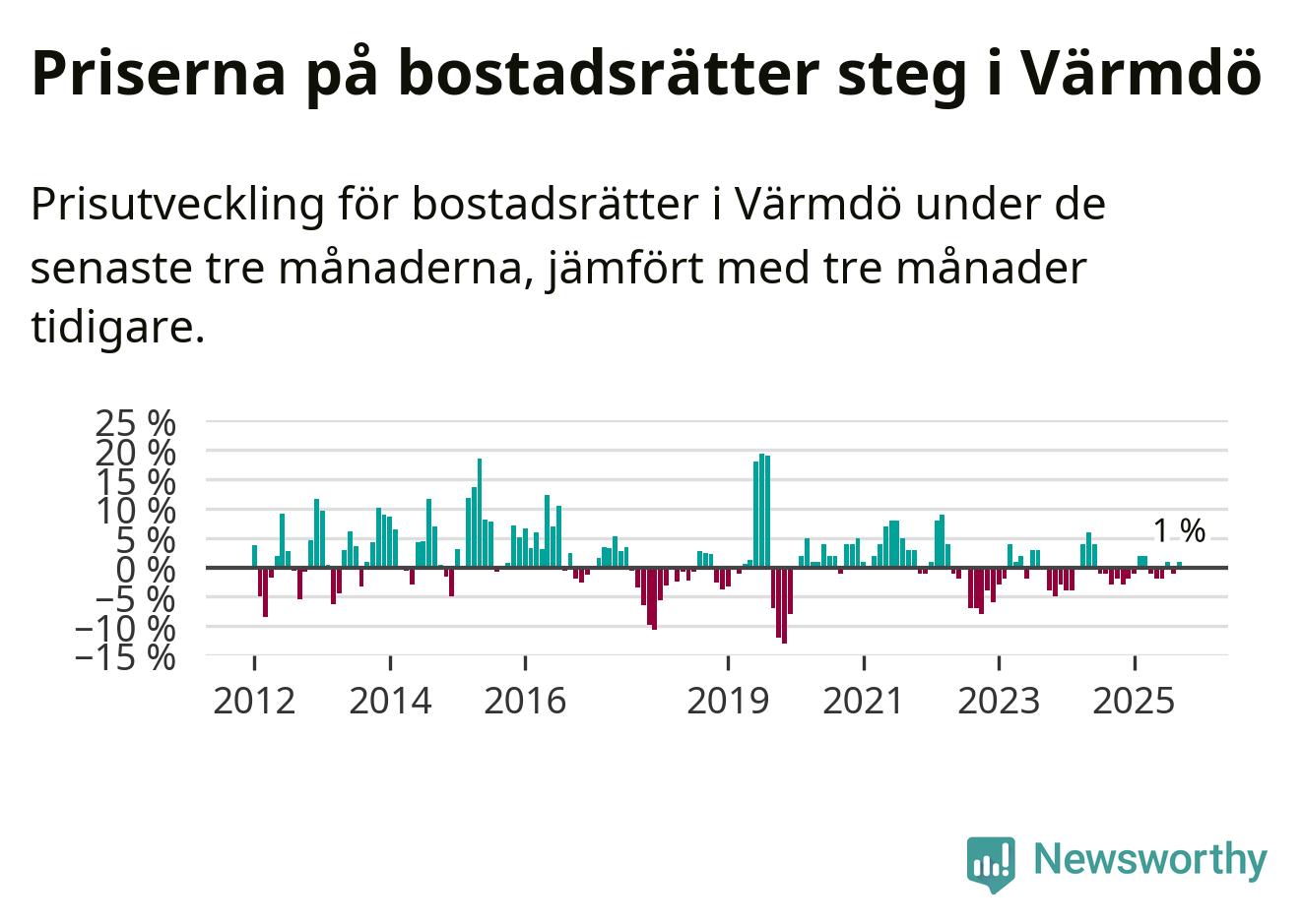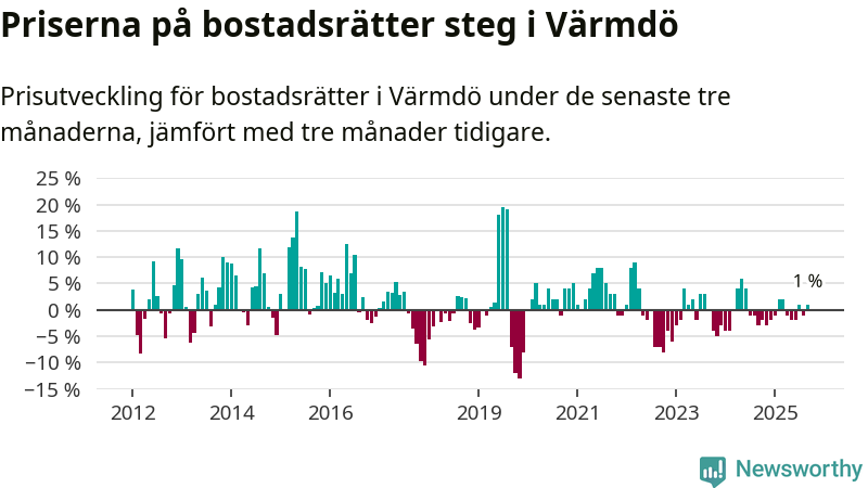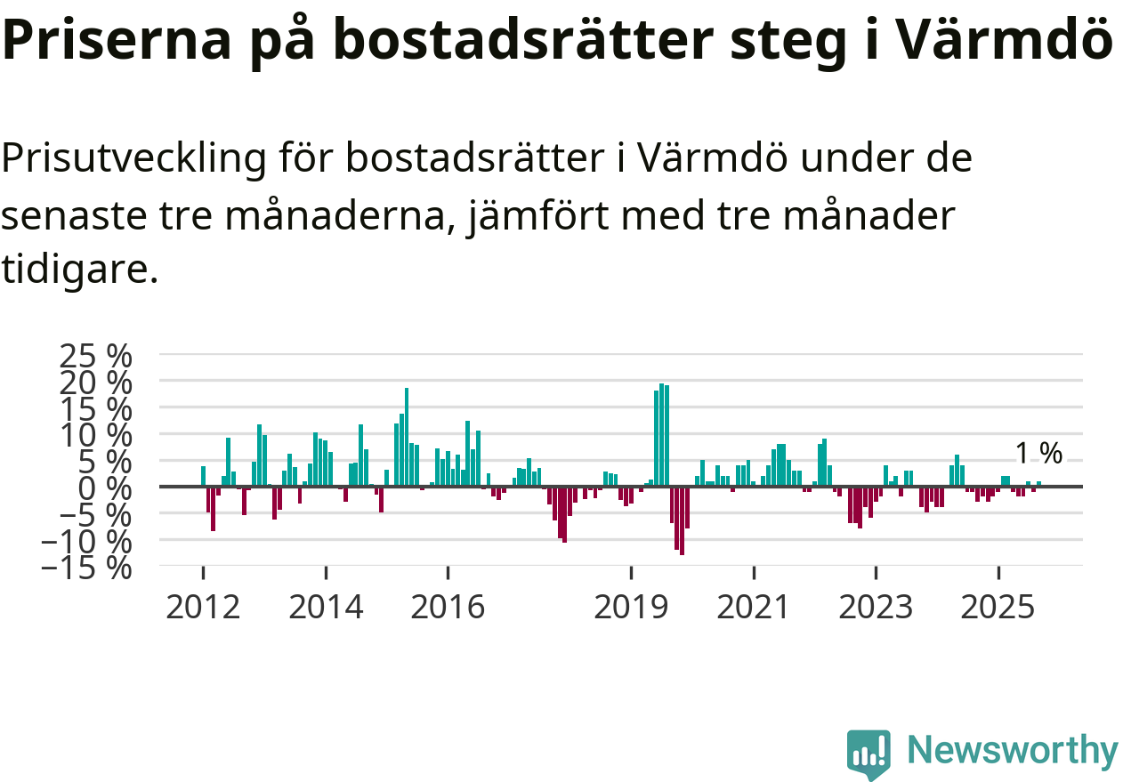 Priserna på bostadsrätter har gått upp i Värmdö kommun. Medelpriset på försäljningarna under de senaste tre månaderna visar på en uppgång med 1 procent.