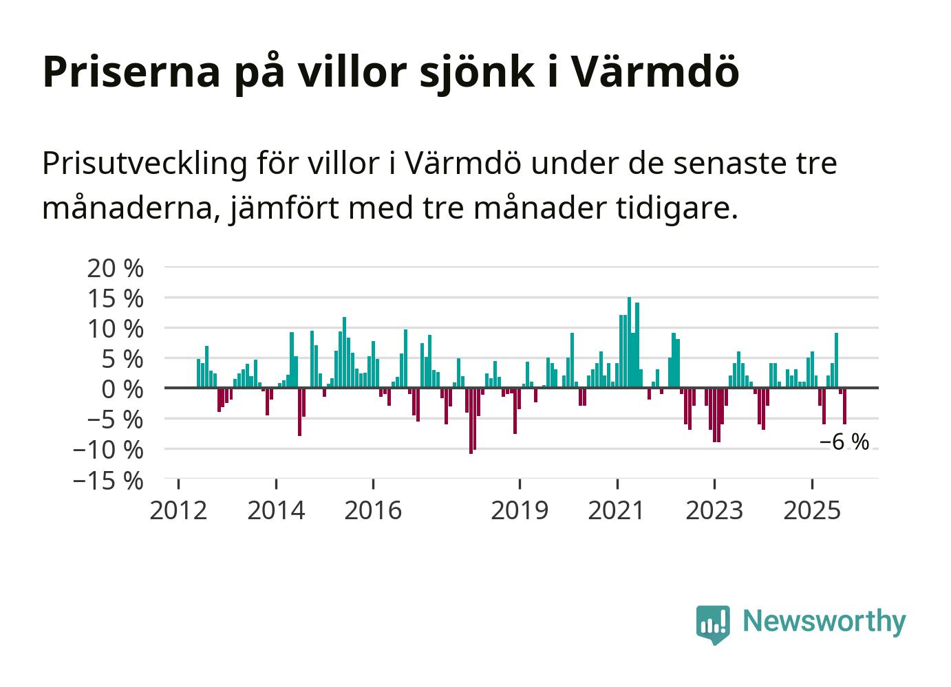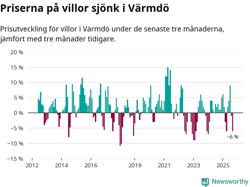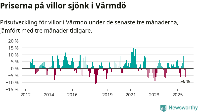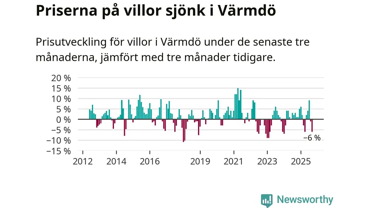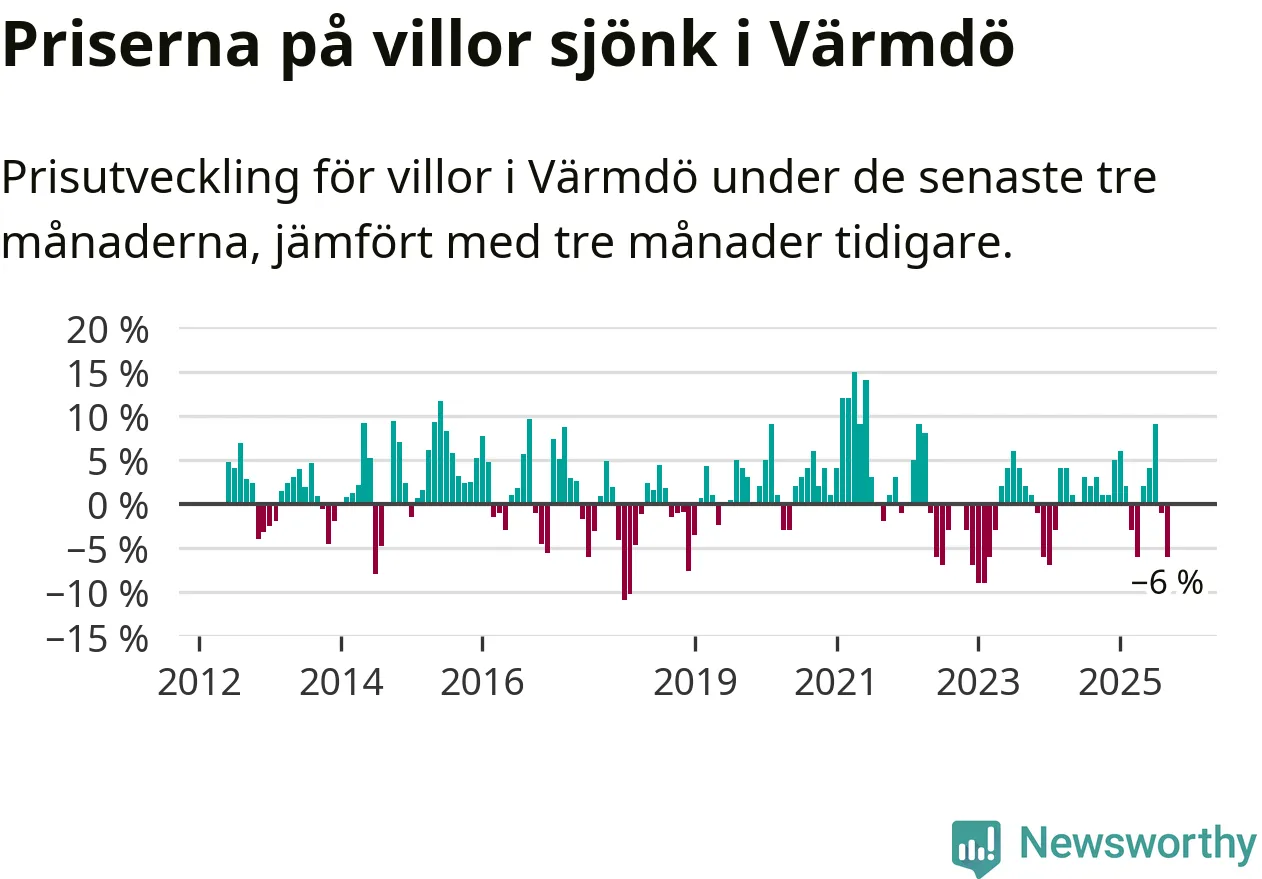 Villapriserna sjönk mellan juli och september med 6 procent i Värmdö kommun. Det är en betydande nedgång jämfört med det gångna året då priserna i snitt ökat med 1 procent.