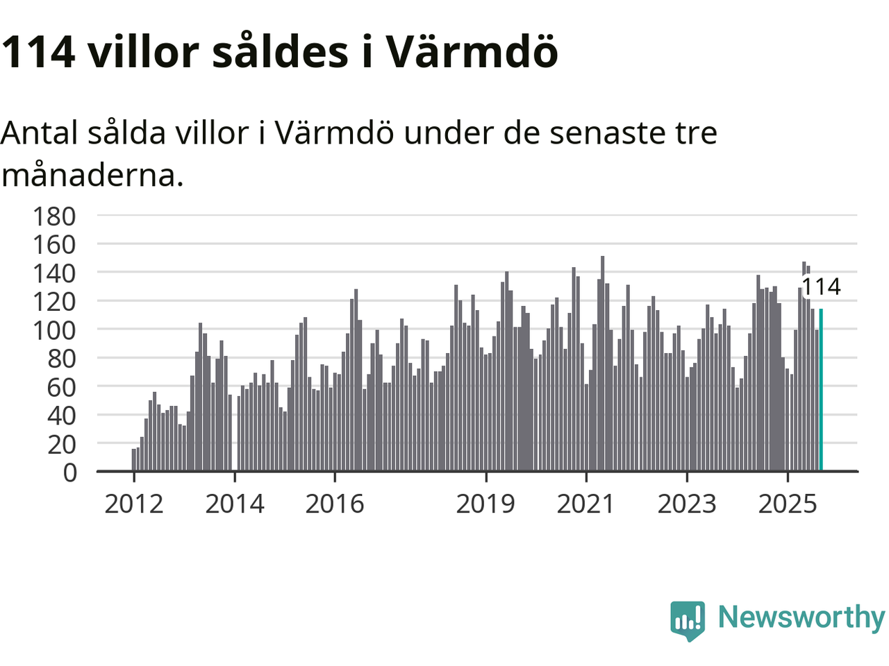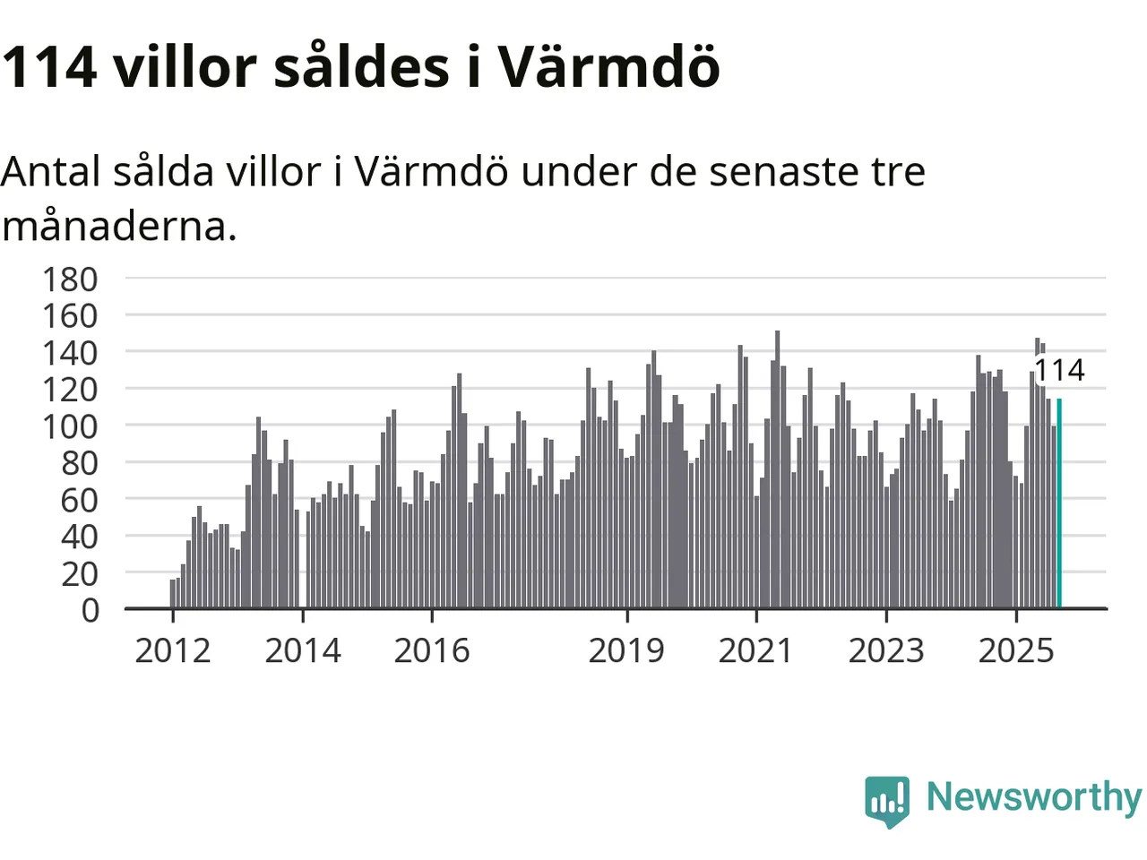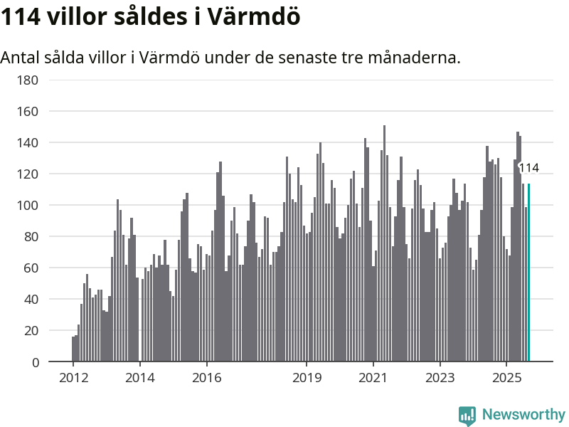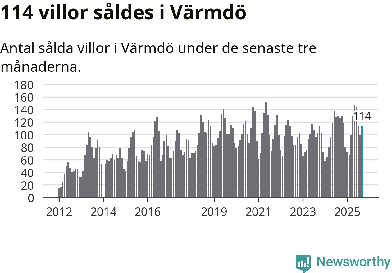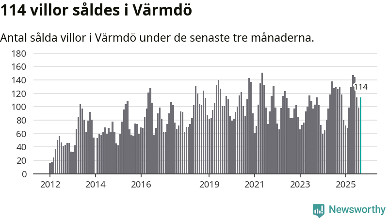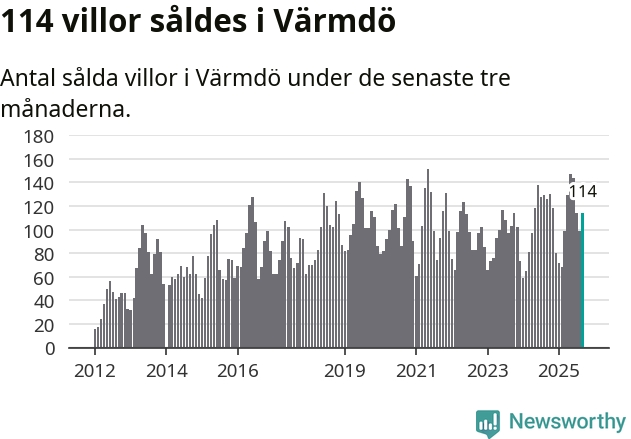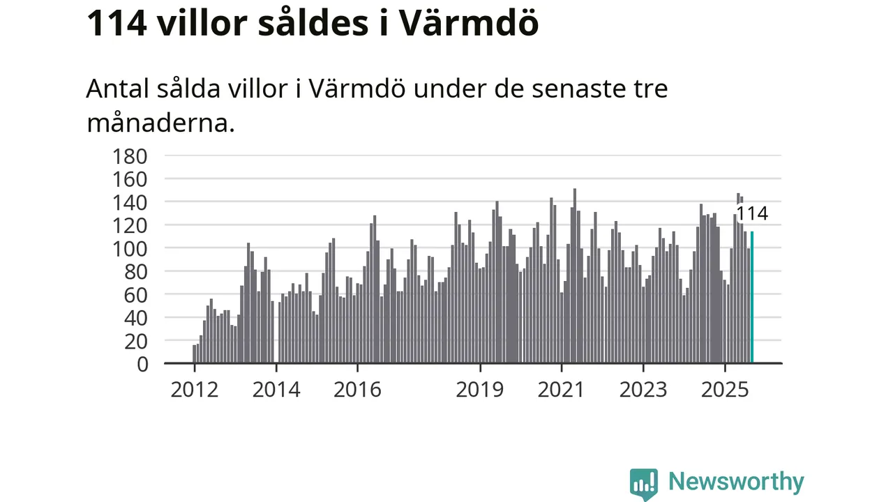Sammanlagt såldes 114 villor i Värmdö kommun mellan juli och september till ett genomsnittligt pris på 6,7 miljoner kronor. I fjol gjordes 126 affärer vid den här tiden på året.