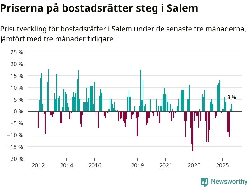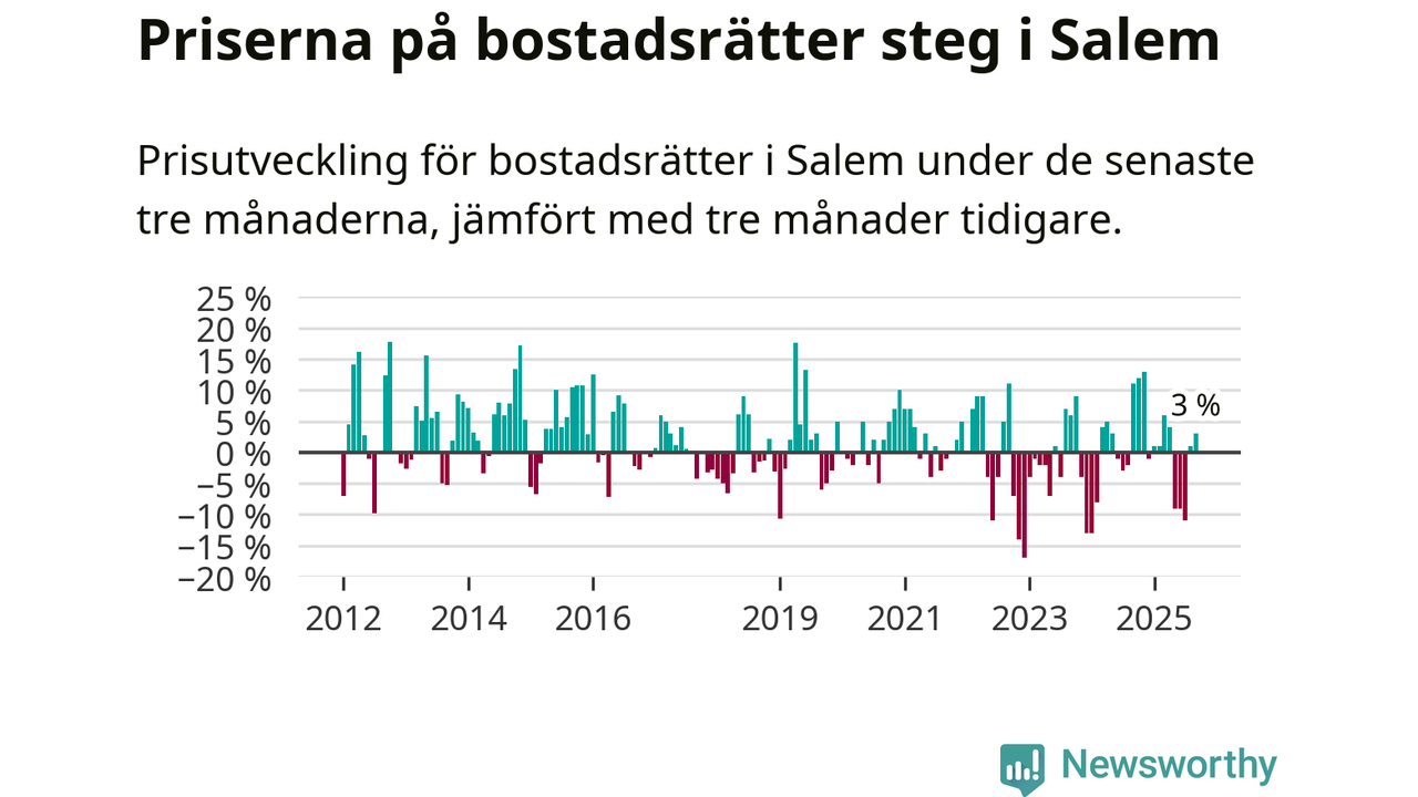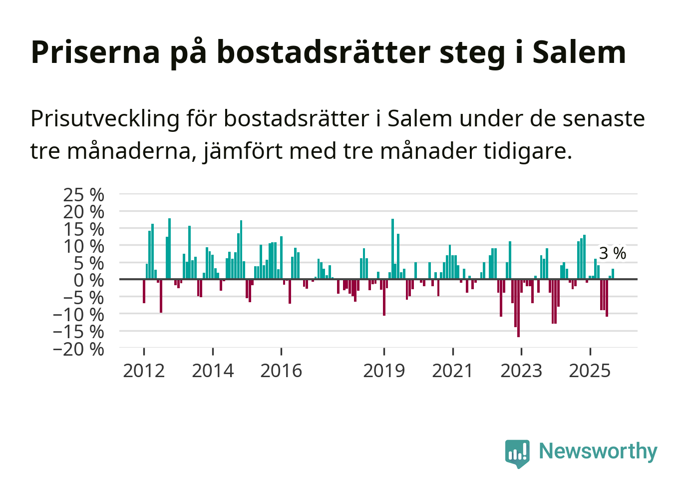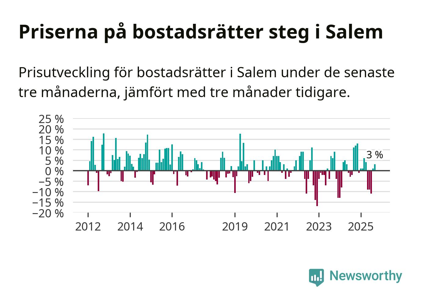 Statistiken visar även på en prisuppgång i Salems kommun. Medelpriset på försäljningarna av bostadsrätter i kommunen var 3 procent högre än för tre månader sedan. I hela Stockholms län däremot sjunker priserna på bostadsrätter. I hela länet noterades en prisnedgång på 2 procent.