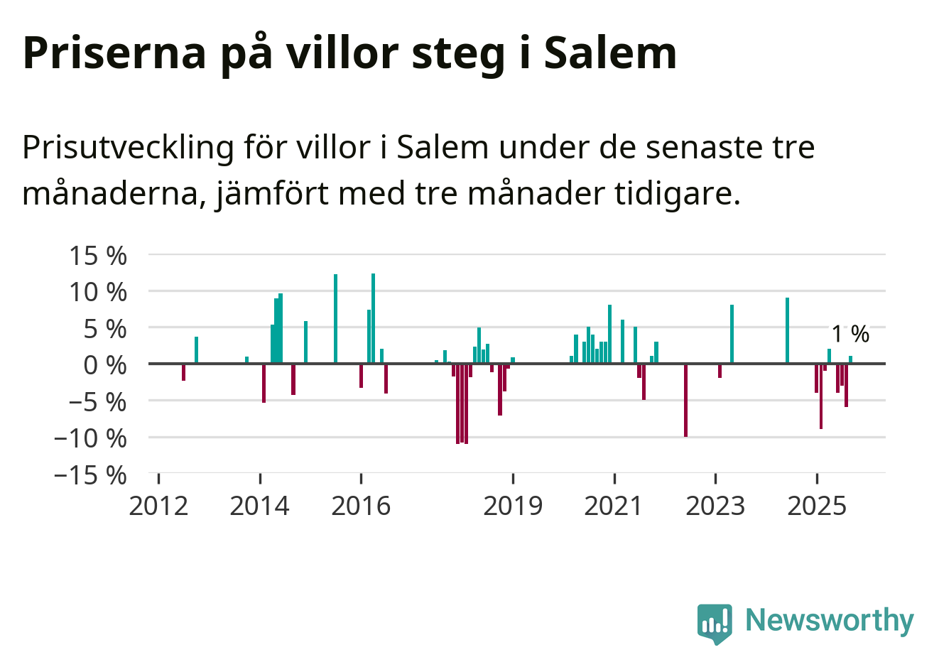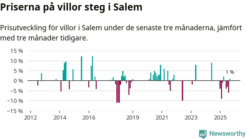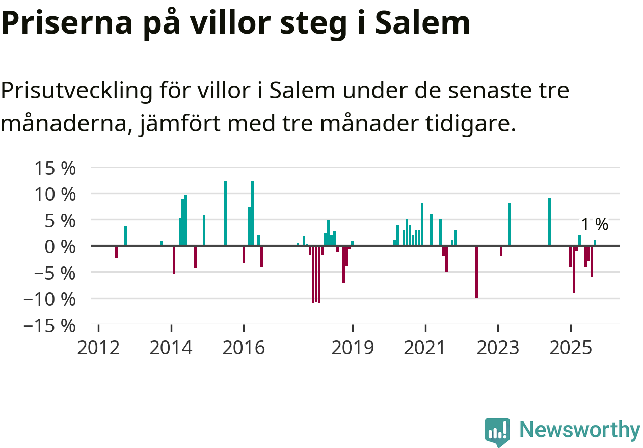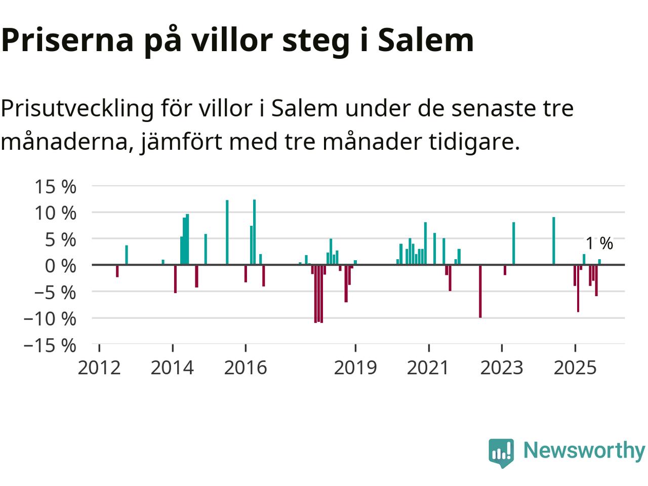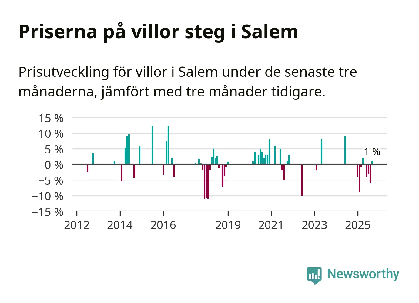 Statistiken visar även på en prisuppgång i Salems kommun. Medelpriset på försäljningarna av villor i kommunen var 1 procent högre än för tre månader sedan. I hela Stockholms län däremot sjunker villapriserna. I hela länet noterades en prisnedgång på 1 procent.