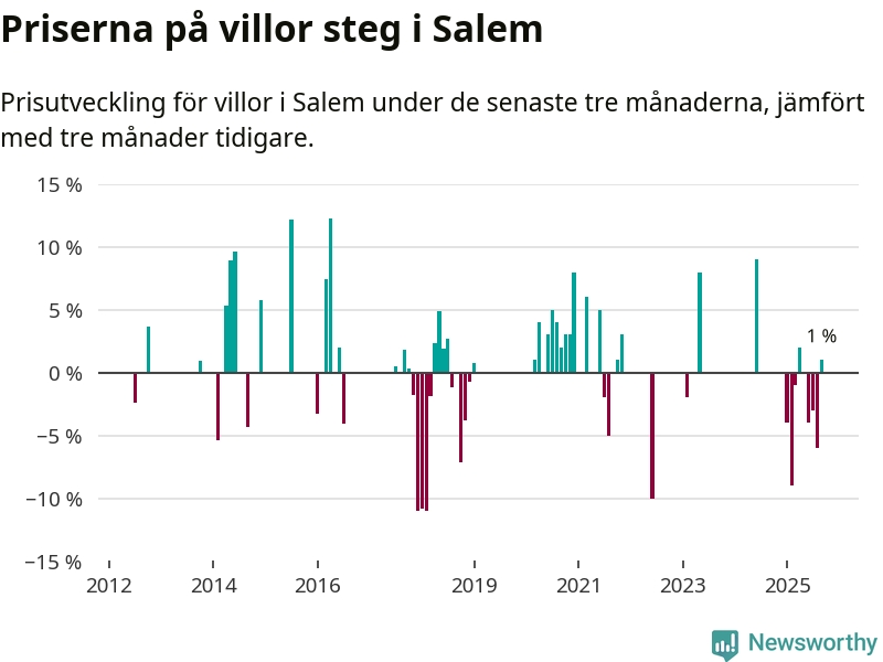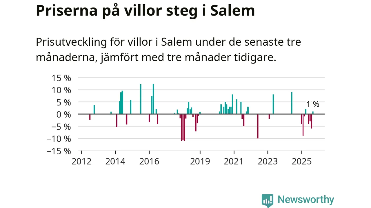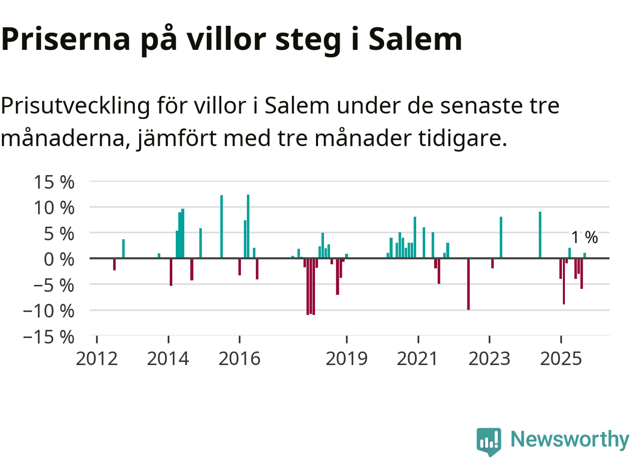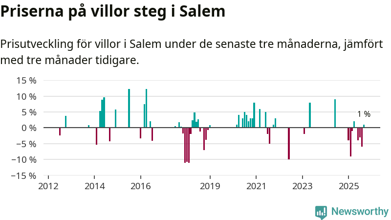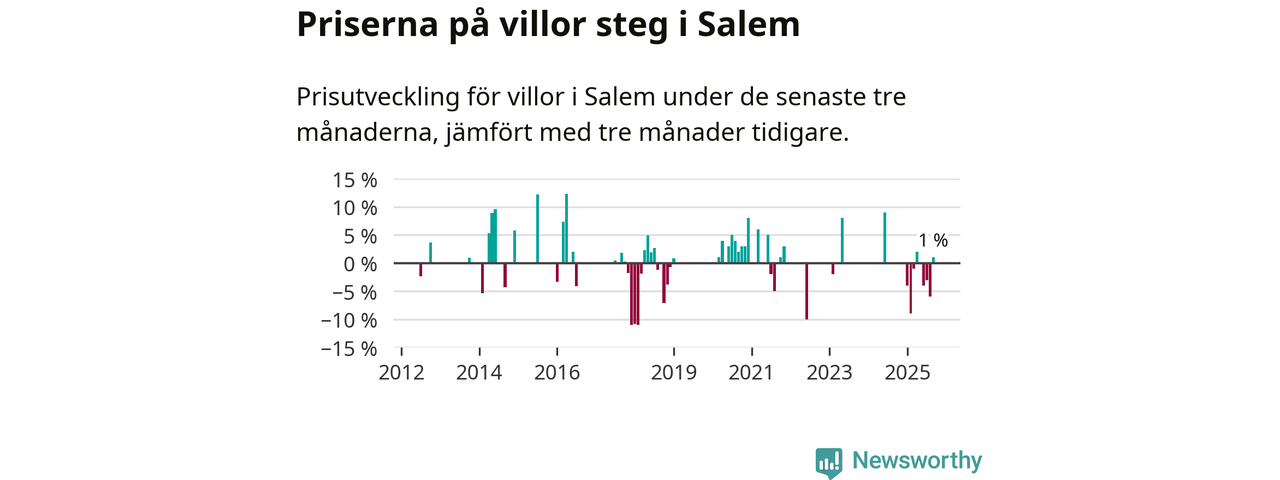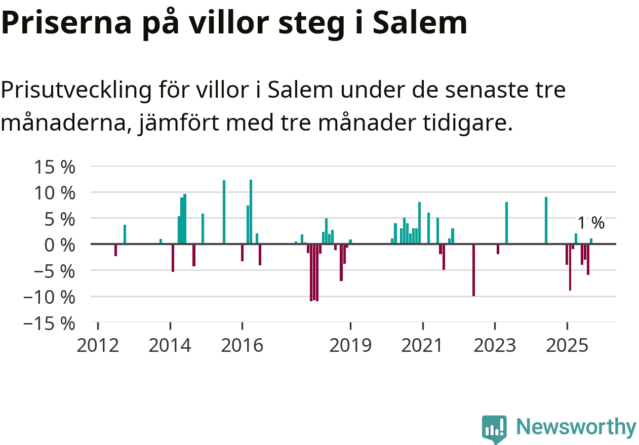 Statistiken visar även på en prisuppgång i Salems kommun. Medelpriset på försäljningarna av villor i kommunen var 1 procent högre än för tre månader sedan. I hela Stockholms län däremot sjunker villapriserna. I hela länet noterades en prisnedgång på 1 procent.