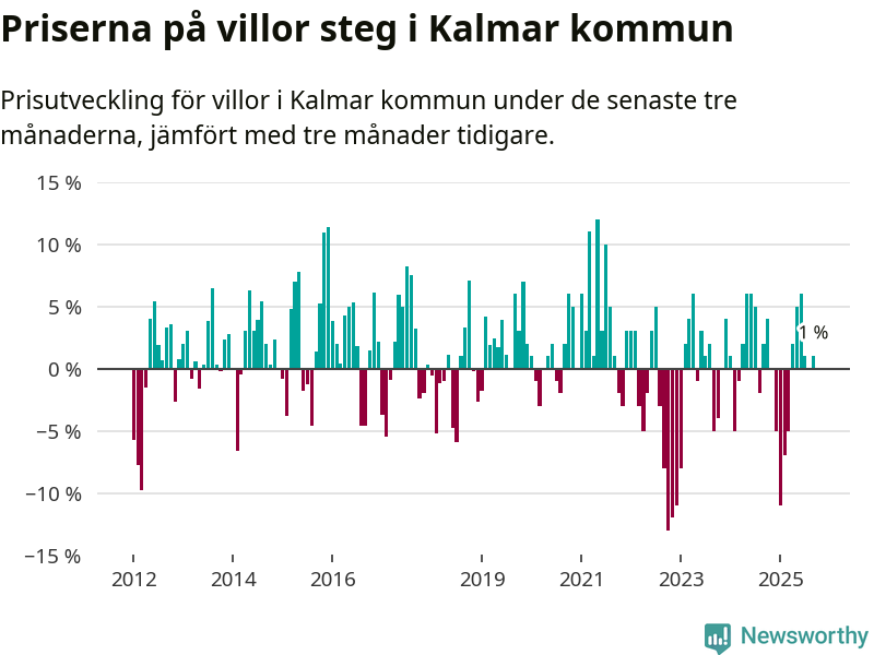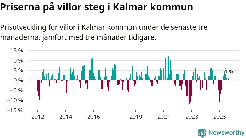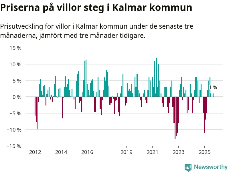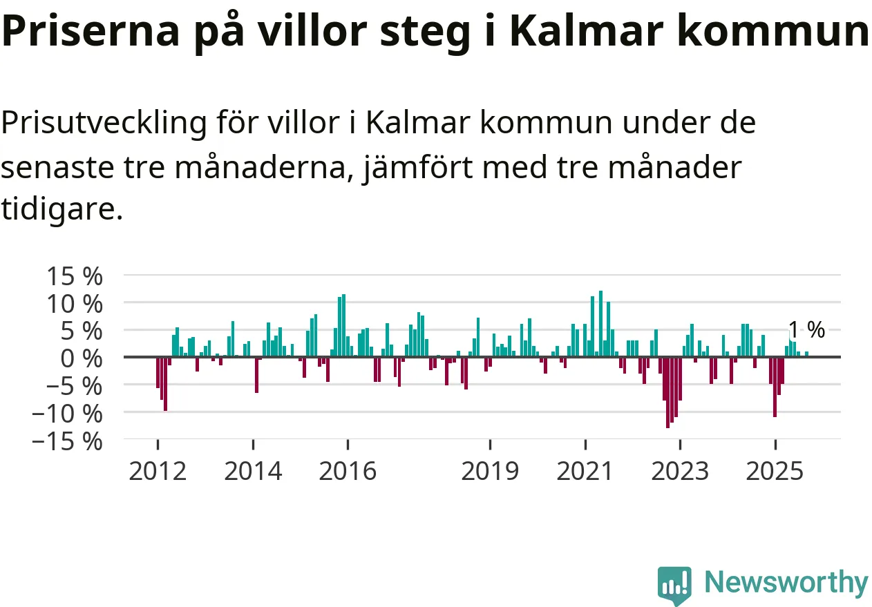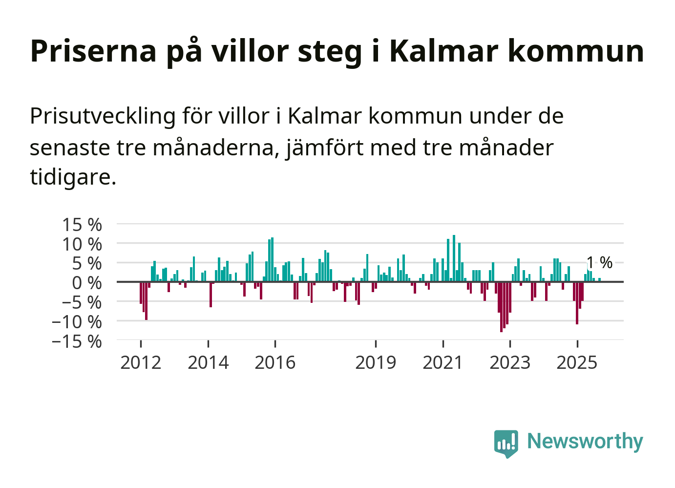 Villapriserna har gått upp i Kalmar kommun. Medelpriset på försäljningarna under de senaste tre månaderna visar på en uppgång med 1 procent.