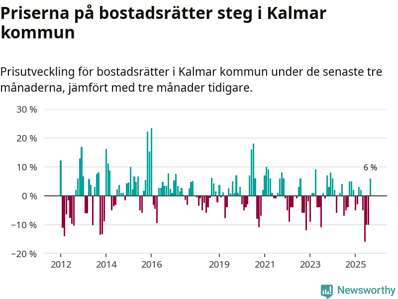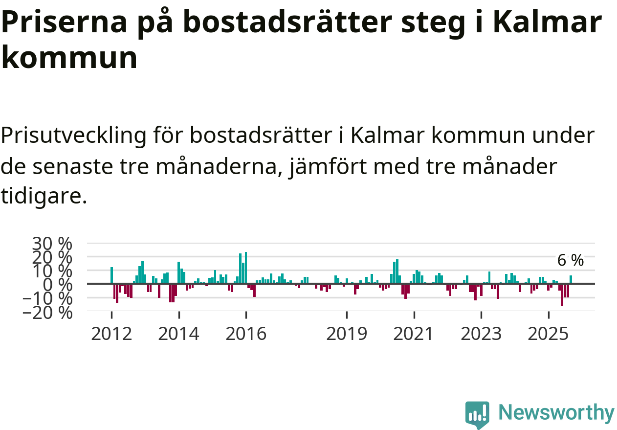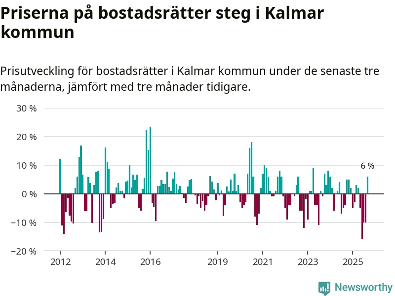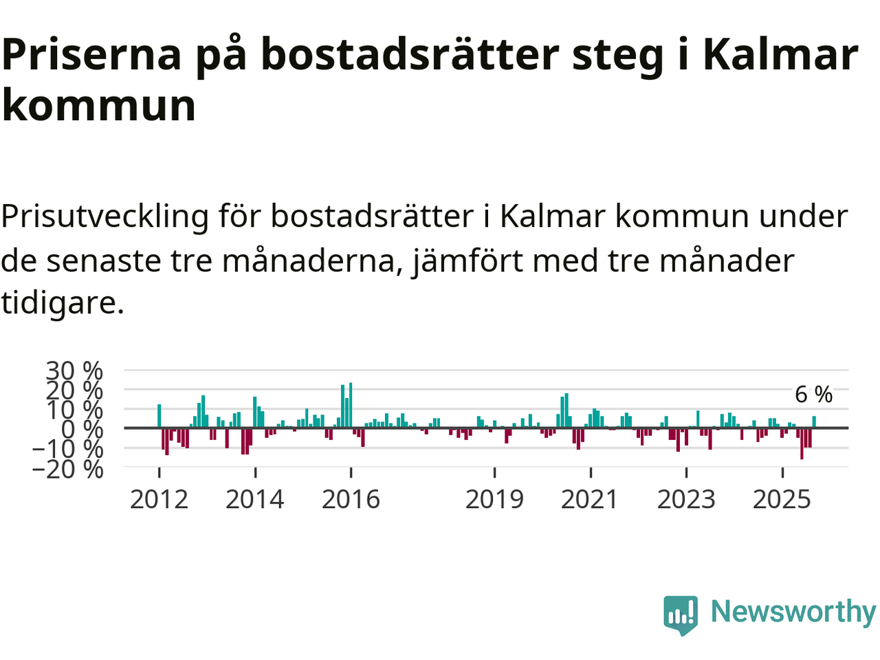 Priserna på bostadsrätter har gått upp i Kalmar kommun. Medelpriset på försäljningarna under de senaste tre månaderna visar på en uppgång med 6 procent.